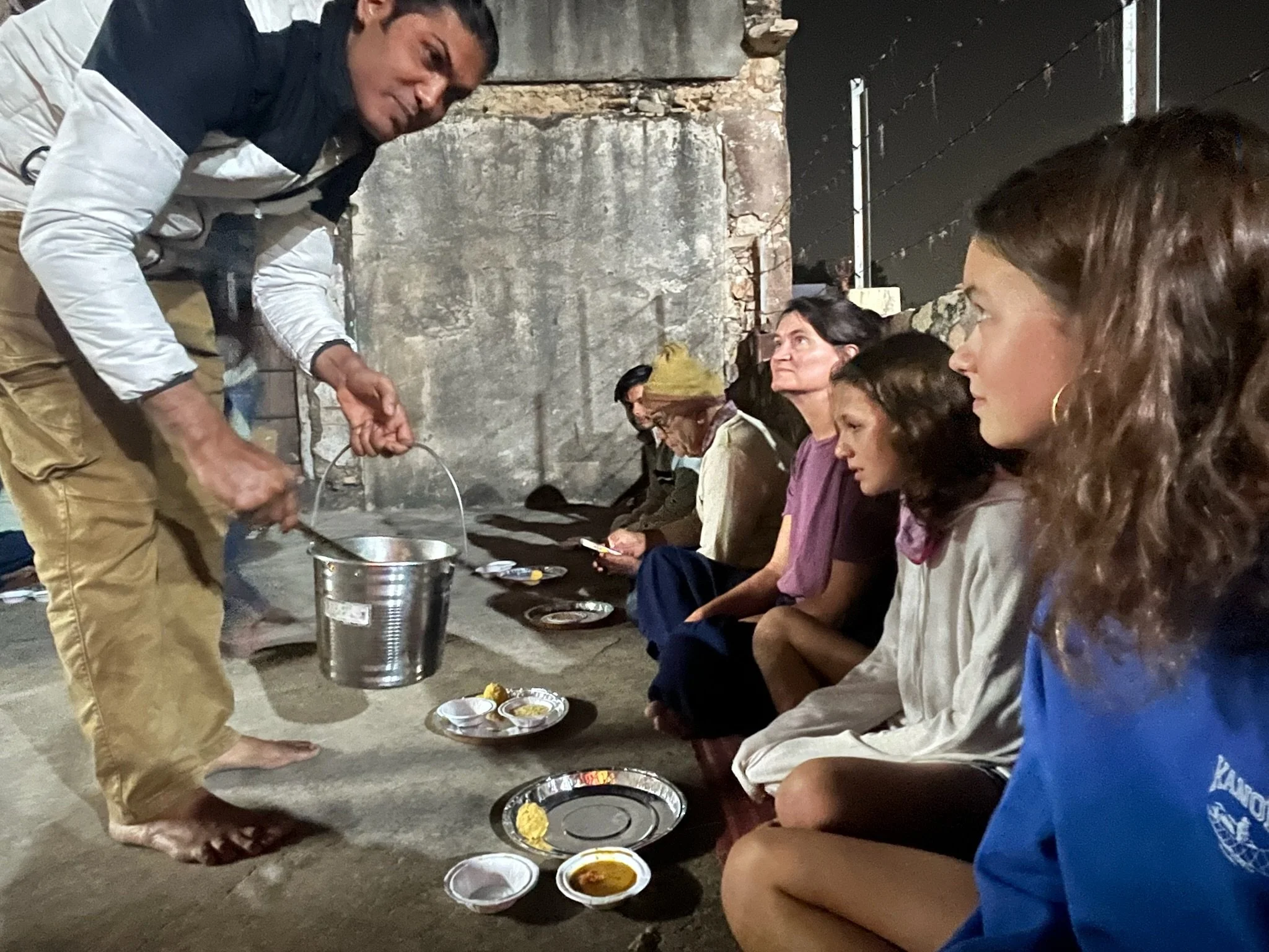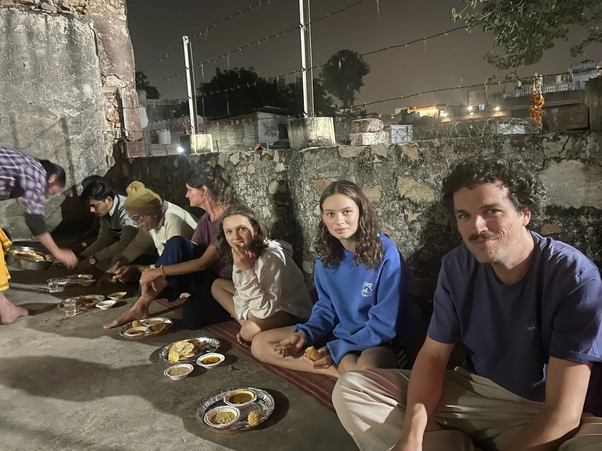 Daarna gaan we ergens achter de tempel op de grond zitten en krijgen we Laddu (een zoetig balletje), Puri (een soort platbrood) en enkele kommetjes met vegetable curry’s. Het is holy food dus we doen ons best om alles goed op te eten. Daarna gooit iedereen zijn kommetjes ergens in een hoek - de vuilbak, wordt dat dan.