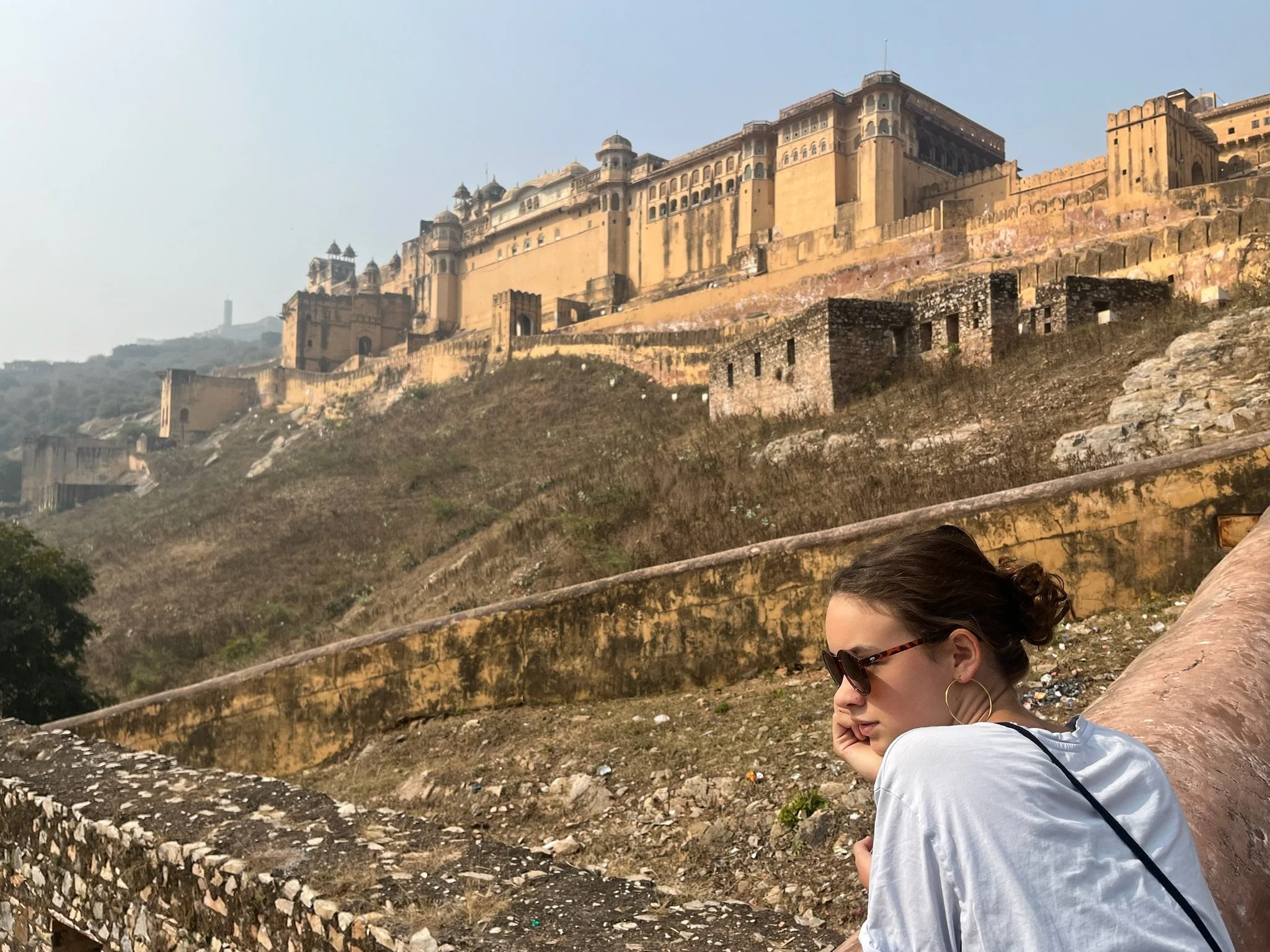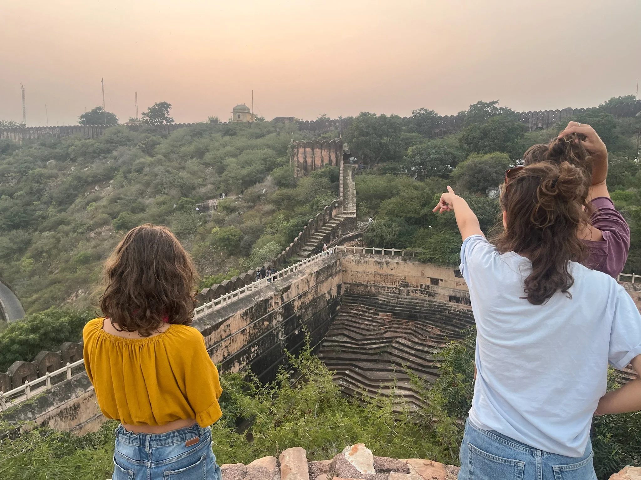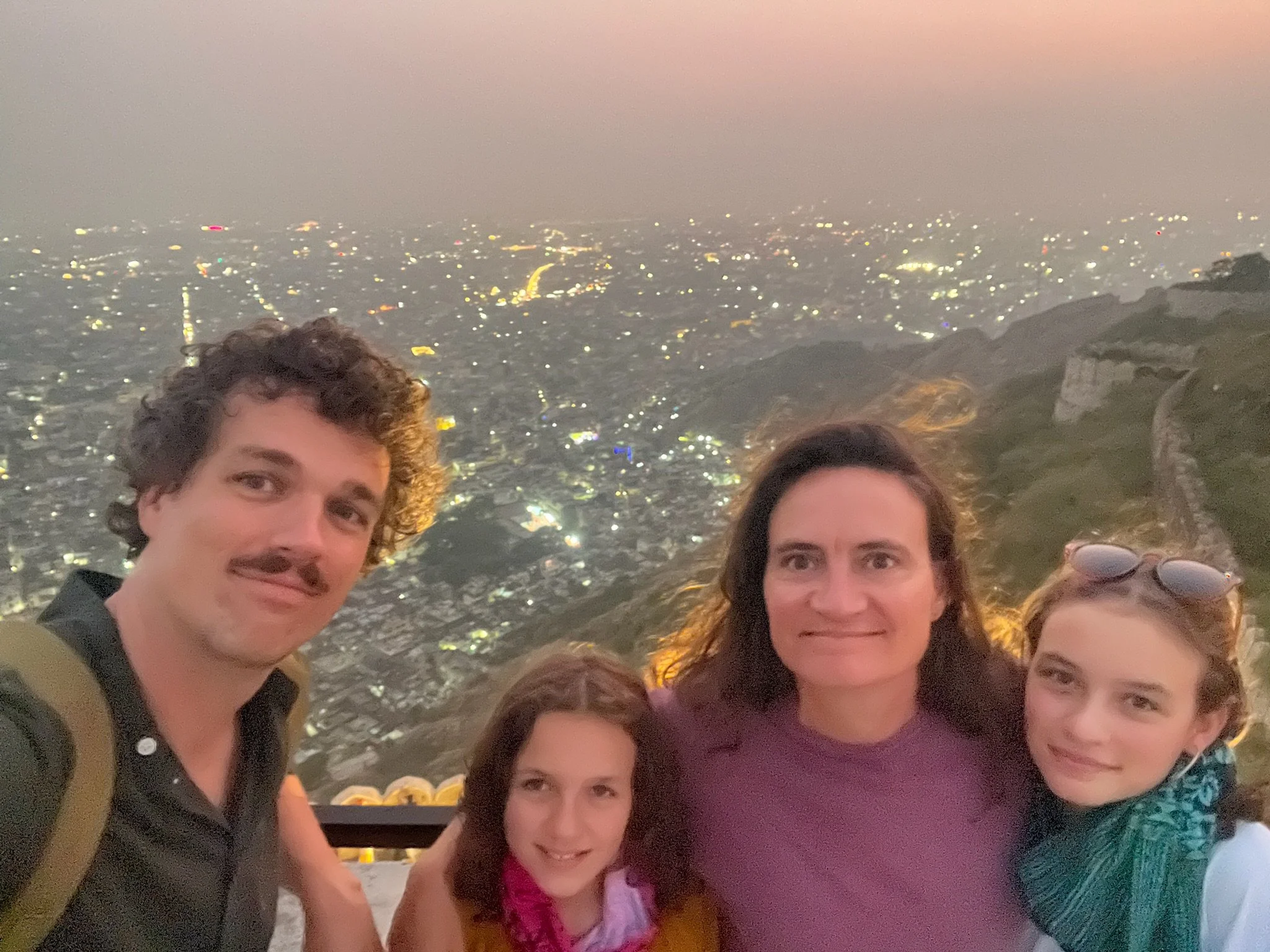 Vanuit de Homestay hebben we zicht op Nagargargh Fort. Op een avond wandelen we ernaartoe. Je kan te voet via een baantje naar omhoog wandelen. Er mogen geen auto’s dus iedereen ziet de wandeling deze keer heel erg zitten. Er passeren wel enkele brommers en een verdwaalde auto, maar al bij al is het rustig wandelen. Boven kunnen we langs de oude stadmuren wandelen en het uitzicht over de stad is spectaculair. Van hierboven zie je ook goed dat Jaipur helemaal ingesloten ligt tussen bergketens dus het vormt echt een soort kommetje waar de smog blijft inliggen. We wandelen ook naar het fort zelf, maar daar zijn er weer massa’s mensen. Die hebben zich allemaal met een tuktuk naar boven laten voeren, dus het is daar ook nog eens een verkeersinfarct tussen de oude stadmuren. We bekijken nog de sunset in the smog van boven op het dak van het fort, en wandelen dan terug naar beneden. Het is donker op het weggetje naar beneden, maar het voelt niet onveilig. Dat heeft het hier trouwens nog niet gedaan, dat is ook wel een verademing. De kindjes zingen de hele terugweg de muziek van LalaLand, een film die we samen in Vietnam hebben gekeken. Het zijn van die momenten dat je stilletjes achter ze wandelt, ze fijntjes hoort zingen en op de achtergrond Jaipur ziet liggen, en blij bent dat je zo een reis doet.