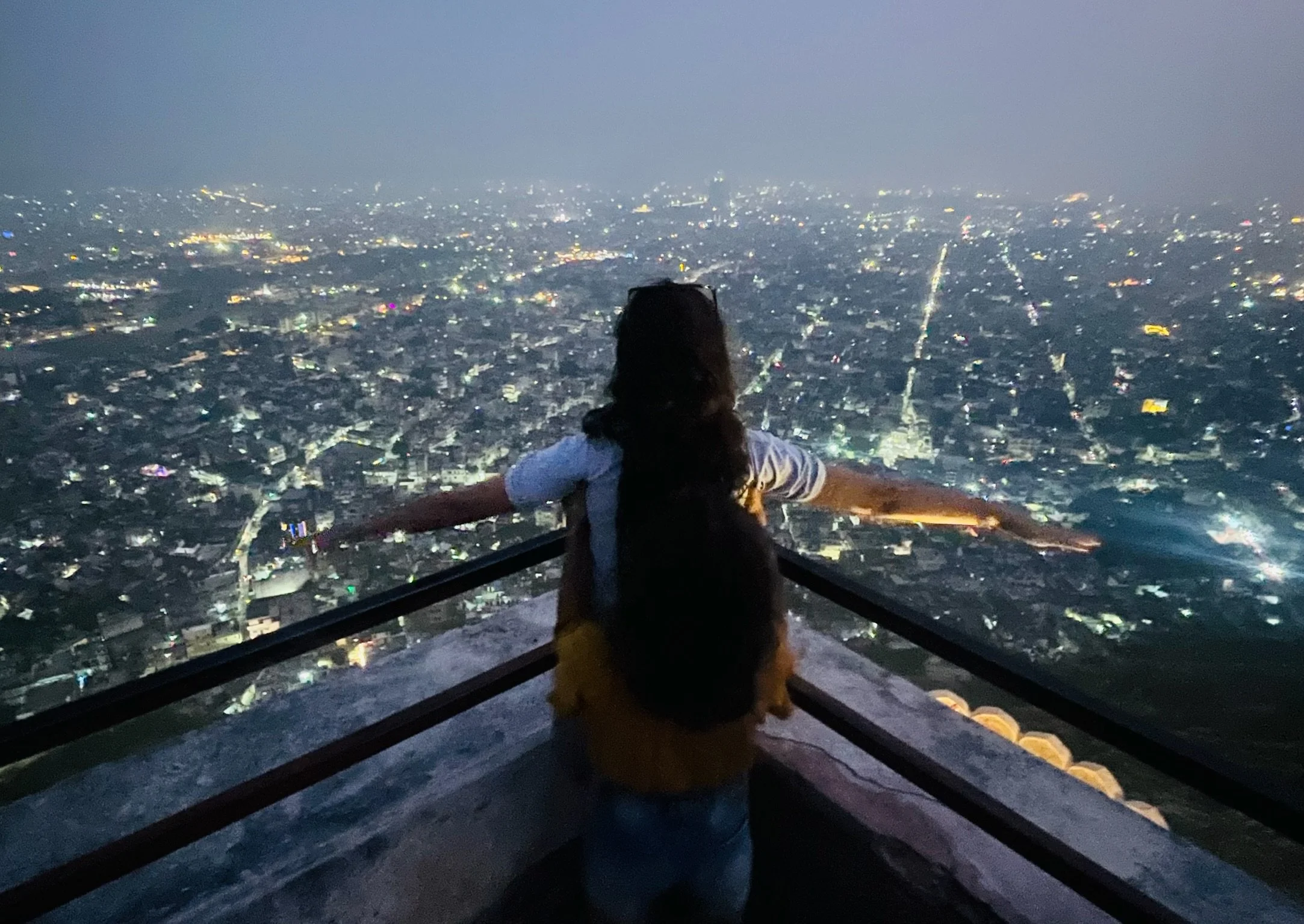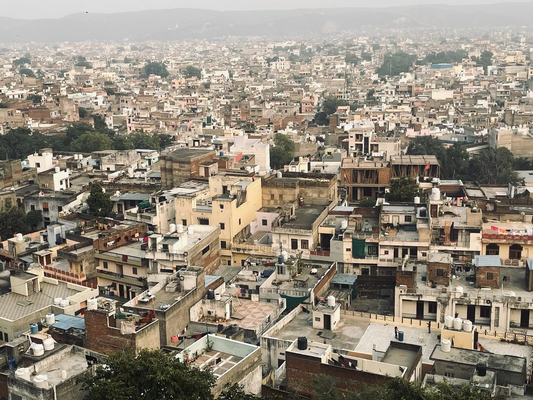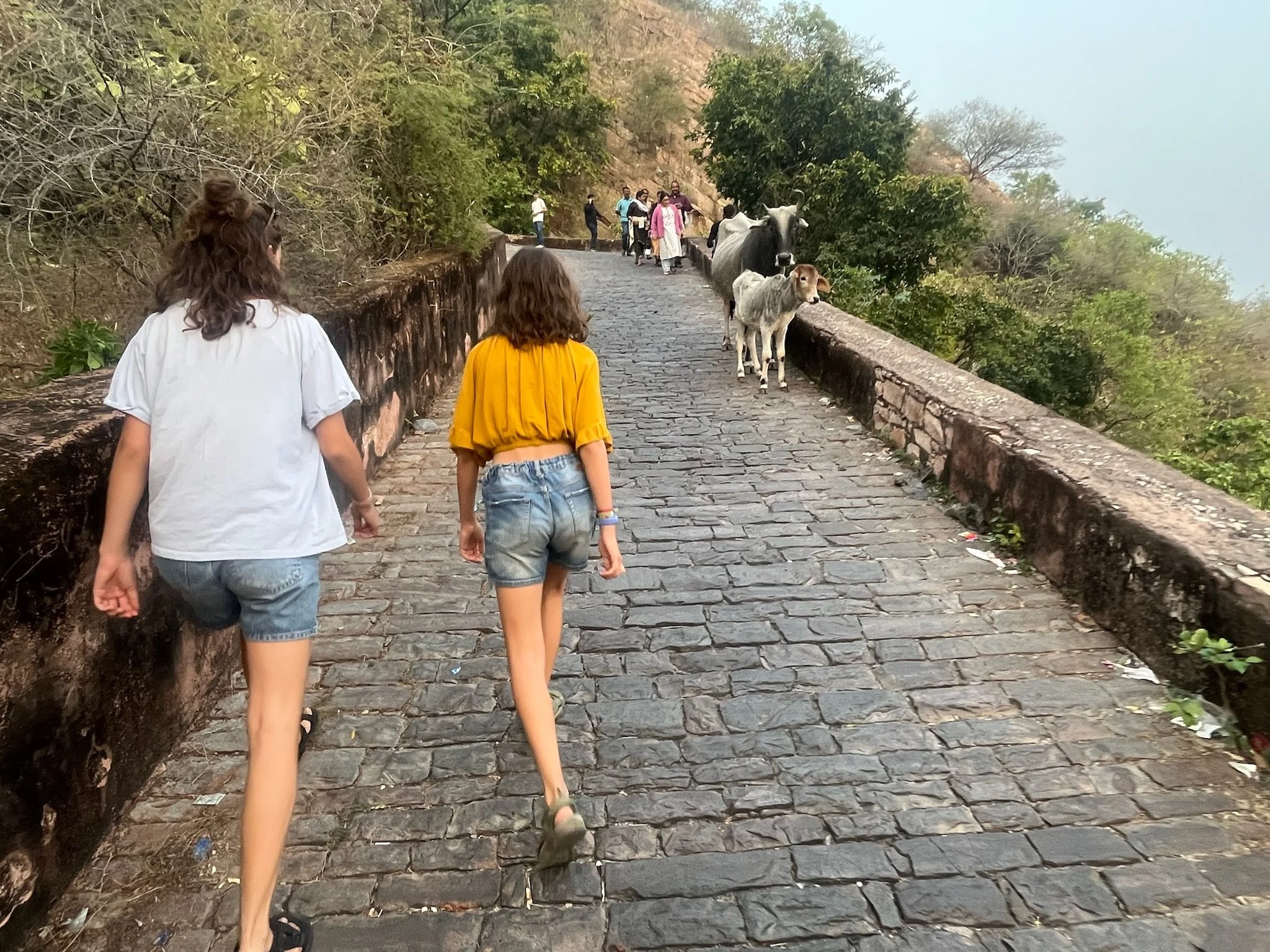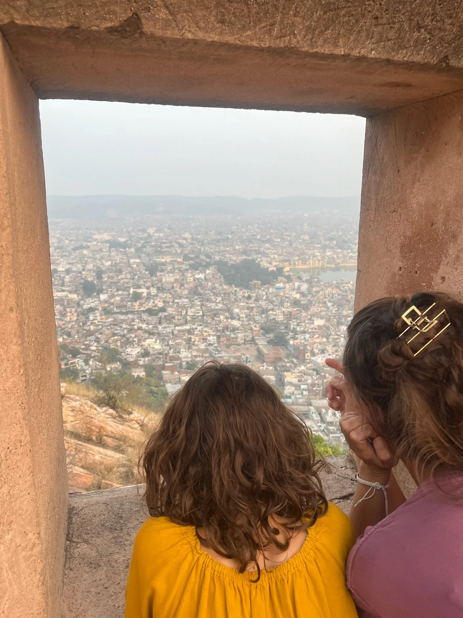 Vanuit de Homestay hebben we zicht op Nagargargh Fort. Op een avond wandelen we ernaartoe. Je kan te voet via een baantje naar omhoog wandelen. Er mogen geen auto’s dus iedereen ziet de wandeling deze keer heel erg zitten. Er passeren wel enkele brommers en een verdwaalde auto, maar al bij al is het rustig wandelen. Boven kunnen we langs de oude stadmuren wandelen en het uitzicht over de stad is spectaculair. Van hierboven zie je ook goed dat Jaipur helemaal ingesloten ligt tussen bergketens dus het vormt echt een soort kommetje waar de smog blijft inliggen. We wandelen ook naar het fort zelf, maar daar zijn er weer massa’s mensen. Die hebben zich allemaal met een tuktuk naar boven laten voeren, dus het is daar ook nog eens een verkeersinfarct tussen de oude stadmuren. We bekijken nog de sunset in the smog van boven op het dak van het fort, en wandelen dan terug naar beneden. Het is donker op het weggetje naar beneden, maar het voelt niet onveilig. Dat heeft het hier trouwens nog niet gedaan, dat is ook wel een verademing. De kindjes zingen de hele terugweg de muziek van LalaLand, een film die we samen in Vietnam hebben gekeken. Het zijn van die momenten dat je stilletjes achter ze wandelt, ze fijntjes hoort zingen en op de achtergrond Jaipur ziet liggen, en blij bent dat je zo een reis doet.