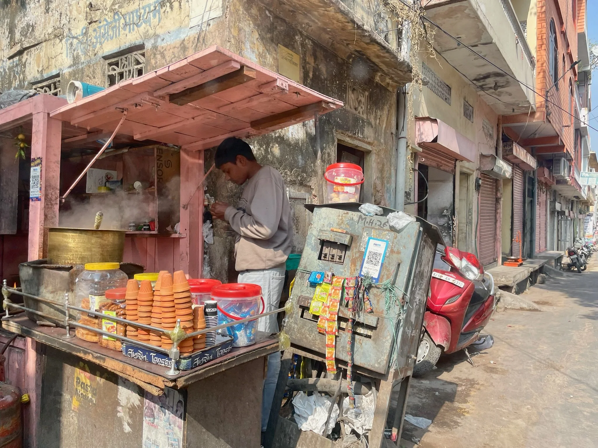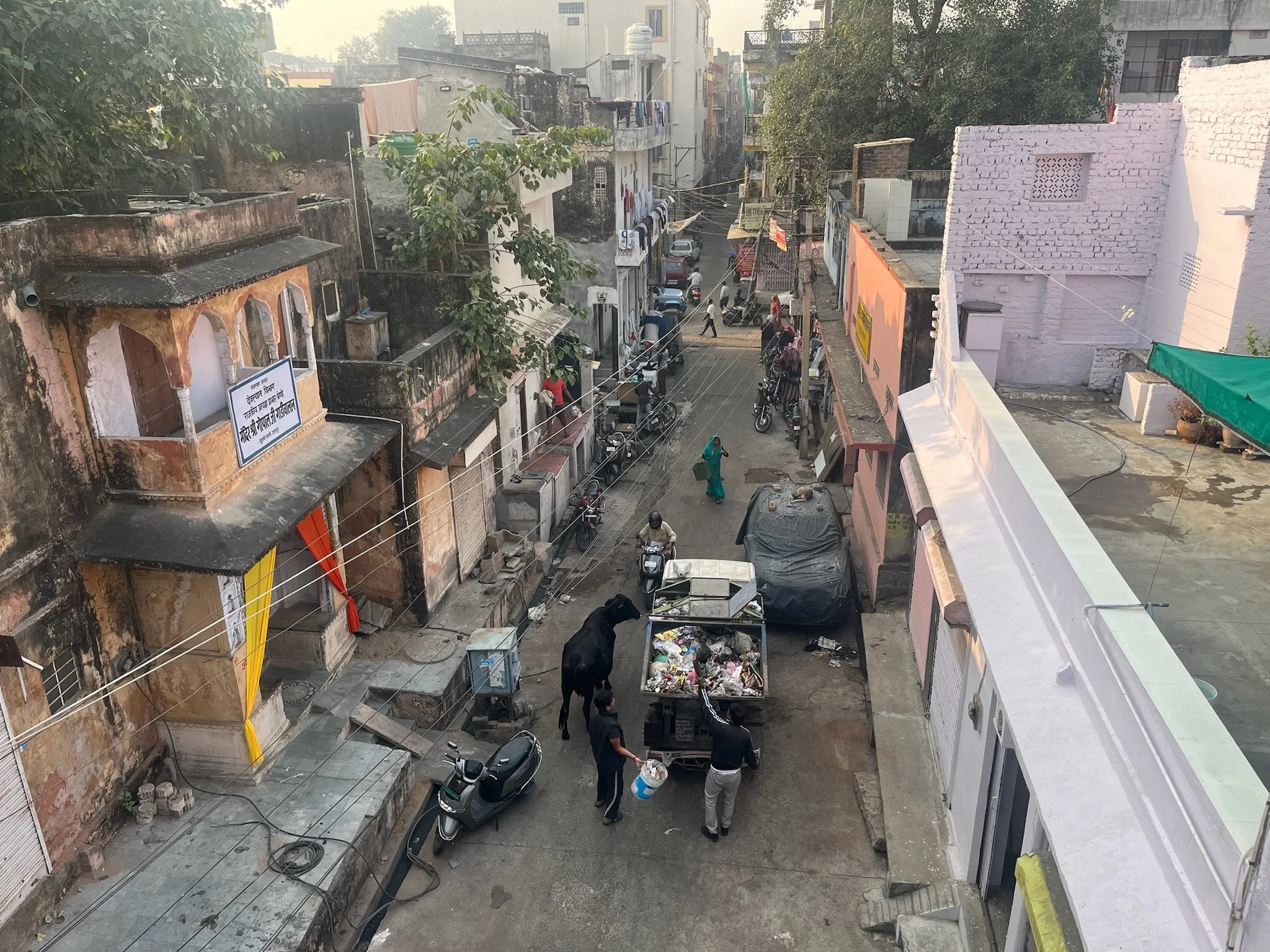 Het vuilbak-gegeven hier in India, is toch ook wel een apart verhaal. Een van de eerste dagen zaten we in de Homestay te eten, en nadien vegen wij, propere Belgen, onze restjes op de borden bij elkaar. De servetjes op het ene bord, voedselresten op het andere,… vervolgens komt Meena naar het dakterras en ze kiepert de borden gewoon los over het muurtje, de straat op. Tussen de huizen is er bijna altijd zo’n ruimte van een kleine halve meter breed, die dus gewoon als vuilbak dient. Er komt hier wel elke dag een vuilkarretje rond in de ochtend. Die rijdt 4 uur rond en zorgt er volgens ons voor dat de pest hier vooralsnog niet opnieuw uitbreekt. Volgens Prakesh de beste tijd van de dag om een wandelingetje te maken, want daarna stapelt het vuil in de straten zich weer op.
