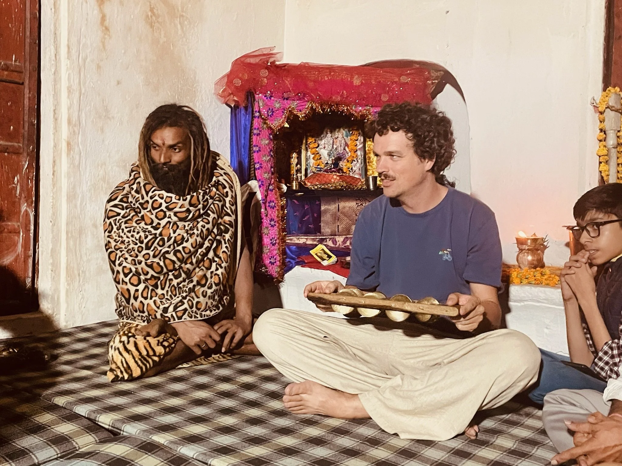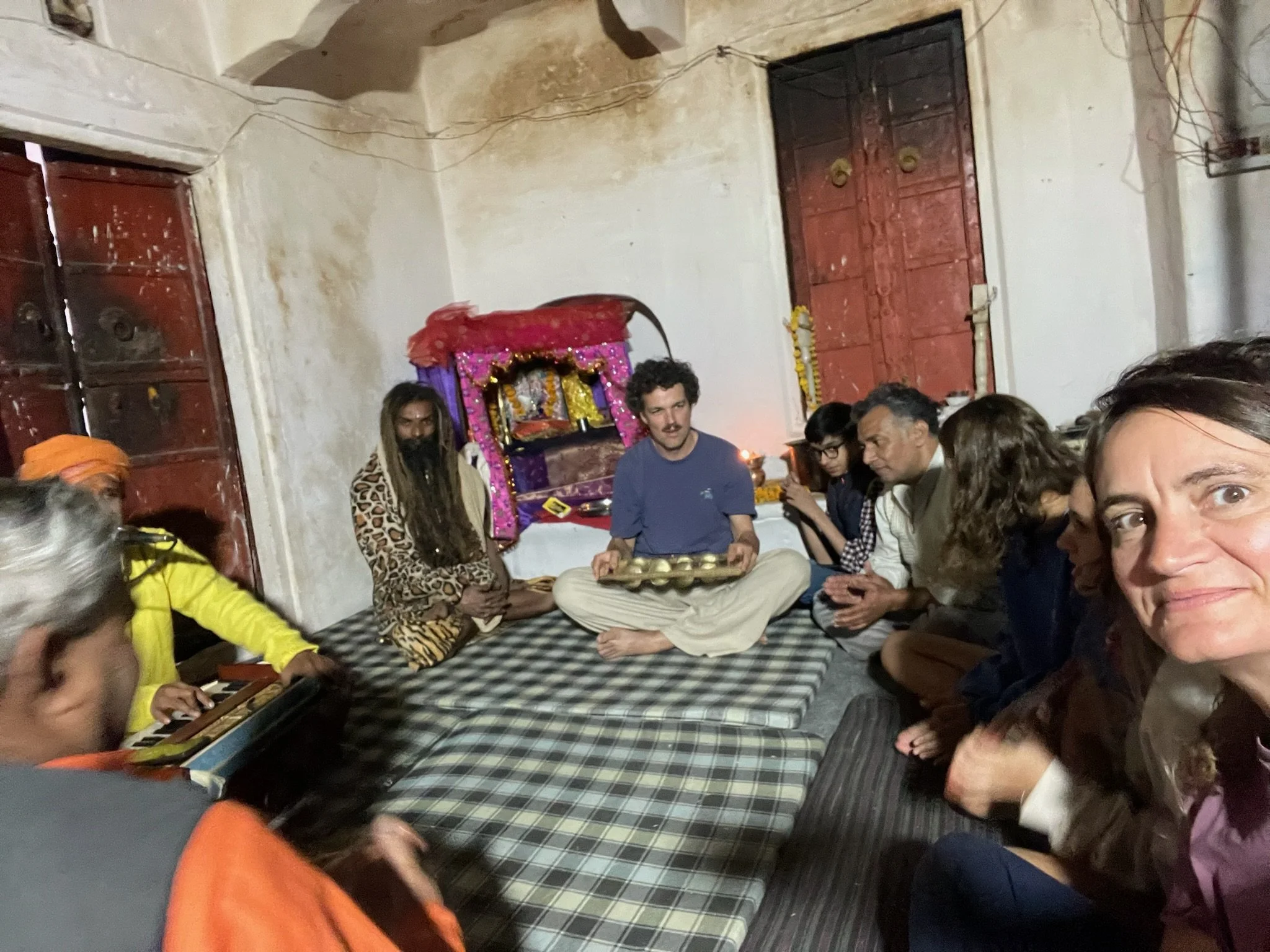 Na onze heilige maaltijd in de tempel passeren we langs een kamertje waar enkele gasten ‘Sita Rama’ zitten te chanten, het lijkt al enkele uren. De leadzanger heeft zich al in een gelukzalige roes gezongen, zo lijkt het. ‘Come come’ doet hij teken en voor we het weten zitten we mee te zingen. We weten hier echt nooit waar we terecht zullen komen. Maar het is nooit normaal.