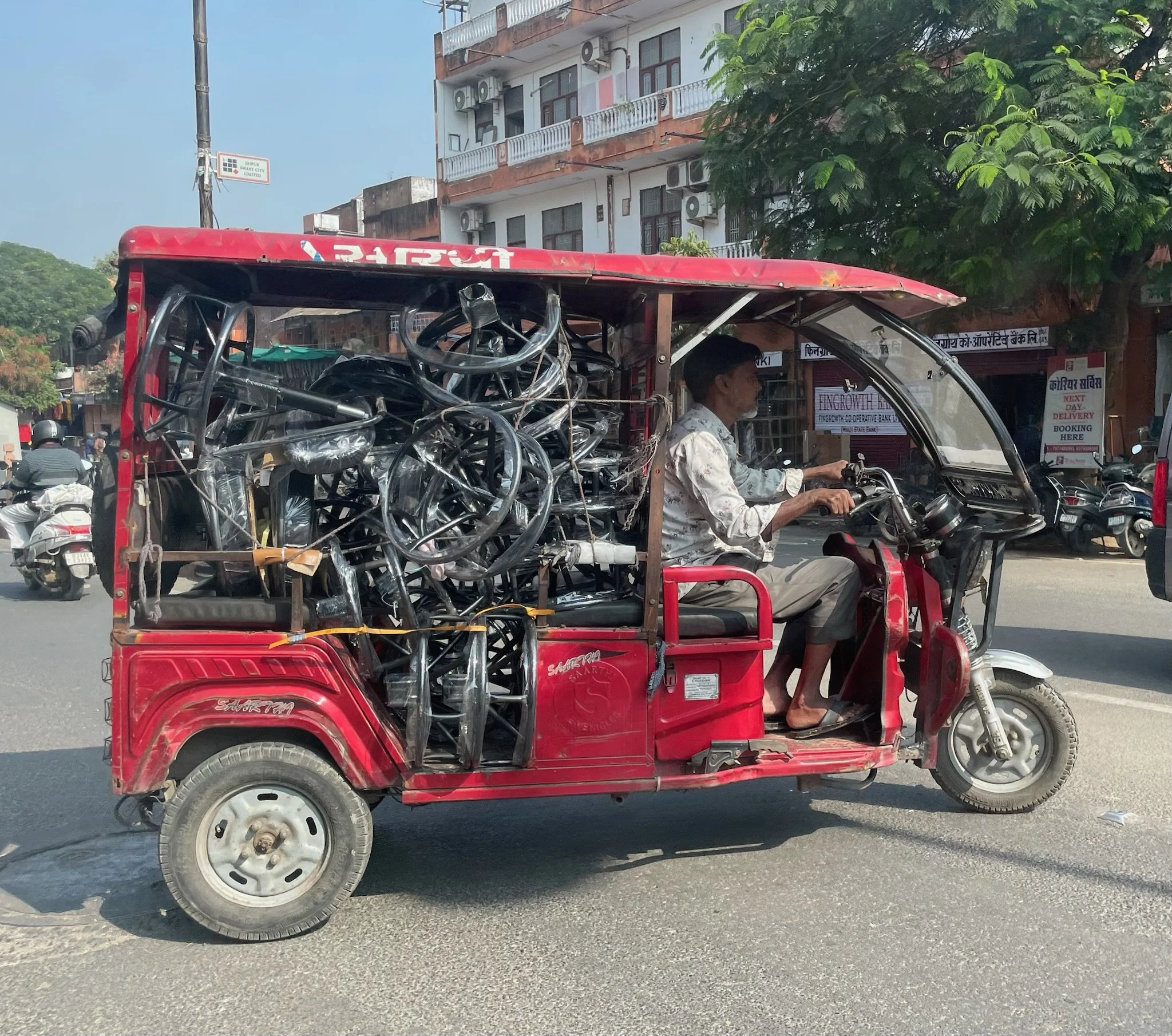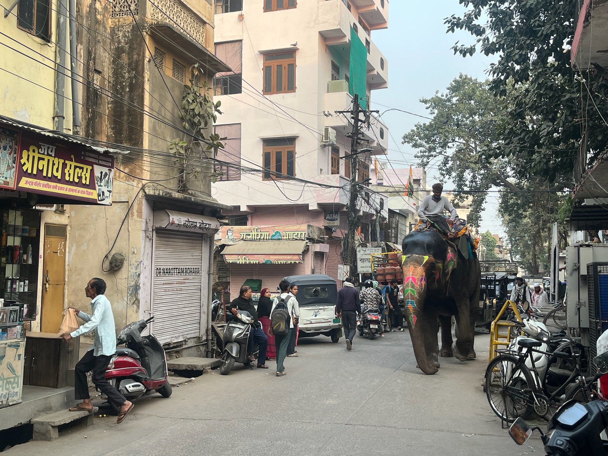 De stad is een wirwar van mensen en straten, alles door, boven en op elkaar. De straten zijn half geplaveid en er ligt overal vuilnis. Het verkeer is volledig waanzinnig; auto’s, brommers, tuktuks, fietsers,… rijden allemaal kriskras door elkaar, er zijn geen enkele regels. Het is een wonder dat ze niet voortdurend tegen elkaar rijden. De bussen zitten overvol, er hangen soms mensen aan de buitenkant aan, of ze zitten op het dak. Als we in een tuktuk door de stad sjezen, is het echt millimeterwerk tussen onze tuktuk en het andere verkeer. Er wordt getoeterd dat het een lieve lust is. Komt daar dan nog bij dat er behoorlijk wat koeien op hun gemakske door deze heksenketel wandelen, of plots gaan liggen, of staan te schijten. En soms passeert er ook eens een fluo geschilderde olifant. Je gelooft je ogen niet.