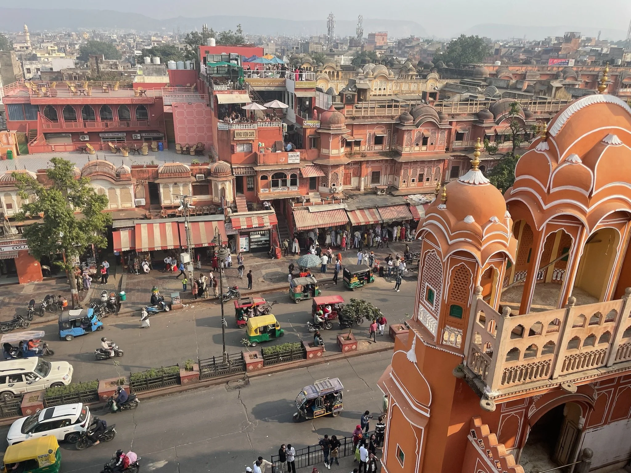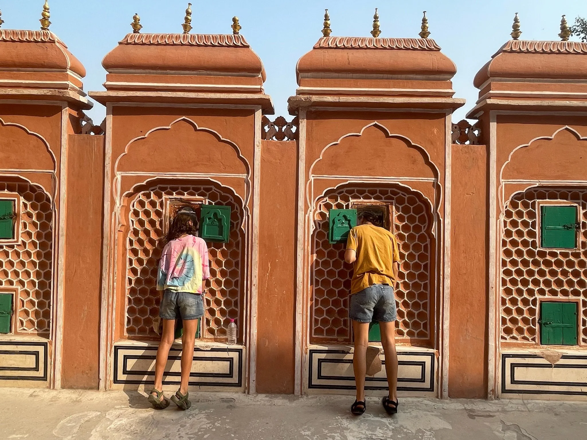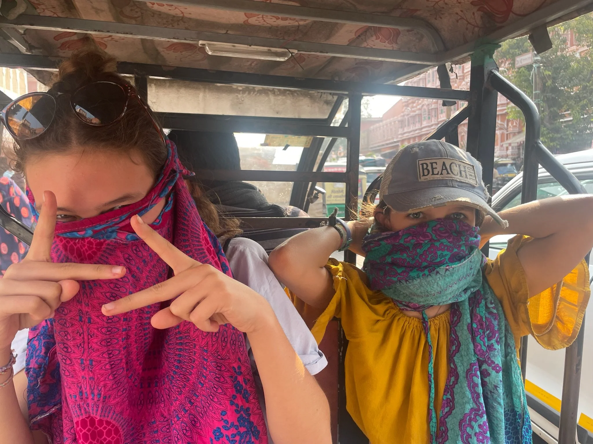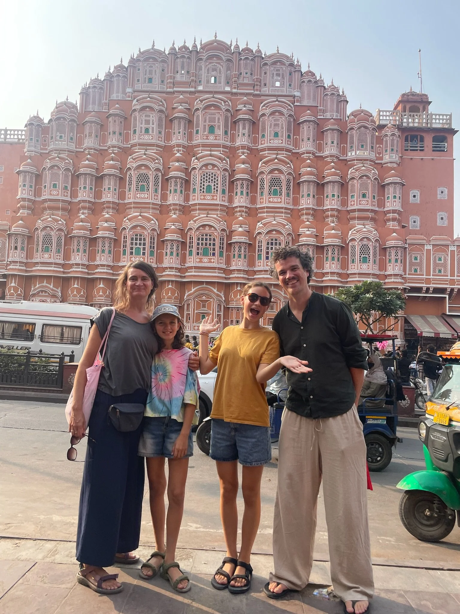 De tweede dag beginnen de meesten van het gezin ook echt last te krijgen van de smog. Er is een Air Quality Index, die meet hoe vuil de lucht is op een schaal van 0 tot 500. Hier in Jaipur zitten we rond de 300. In Delhi gaat het metertje boven de 500. Je ziet de smog ook wel hangen in de stad, en als we rondrijden in een tuktuk door het verkeer kan het echt wel prikken in je keel. Robin heeft ook een loopneus en verkoudheid en ze hoesten allebei veel. Ze hebben gelezen dat deze blootstelling aan smog gelijk staat met het roken van ongeveer 7 sigaretten per dag. Deze informatie heeft hen in een kleine dramatische modus gebracht, waarbij ze de hele dag hoesten en rochelen, vrezend dat ze het einde van het jaar niet meer gaan halen door deze luchtvervuiling. We moeten soms echt wel eens zeggen dat ze rustig moeten blijven en relativeren, al is het ergens toch ook even slikken om je kinderen elke dag in deze lucht buiten te sturen. Het is pure waanzin dat de mensen hierin moeten leven. Je hoort ook de hele tijd Indiërs rochelen, hun neus optrekken en hoesten. Naast de smog is vooral het toeteren vervelend vind ik. De toeters van de auto’s, bussen en tuktuk’s zijn echt heel erg luid, voortdurend aanwezig en een regelrechte aanslag op je auditieve prikkelverwerking.
