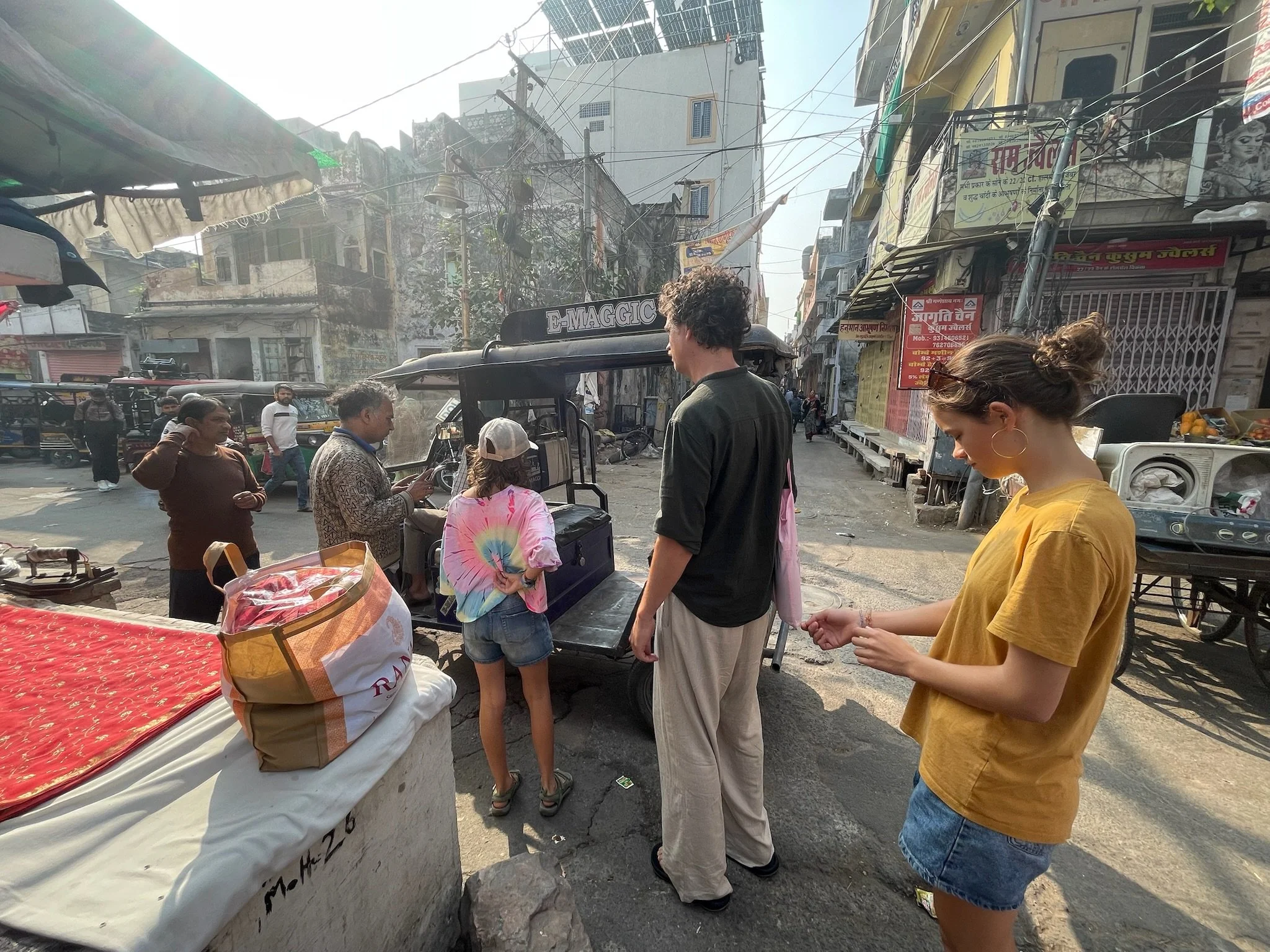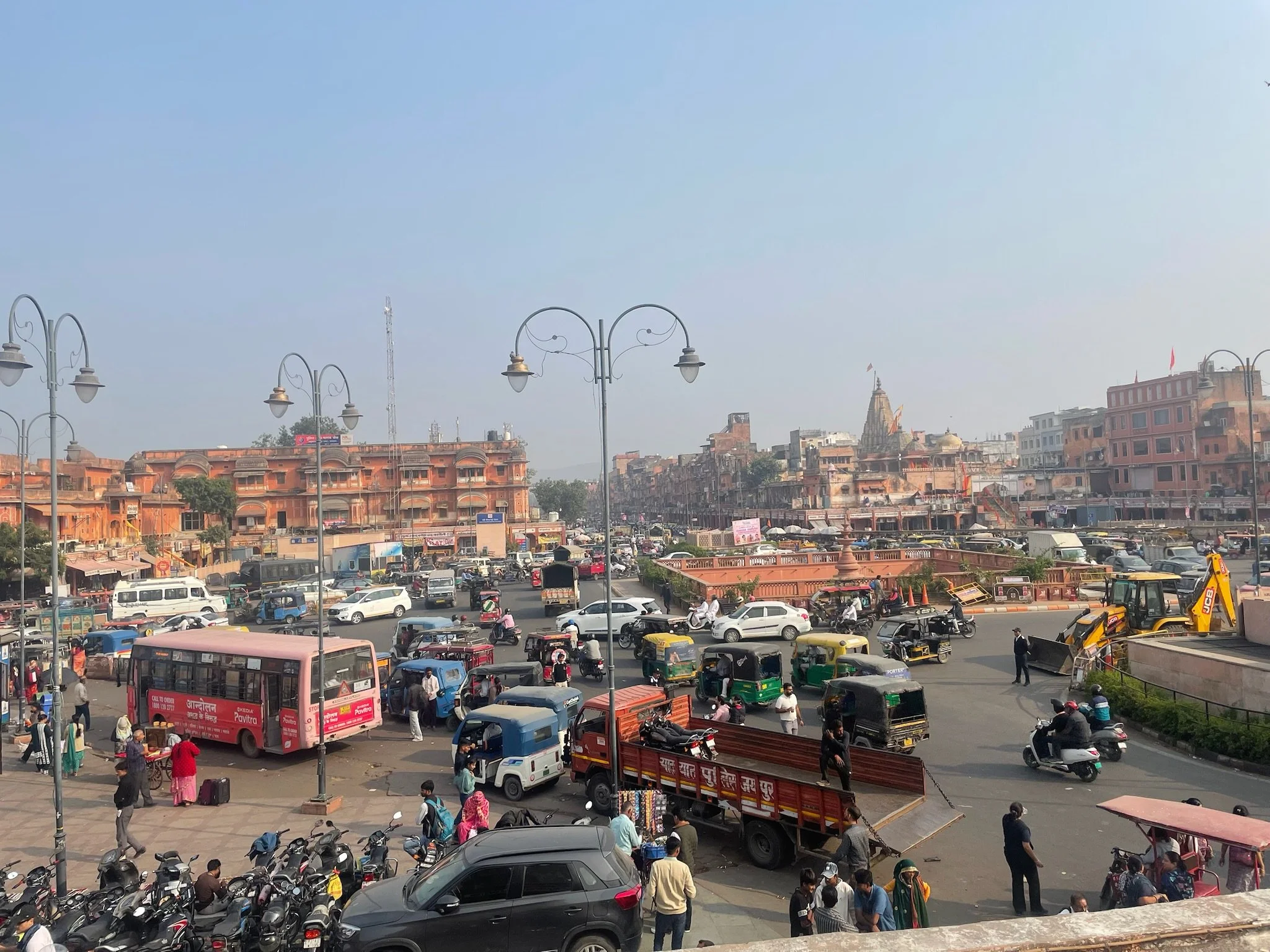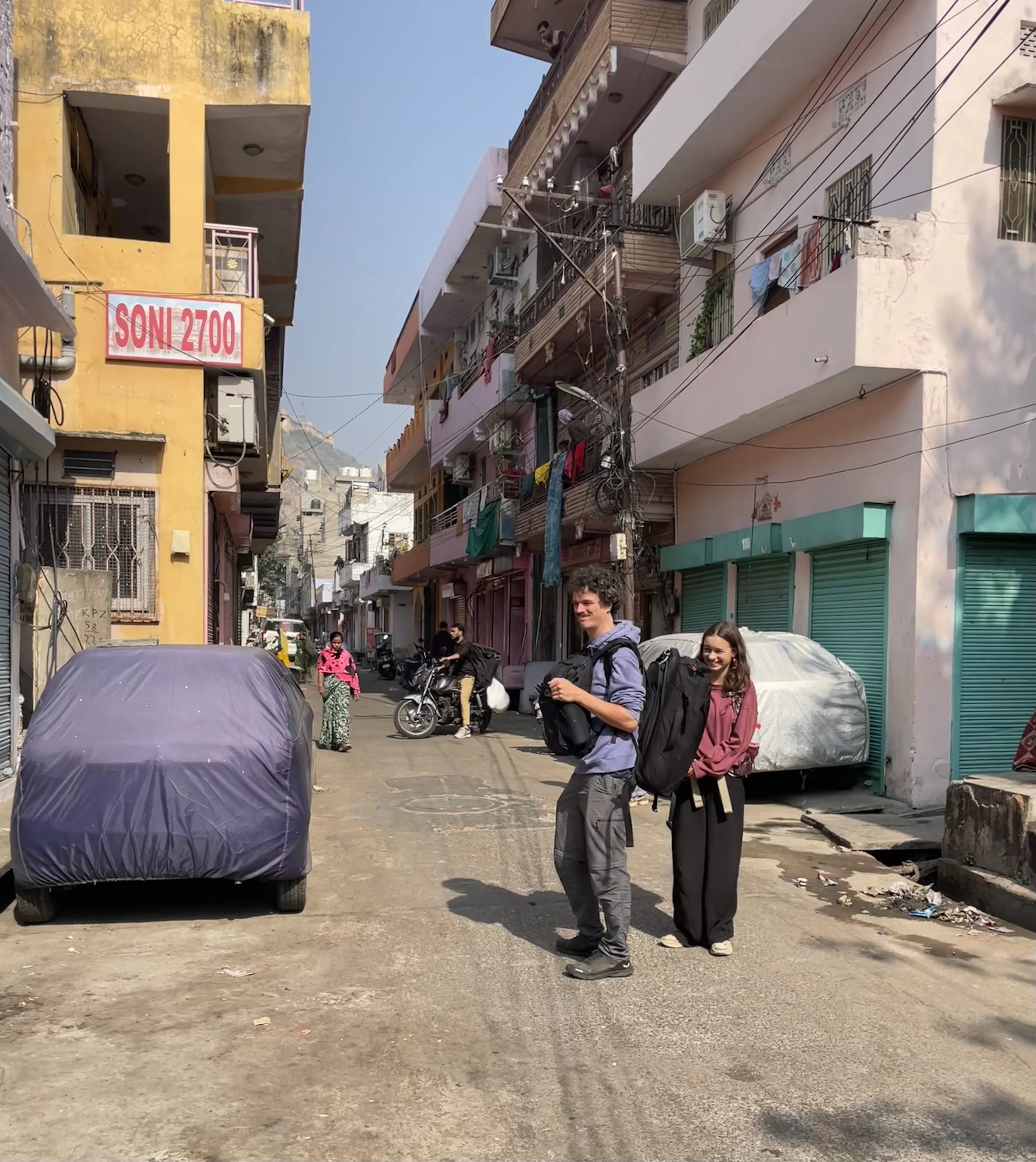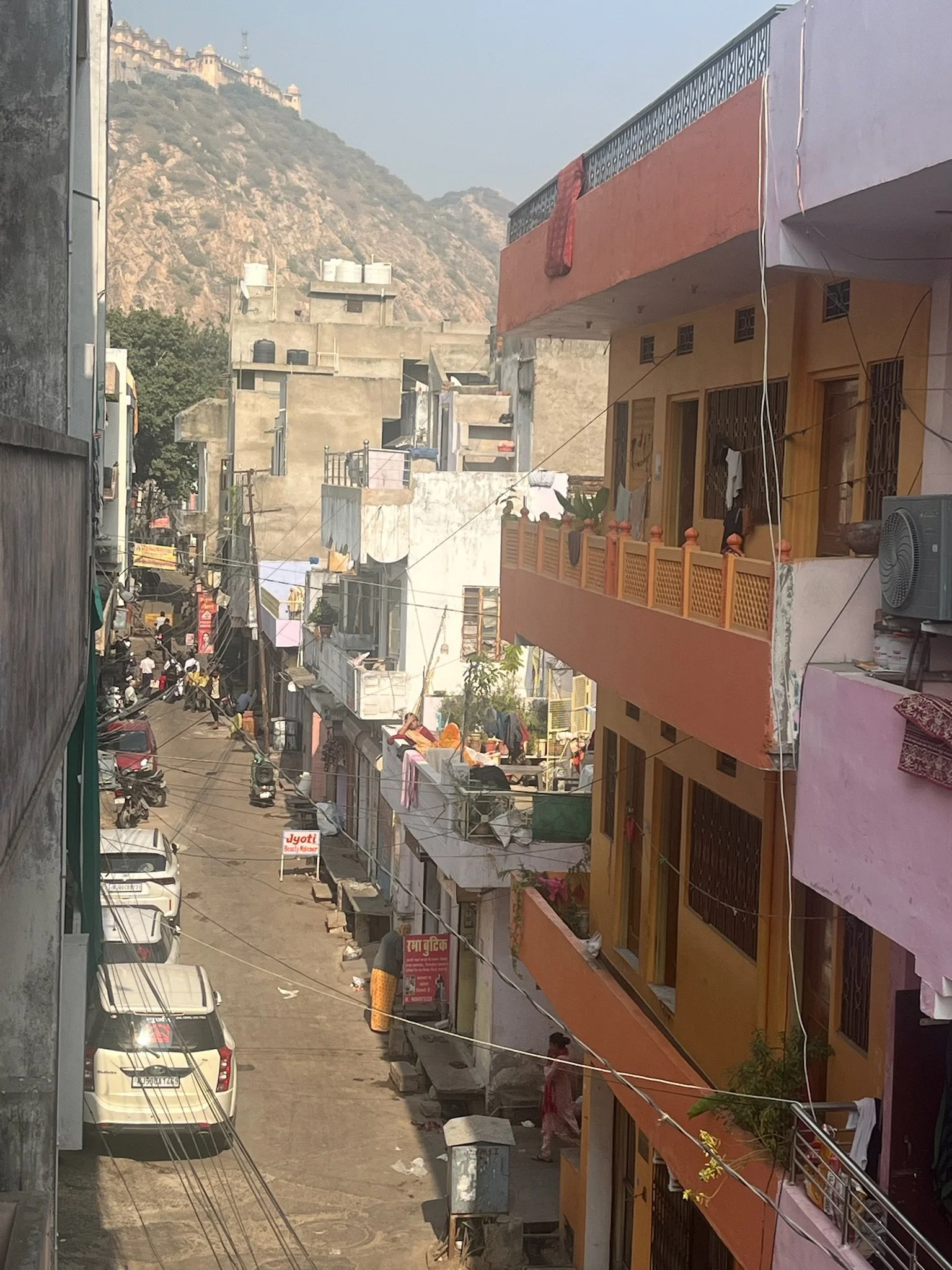 De tweede dag beginnen de meesten van het gezin ook echt last te krijgen van de smog. Er is een Air Quality Index, die meet hoe vuil de lucht is op een schaal van 0 tot 500. Hier in Jaipur zitten we rond de 300. In Delhi gaat het metertje boven de 500. Je ziet de smog ook wel hangen in de stad, en als we rondrijden in een tuktuk door het verkeer kan het echt wel prikken in je keel. Robin heeft ook een loopneus en verkoudheid en ze hoesten allebei veel. Ze hebben gelezen dat deze blootstelling aan smog gelijk staat met het roken van ongeveer 7 sigaretten per dag. Deze informatie heeft hen in een kleine dramatische modus gebracht, waarbij ze de hele dag hoesten en rochelen, vrezend dat ze het einde van het jaar niet meer gaan halen door deze luchtvervuiling. We moeten soms echt wel eens zeggen dat ze rustig moeten blijven en relativeren, al is het ergens toch ook even slikken om je kinderen elke dag in deze lucht buiten te sturen. Het is pure waanzin dat de mensen hierin moeten leven. Je hoort ook de hele tijd Indiërs rochelen, hun neus optrekken en hoesten. Naast de smog is vooral het toeteren vervelend vind ik. De toeters van de auto’s, bussen en tuktuk’s zijn echt heel erg luid, voortdurend aanwezig en een regelrechte aanslag op je auditieve prikkelverwerking.