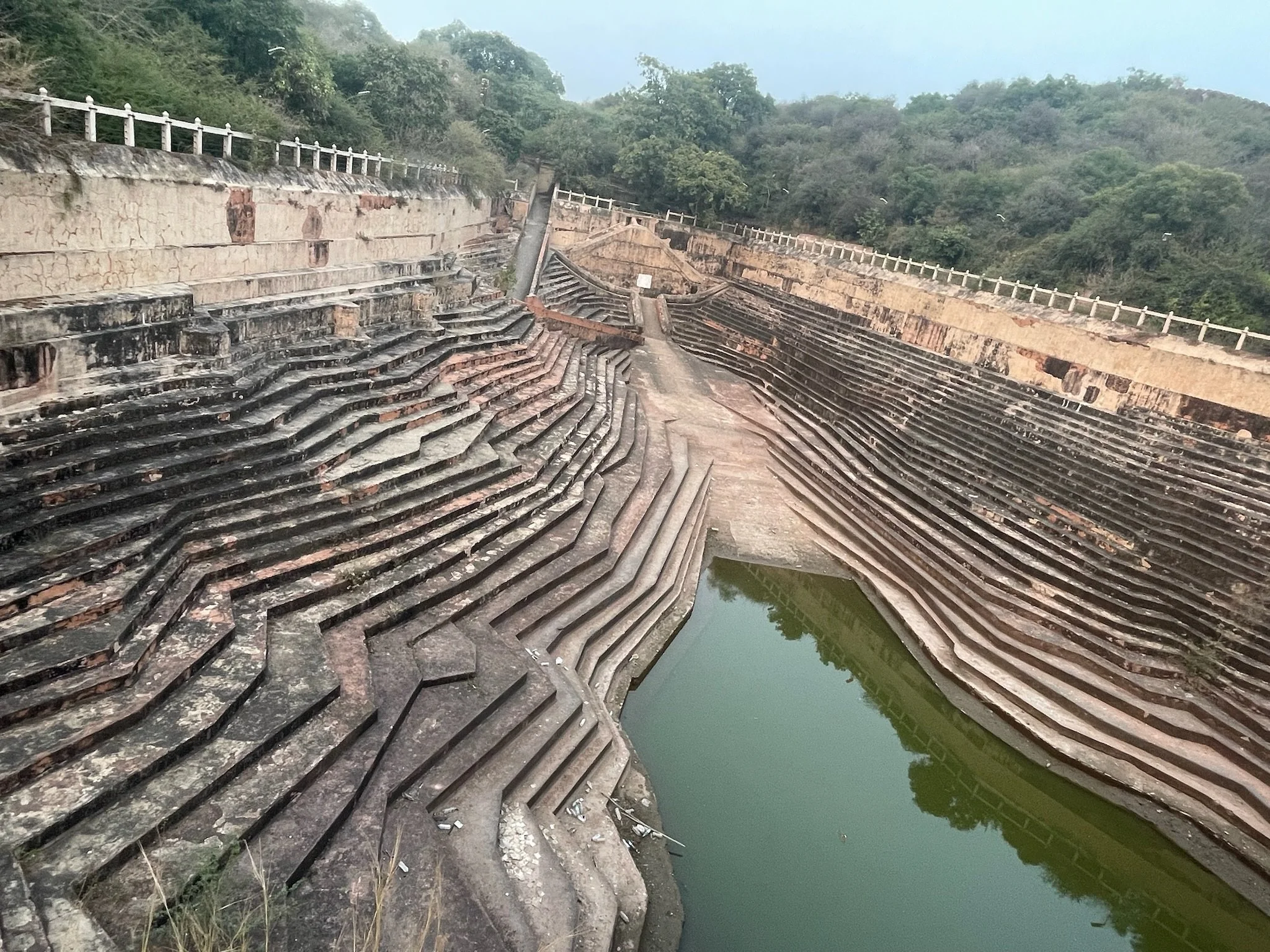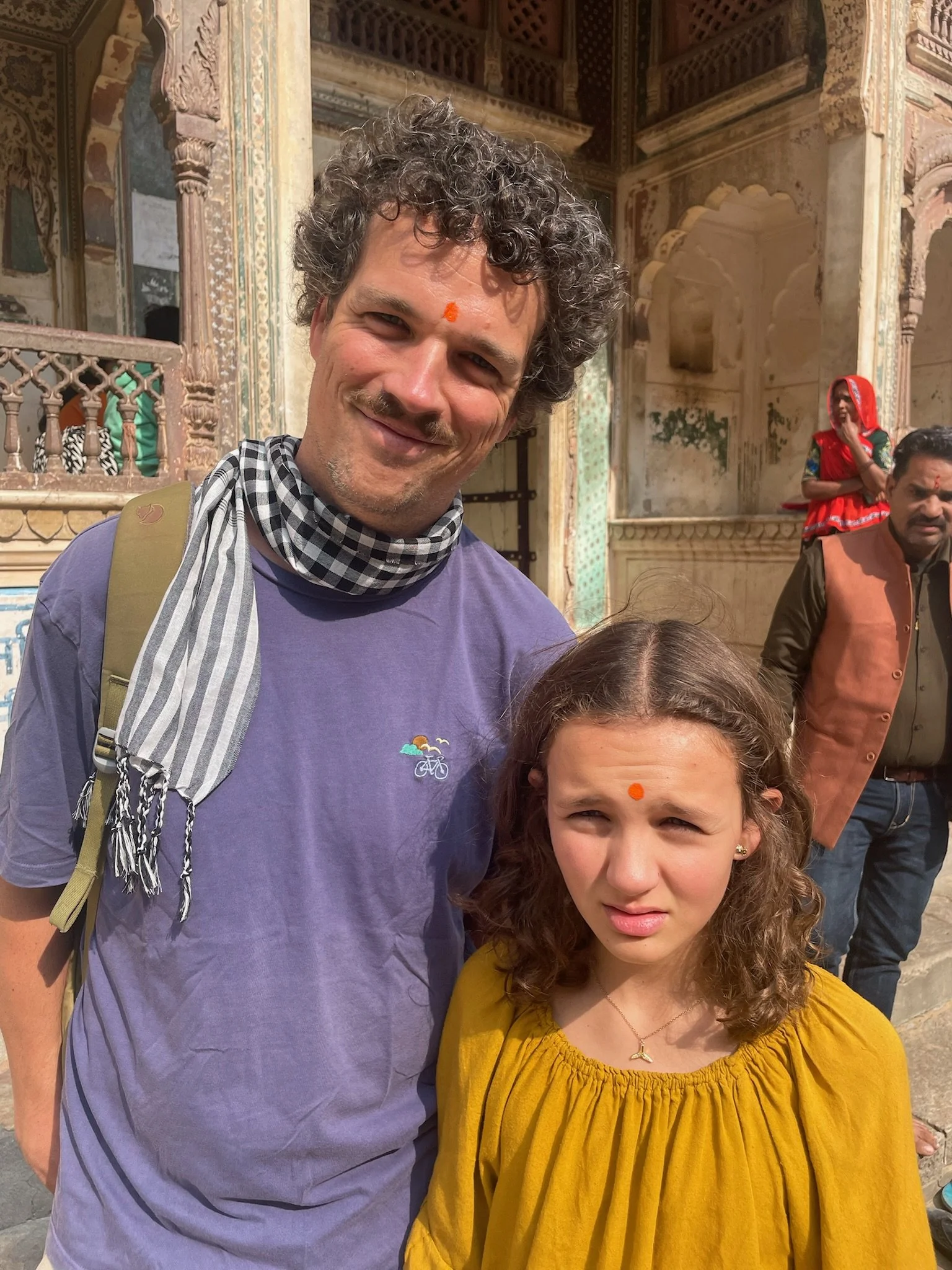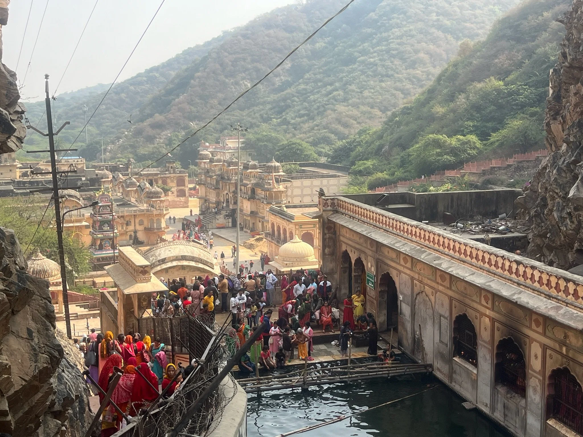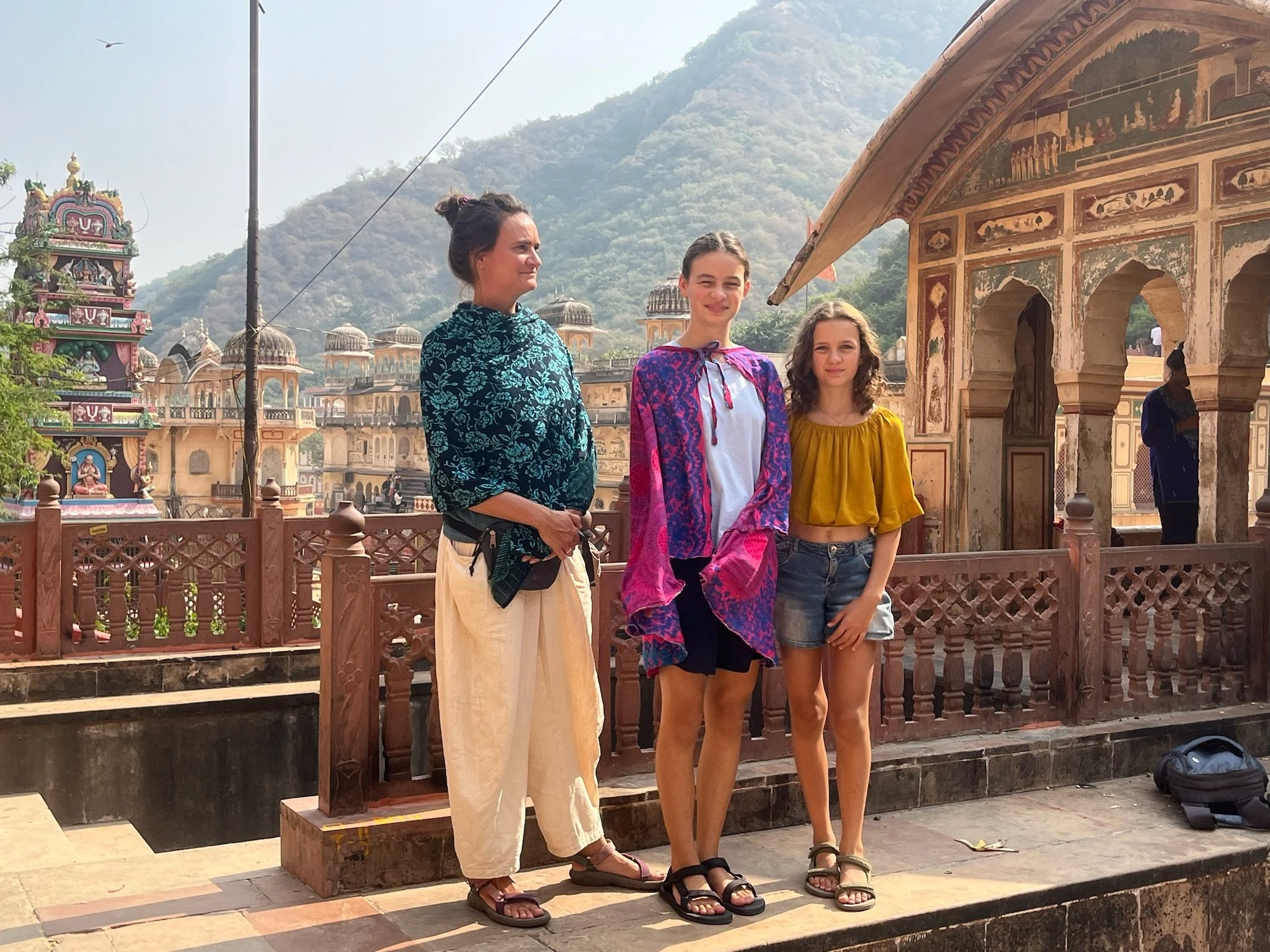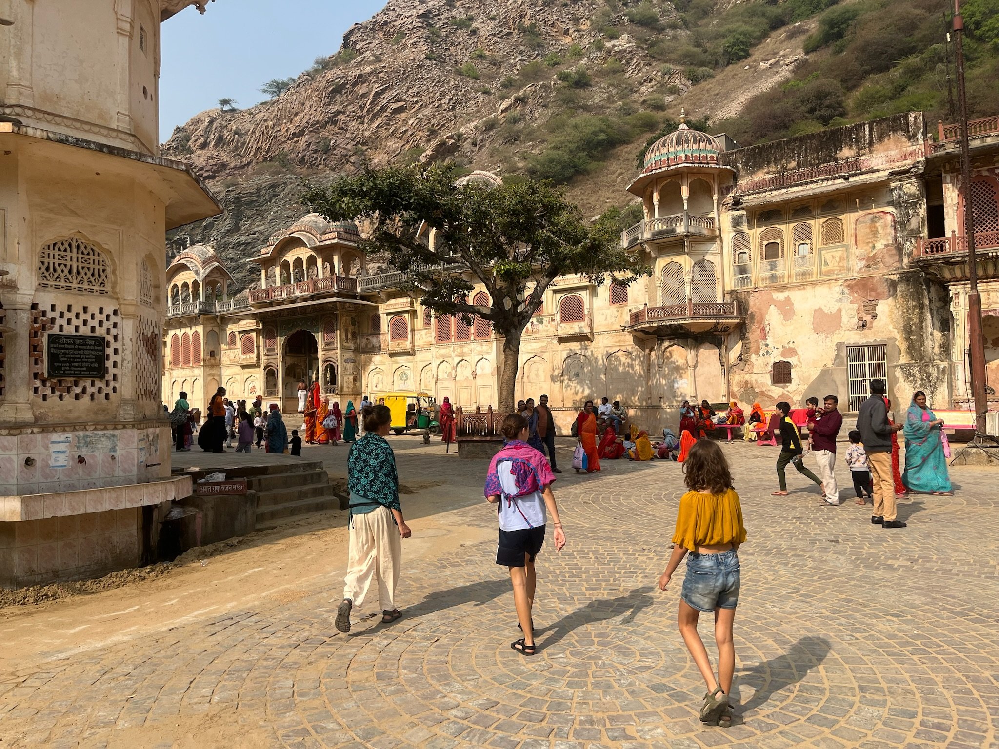 Op zondag, onze laatste dag in Jaipur, bezoeken we de Galta Ji tempel (Monkey tempel), op een kwartiertje buiten de stad. Na een ritje met de tuktuk moeten we nog een klein wandeltochtje tussen de bergen doen, en we zien niet goed waar we terecht zullen komen. Maar eenmaal beneden zien we een prachtig tempelcomplex tussen de rotsen, vol vol apen. We passeren eerst een kund, een poel waar bergwater toekomt, heilig water. Iedereen springt daar met zijn kleren in en gaat drie keer kopje onder. We zouden zeker mogen meedoen, maar we wandelen vriendelijk door. In de tempel beneden gaan we wel binnen. We worden er door een Brahman (priester) gezegend door met een trosje pauwenveren enkele keren op ons hoofd te slaan, en Senne en Robin krijgen een bindi op hun voorhoofd, hun eerste spirituele derde oog. De sfeer is echt heel relaxed in de tempel. Het lijkt een plek waar families naartoe gaan op zondag, voor wat heilige rituelen, gevolgd door een maaltijd. In de tempel er rechttegenover worden we uitgenodigd om mee te eten, maar we passen vriendelijk en geven onze maag nog enkele dagen extra om te gewennen aan het eten door voorlopig de meest hygiënische opties te verkiezen.