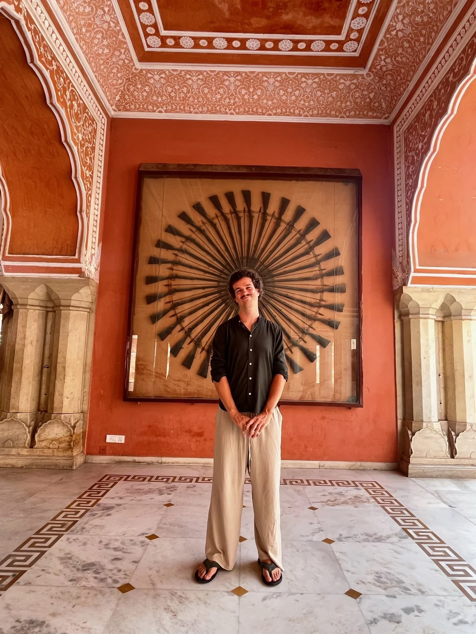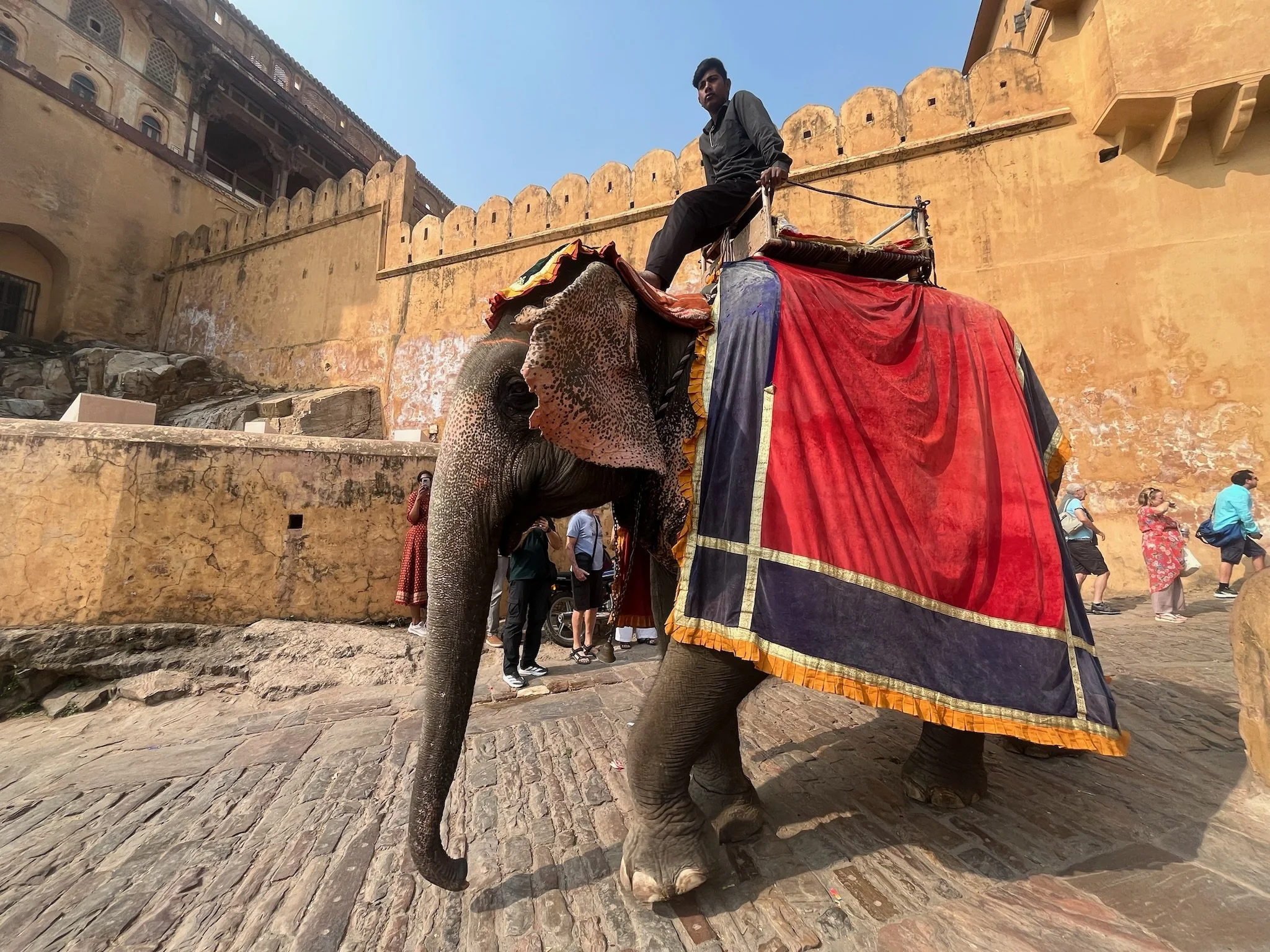 Een andere dag bezoeken we het Am(b)er Fort. Dat ligt eventjes buiten de stad. We doen een 20 minuten tuktuk ritje naar daar. Het fort is gigantisch groot, ligt op een heuvel en is gebouwd uit roze zandsteen en wit marmer. Dat er olifanten op de toegangsweg in en uit het fort wandelen, doet het helemaal op een sprookjesboek lijken. De fresco’s van bloemen en decoratieve patronen zijn goed bewaard en prachtig om te zien. Ook dit paleis is een voorbeeld van Mogol architectuur, dat is de bouwstijl die hier een 300 jaar in zwang was tussen 1550 en 1850. De Taj Mahal bijvoorbeeld is het gekendste voorbeeld van deze bouwstijl. We zien vooral veel bogen, veel symmetrie, gedetailleerde ornamenten, olifanten.