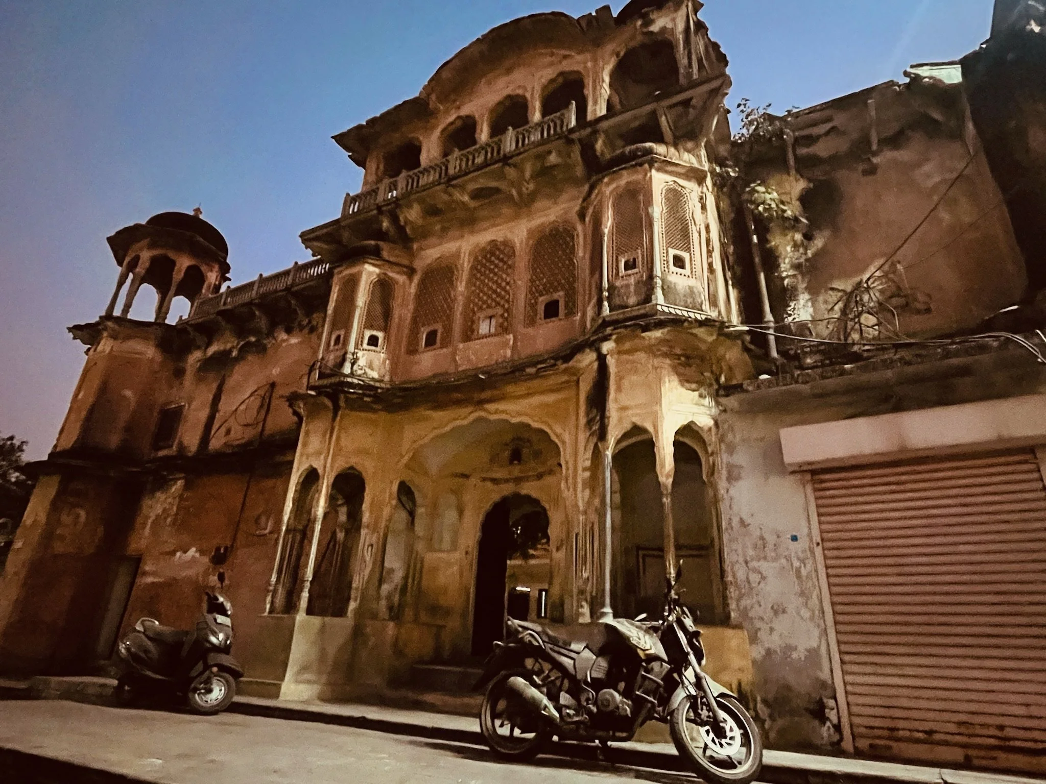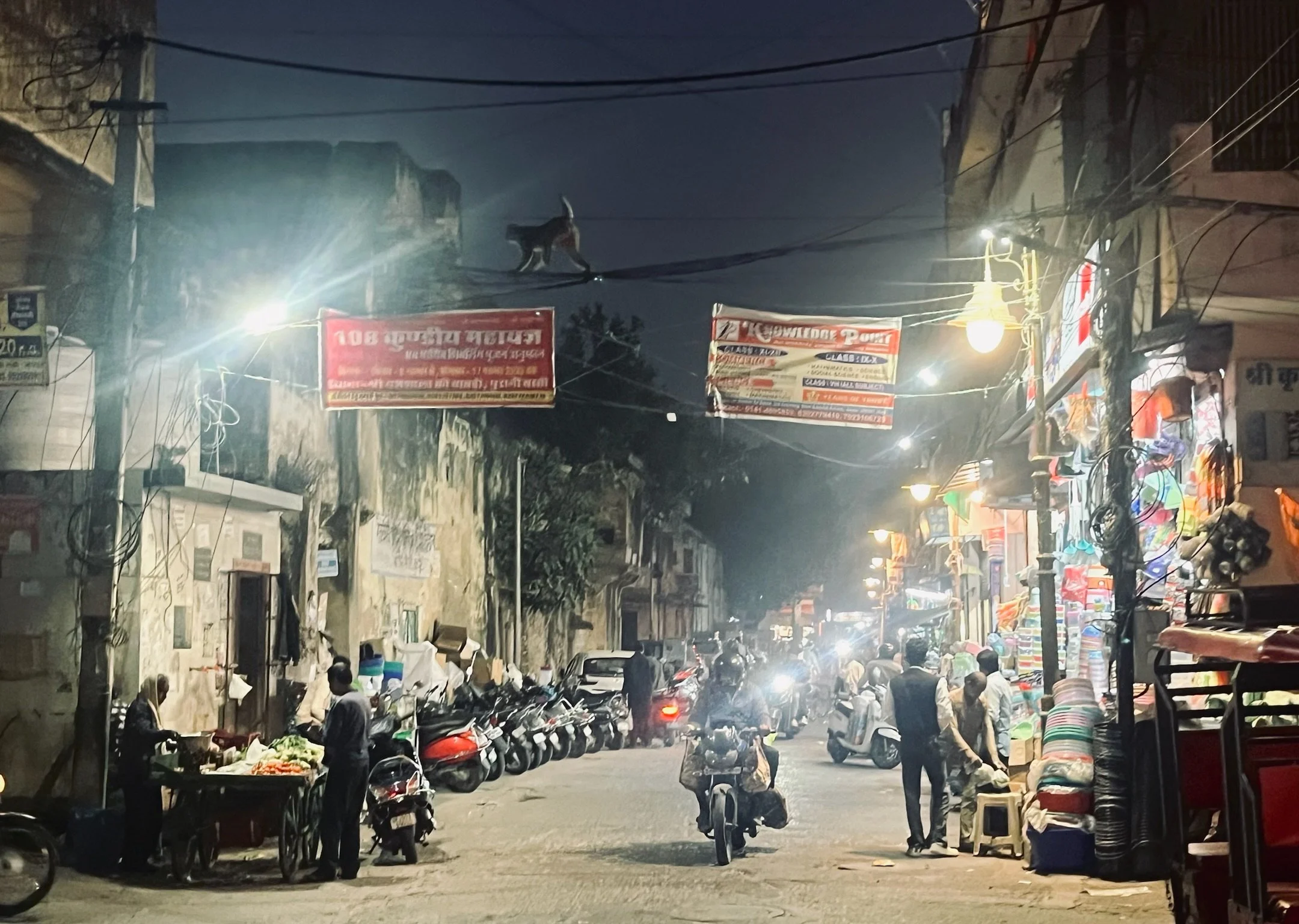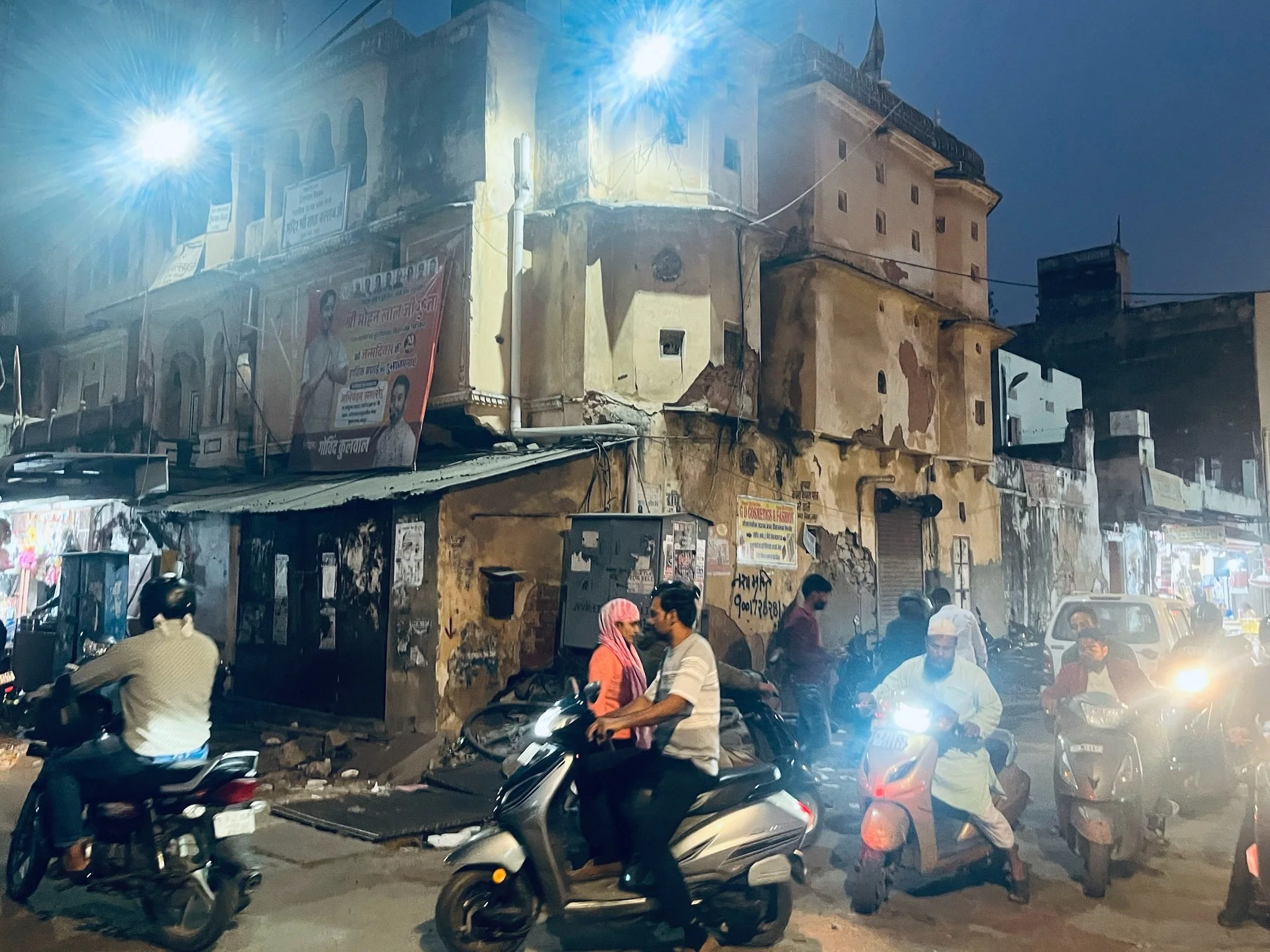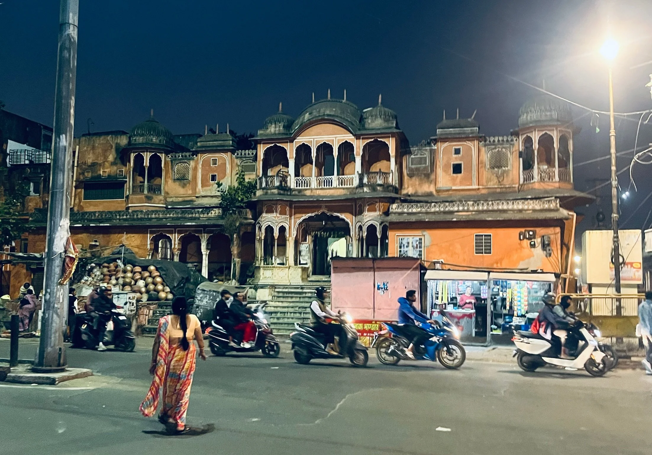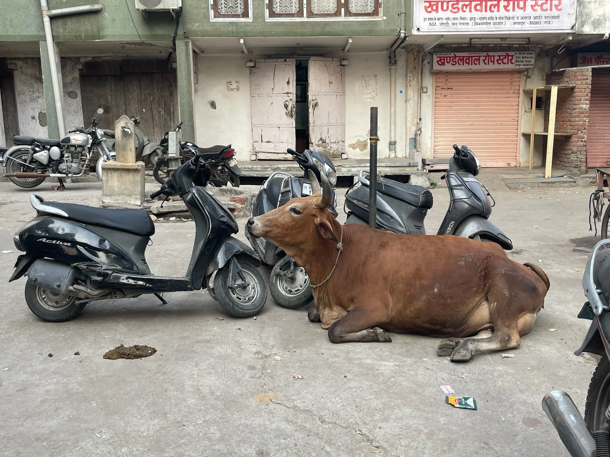 Die avond stelt Prakesh voor dat hij ons meeneemt naar een lokale plek om te eten, en we gaan graag op zijn uitnodiging in. Het is het begin van een dolle avond. Om te beginnen stelt hij voor dat we ernaartoe fietsen. Fietsen. In India. Senne en ik zijn wel wat Aziatische hectiek gewoon maar we hebben al eerder tegen elkaar gezegd dat het Jaipurees verkeer simpelweg onmogelijk zou zijn om zelf in te rijden. UIteindelijk gaan de kinderen op een fiets en wij wandelen ernaast. Het is gelukkig al wat later in de avond en we nemen kleinere steegjes dus Sam en Robin vinden het leuk en we komen heelhuids aan. We wandelen binnen in een plek waar rechts en links allemaal koeien staan. Gingen wij nu niet gaan eten? Voorbij de koeien moeten we onze schoenen uitdoen en zitten we opeens in een tempel. Het is een RamaSita tempel, gewijd aan Rama en Sita, de twee hoofdrolspelers van de Ramayana. Dat is een van de twee grote Hindoe verhalen, het andere epos is de Mahabharata. Hindu tempels zijn gewijd aan allemaal verschillende mythische figuren en goden, elk met hun eigenschappen Afhankelijk van wat je wenst ga je naar de ene of andere tempel; wil je meer kracht, naastenliefde, .. dan kies je een figuur met bijhorende tempel uit waar je naartoe gaat. Het lijkt een behoorlijk vrij interpreteerbaar geloof, en daarnaast is het ook gewoon de dagdagelijkse wandeling naar jouw tempel, waar uw maten zitten.