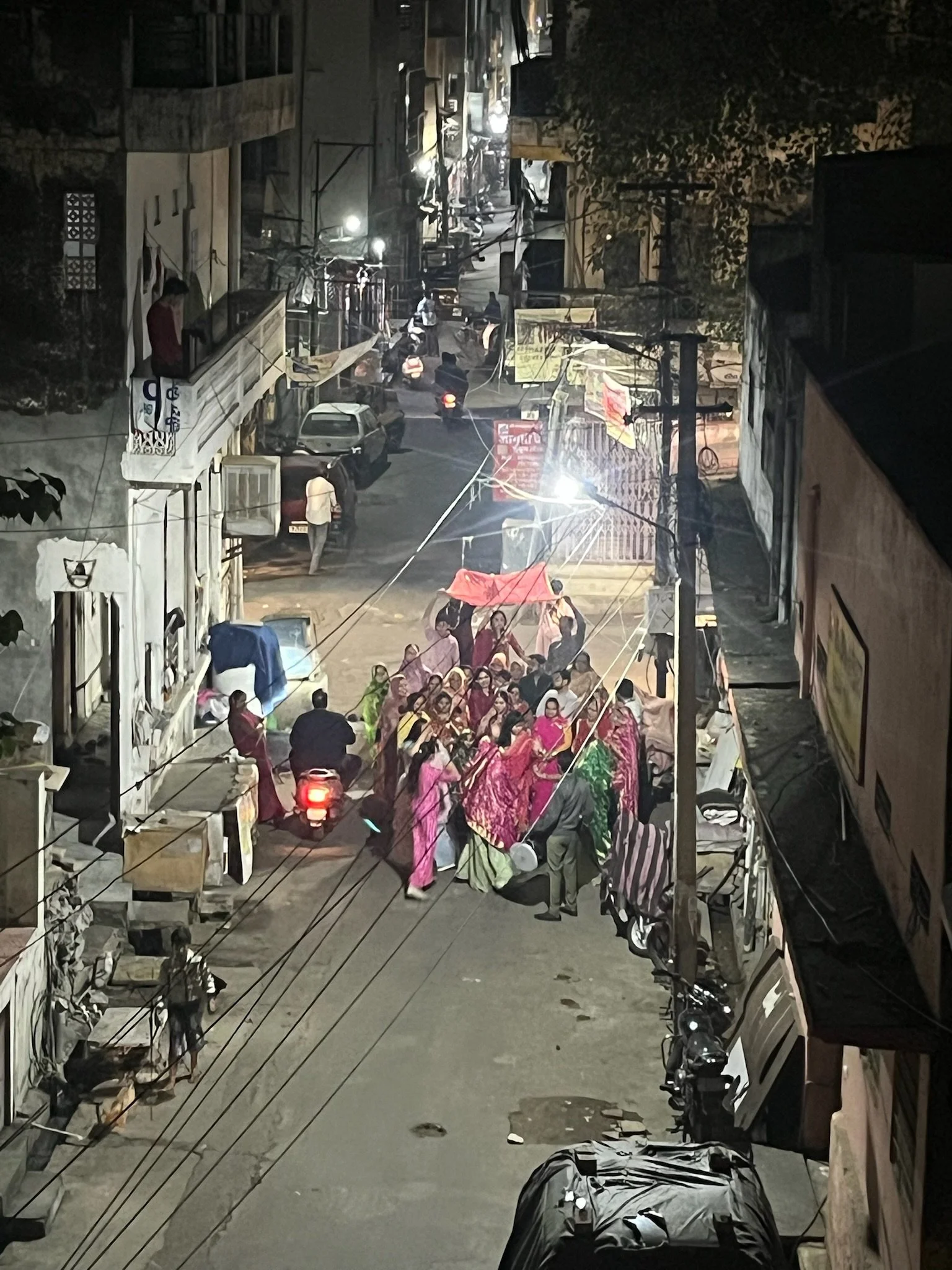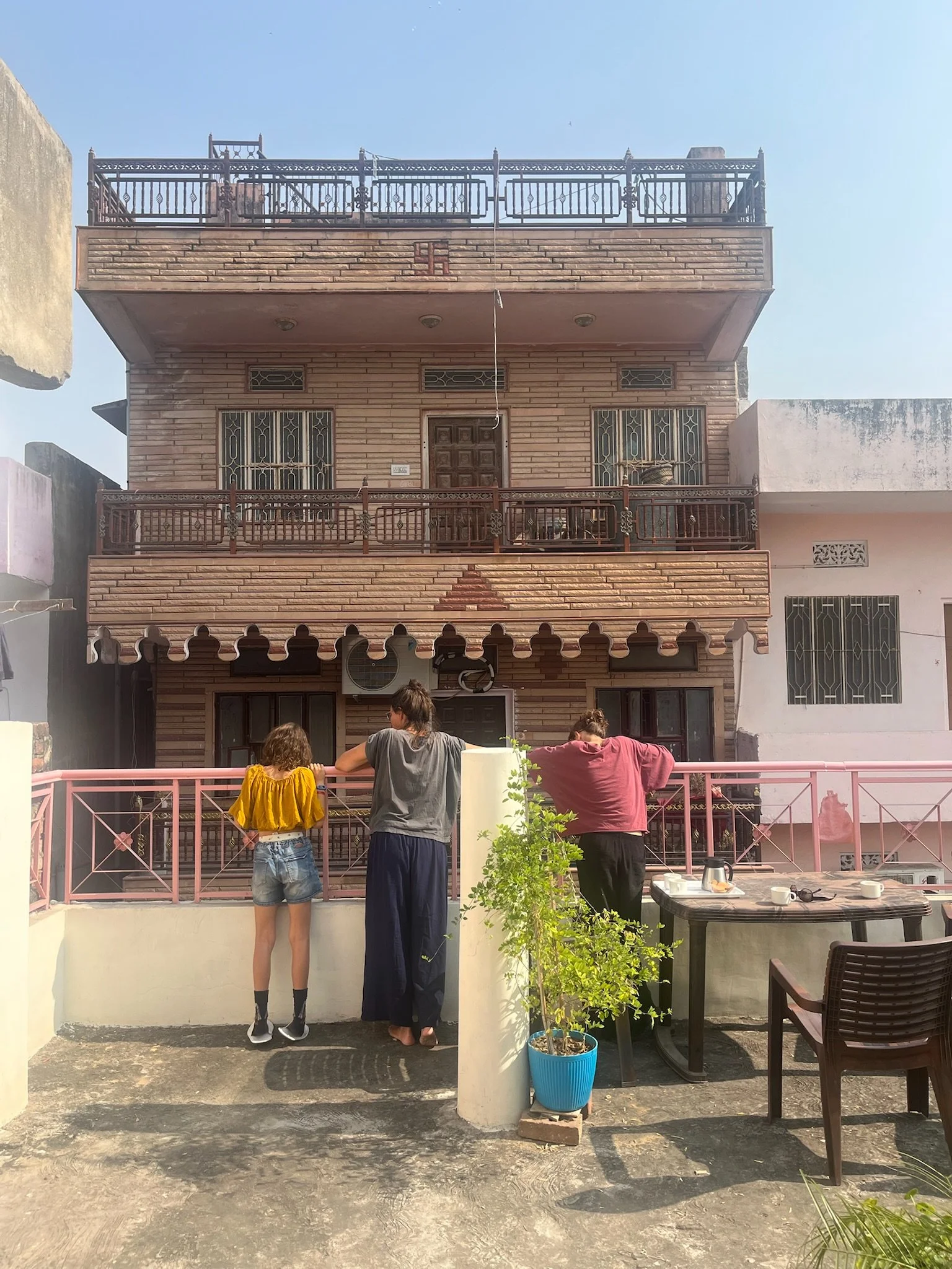 Van zodra je buitenkomt begint het avontuur en het stopt niet tot je weer op je kamer zit. En dat is ook echt iets wat je om de zoveel uur moet doen: terugkeren naar de Homestay om even te bekomen van alle indrukken. Onze ‘My Homestay Jaipur Soni 2700’ van eigenaar Prakesh is wel echt prachtig. Hij ligt in de oude stad, maar in een smal straatje zodat we de toeterende chaos niet echt horen, maar wel geregeld eens een koe, wat gekke krishna’s, een bruiloft of andere zottigheden zien passeren. Bij de bruiloft stonden we eerst nog veilig vanop het dakterras naar de gekke bende op straat te kijken tot we naar beneden werden geroepen en enkele minuten later met ons vieren stonden mee te dansen op straat tussen 20 versierde vrouwen en een prachtige bruid onder een parasolletje.