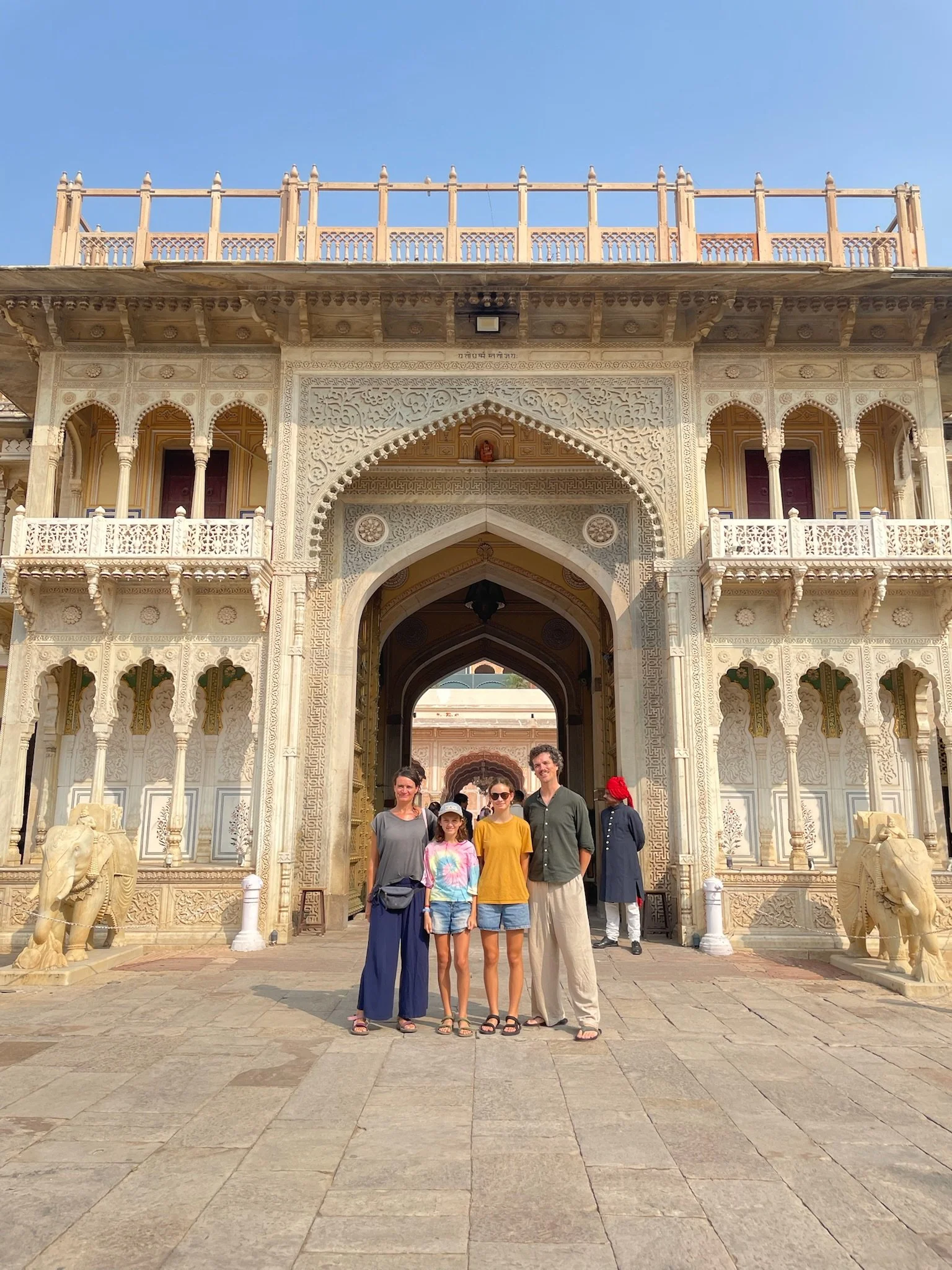 De City Palace is het stekje van de Maharadja van Jaipur, hij woont er trouwens nog, de huidige Mahardja. Hij is 27 en een fervent polo speler. Het paleis is gebouwd in de 18de eeuw toen Sawai Ja Sing II, de heerser van Jaipur, het gigantische Amer fort te klein begon te vinden. Het is een imposant paleis met veel binnenpleinen en kamers en mooi gedecoreerde poorten en toegangsdeuren. De muren zijn roze geverfd, een poging van de Maharadja om de koning van Engeland (die op bezoek kwam op het eind van de 18de eeuw) te imponeren. De gids neemt ons ook mee naar een zaal waar alle transportmiddelen van de Maharadja worden getoond; veel versierde olifantenmandjes en draagberries, hetzelfde voor de vrouwen maar met gesloten raampjes. We zien ook nog wat outfits van de koninklijke familie. Onder andere een piama van een 250 kilo zware Maharadja, dat is heel veel stof. Veel textiel is gemaakt met de block painting techniek, die typisch is voor Jaipur. Met zeer gedetailleerde uitgesneden stempels worden motieven op de stoffen gedrukt. Ik ben grote fan van deze stofjes en probeer me te bedwingen.