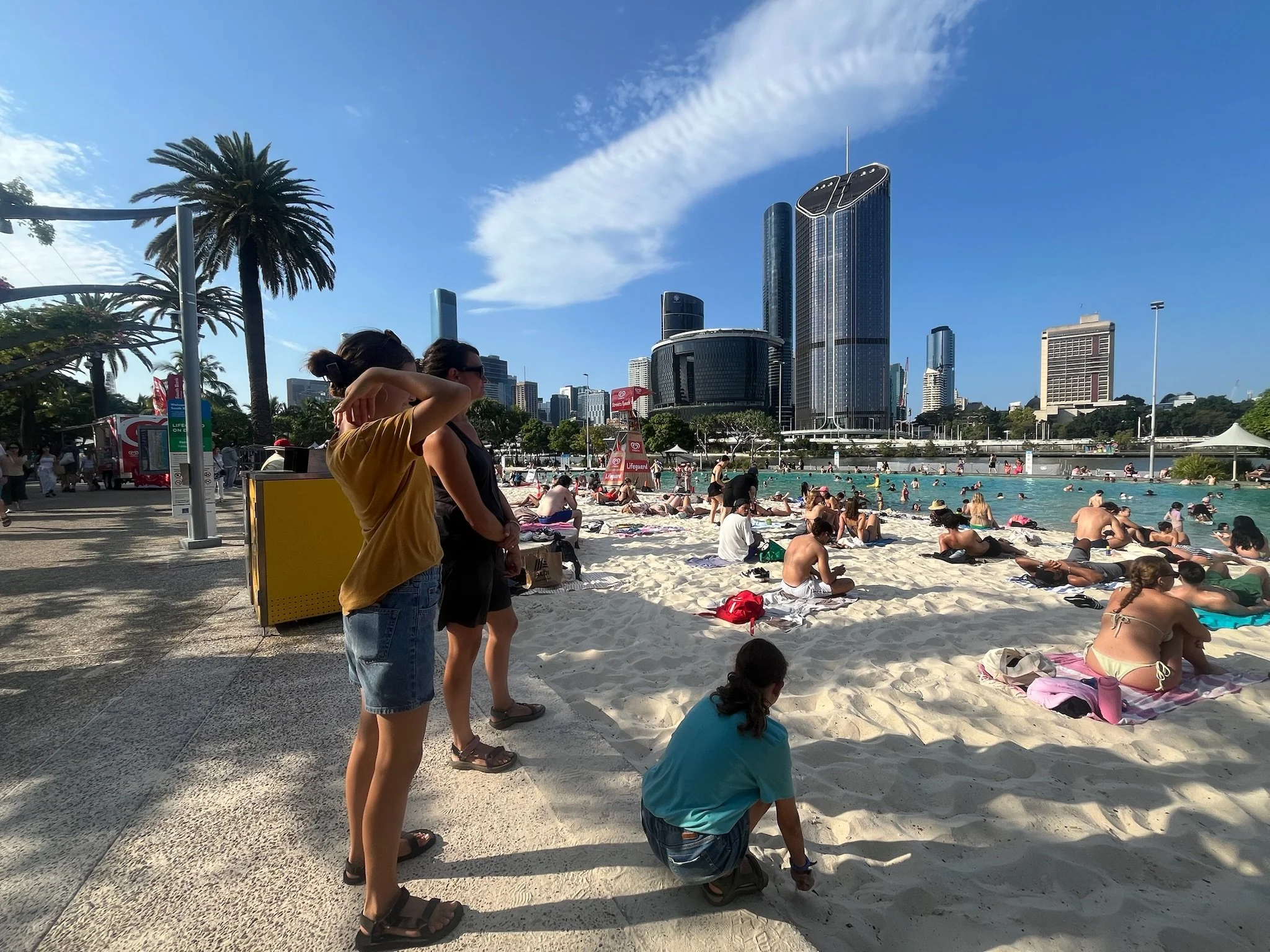 We arriveren met the Spirit of Queensland bij onze laatste bestemming: the very liveable and walkable Brisbane! We tsollen met onze valiezen het station uit voor een kleine wandeling naar ons hotel, maar halverwege beseft Robin dat ze haar uurwerk niet meer aanheeft, dus we wandelen in sneltempo terug naar het station, waar Robin haar uurwerk nog snel uit een WC kotje kan recupereren. Het is niet de eerste keer dat we al snel rechtsomkeer moeten maken; in Darwin zaten we, na onze vlucht, in de taxi op weg naar het centrum, toen Sam zich opeens realiseerde dat ze haar gsm niet meer had. Onze eerste woorden aan de Australische taxichauffeur waren: euhm, would you mind turning back, she forgot her cellphone on the airport. Waarna die man braaf omdraaide en terug naar de luchthaven reed, waar Sam uit de auto stapte en zag dat ze gewoon op haar gsm zat. Oops.