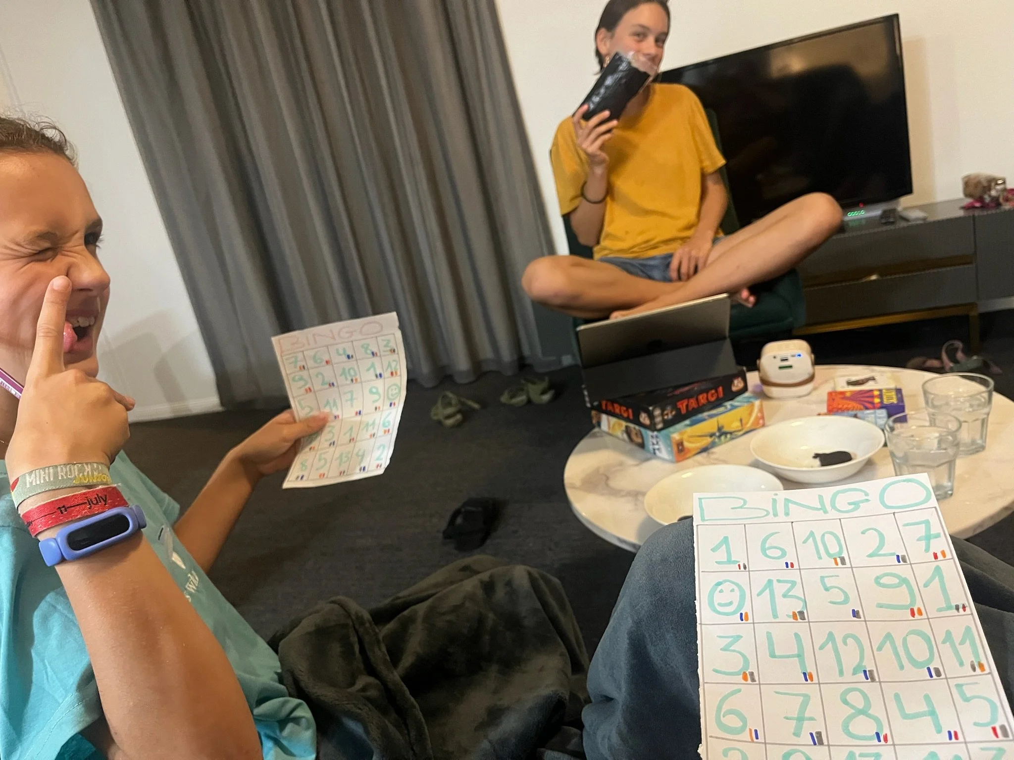 We hebben als laatste hotel een hoge toren geboekt, de CLLIX in het Central Business District (CBD) van Brisbane. We zitten op de 21ste verdieping en het zicht is echt wel een fantastisch. Ik durf amper op het terras te gaan staan. De kinderen zijn met hun hele restaurant-uitzet naar Brisbane verhuisd, dus al snel hangt ook hier de keuken vol met briefjes en aankondigingen. Er zijn opnieuw lunches, drankjes en lockers te verkrijgen. En je moet betalen met de kaart tegen hun muziekboxje dat telkens een blieb-geluidje maakt bij het afrekenen. De eerstvolgende surprise activity is Bingo! Robin wint, en dat treft, want de prijs was haar 15 Australische dollar die ze van een vriendinnetje had gekregen. Dus ze wint het volledige bedrag netjes terug! De volgende dag kan ze het bedrag opsouperen op de markt. Bedankt Amina!
