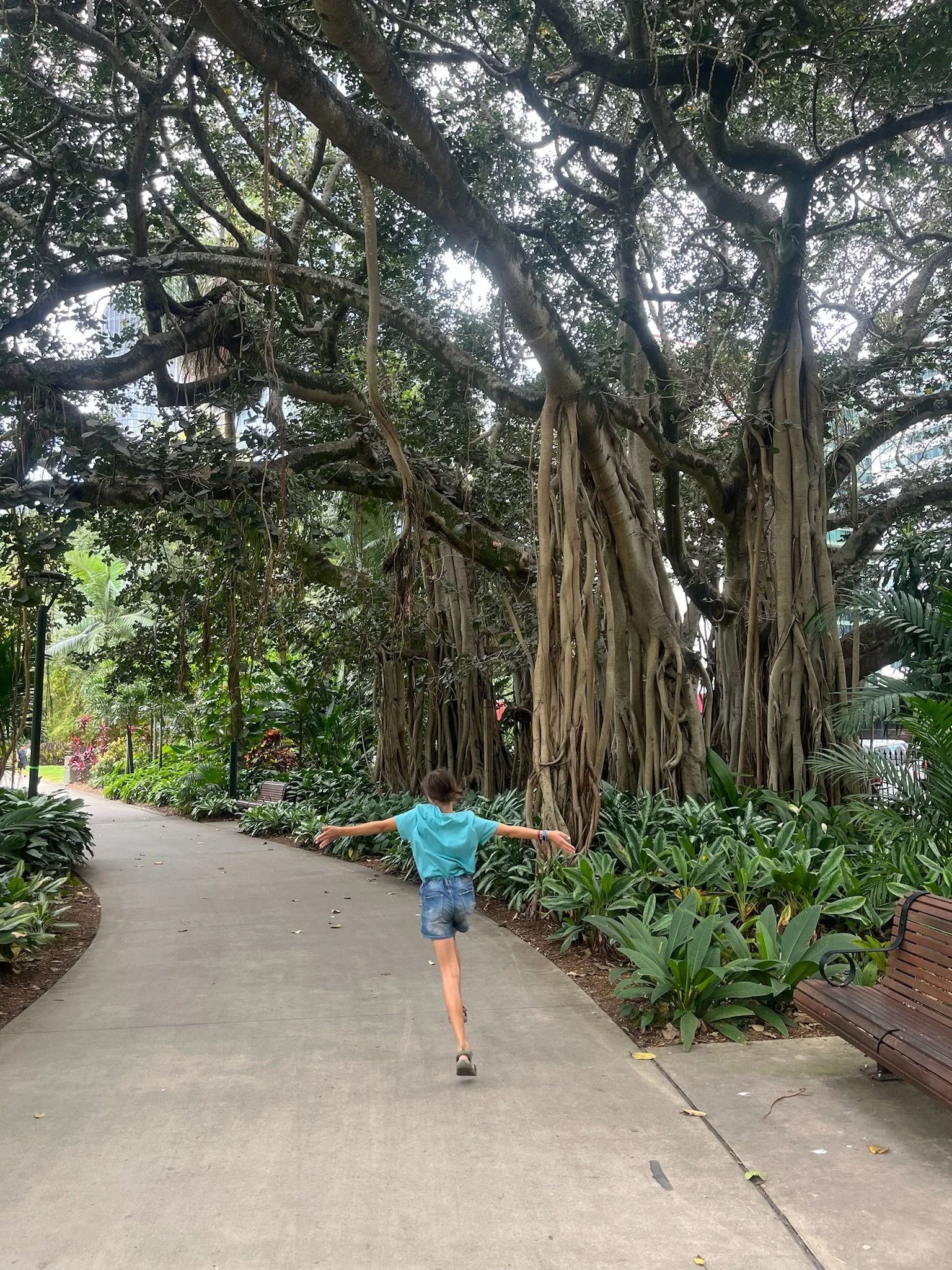 We gaan op verkenning in de wijk Fortitude Valley met de CityCat. Dat is de iconische populaire catamaran die over de Brisbane River vaart en de opvarenden voortdurend van straffe uitzichten voorziet. De Fortitude Valley is een iets ruigere wijk, die soms wat doet denken aan Berlijn, heel levendig, veel muziek en kleine ‘lanes’ zoals Bakery Lane, California Lane en Winn Lane. In die kleine straatjes zijn er caféetjes en leuke kleine creatieve shops. In de grotere straten errond zit er vooral veel ruig nachtleven en clubs, maar daarvoor is het nog wat te vroeg in de dag, en voor onze kinderen te vroeg in hun bestaan.