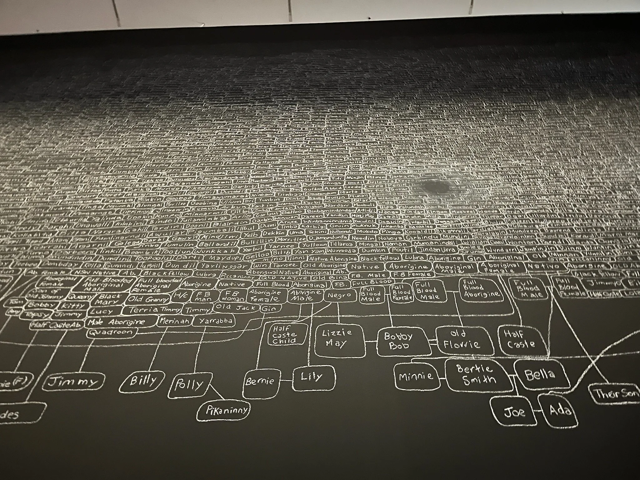 In deze buurt zit ook het GOMA, the Gallery of Modern Art. Het is een knap museum waar we de installatie ‘kith and kin’ van Archie Moore zien. Deze gaat over de lange geschiedenis van de First Nations in Australië, waarbij hij een monumentale familiestamboom met krijt op de muren en het plafond tekent. De stamboom gaat naar zijn voorouders, duizenden generaties terug, maar toont evenzeer de gaten, die er gekomen zijn door wreedheden van het kolonialisme of gewoon verlies van kennis. In het midden toont hij meticuleus gestapelde documenten van alle Aboriginals die in gevangenschap zijn omgekomen sedert de jaren 90, het is een indrukwekkende en vooral ook trieste hoop papier. Ik had die installatie al in de biënnale gezien, maar na onze kennismaking met de First Nations cultuur en realiteit hier in Australië, krijgt het deze keer krijgt wel meer context. Heel knap. Daarnaast is er werk van Rebecca Horn, Erwin Würm, en nog een hoop andere conceptuele grappenmakers ... en we kijken met de kindjes naar de fantastische video van Fischli en Weisch. Kortom, echt wel een tof museum, al zal je in de blogs van de kinderen vast en zeker een afwijkende mening lezen.