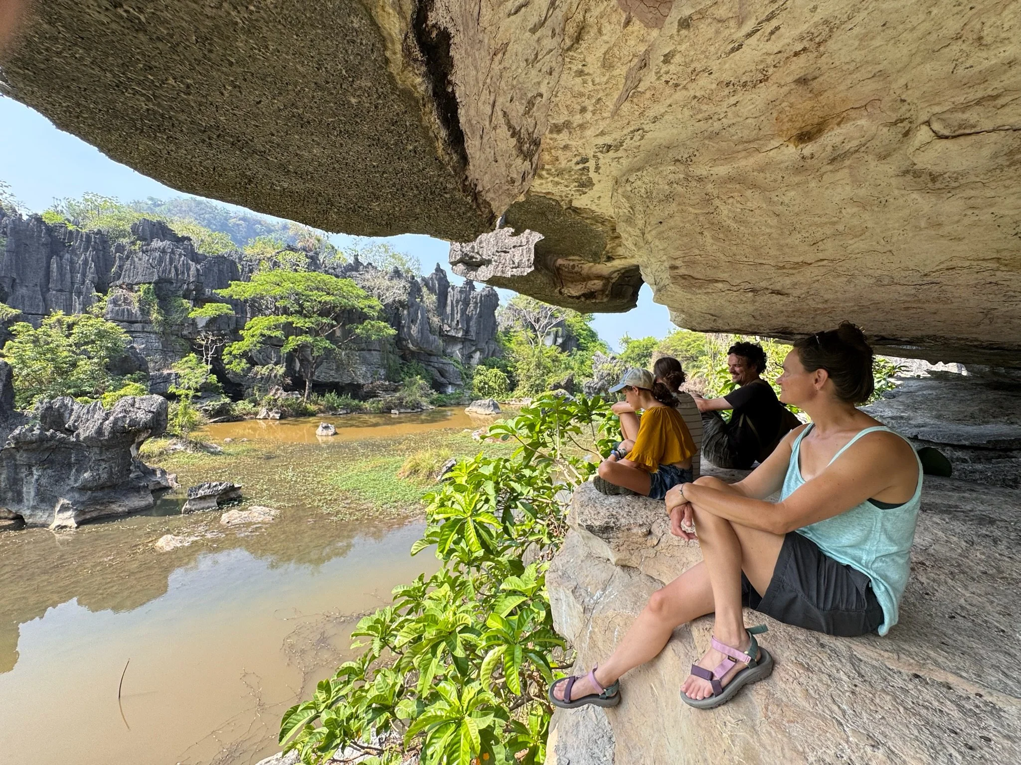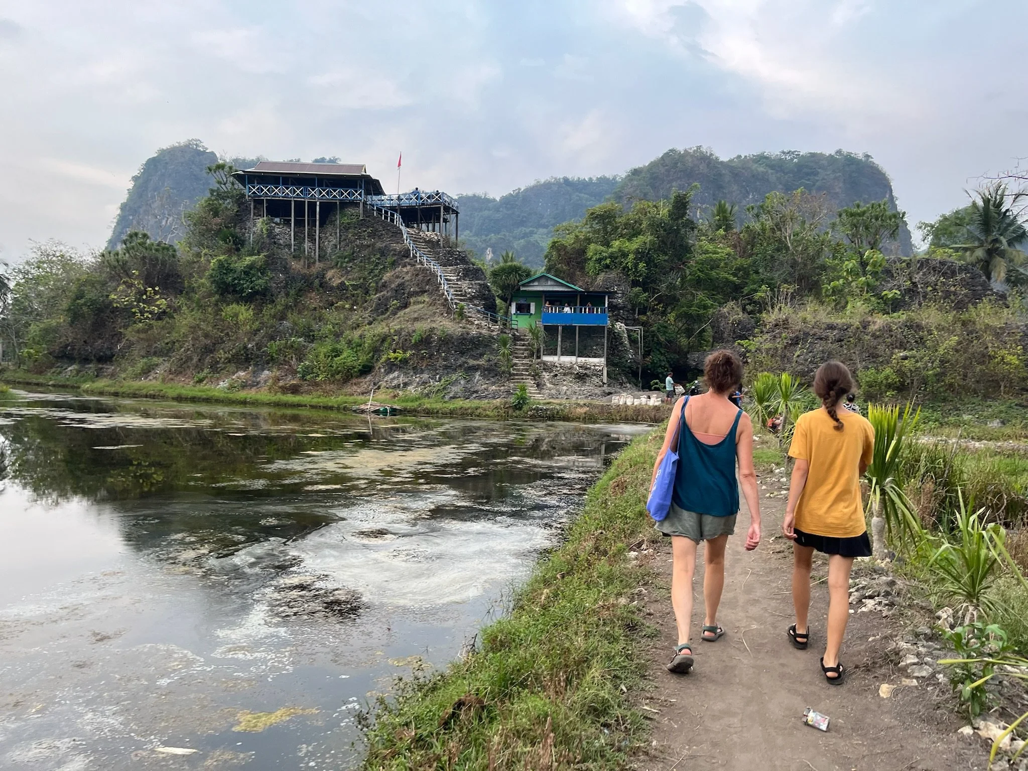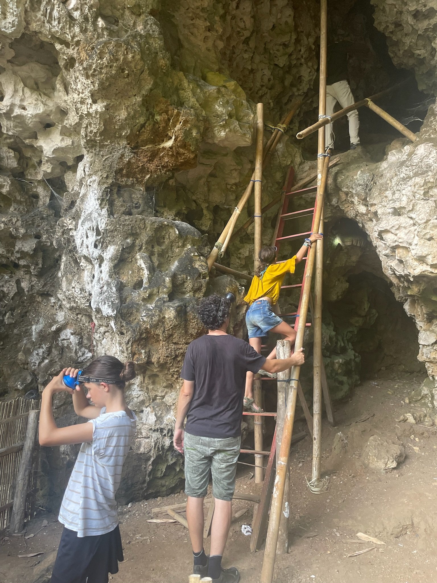 De volgende dag gaan we met Nasrul op zwier. Nasrul valt moeilijk te omschrijven, vooreerst is hij the only gay in the village, en hij wandelt door de karstgebergtes alsof hij door the Paris Fashion Week paradeert, onderwijl maakt hij nog wat planten-prints op onze armen en boven zijn wenkbrauwen (effortlessly chic and classy). Geheel volgens de verwachtingen blijkt hij toch wat verongelijkt te zijn dat we gisteren op eigen houtje al één van de hoogtepunten hebben bezocht, maar hij neemt ons graag mee naar het karst labyrint waar hij zijn jeugd heeft doorgebracht. Het karstige rotslandschap is het gevolg van eeuwenlange erosie en is een bijna sprookjesachtige omgeving om door te wandelen. Robin heeft al snel door dat Nasrul toch vooral graag over zichzelf bezig is, en daarnaast heeft hij een vreemd gevoel voor humor. Af en toe laat hij eens een mopje vallen over een 7 meter lange python die daar ‘zoek’ is geraakt, en hoe die een mensenlichaam wurgt en breekt. De kinderen are not amused. Hij heeft het onding op video, dus het beest bestaat wel degelijk, maar gelukkig heeft hij een klein twijgje vast waarmee hij van plan is om eventuele pythons af te weren.