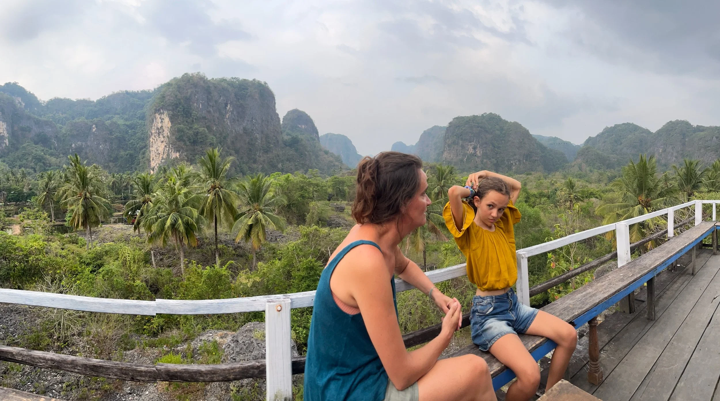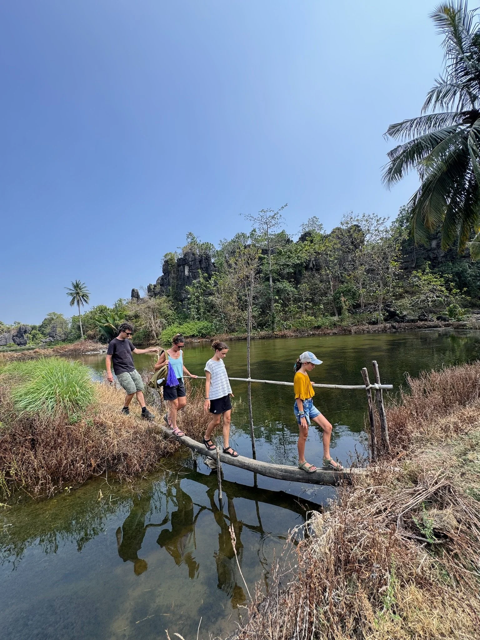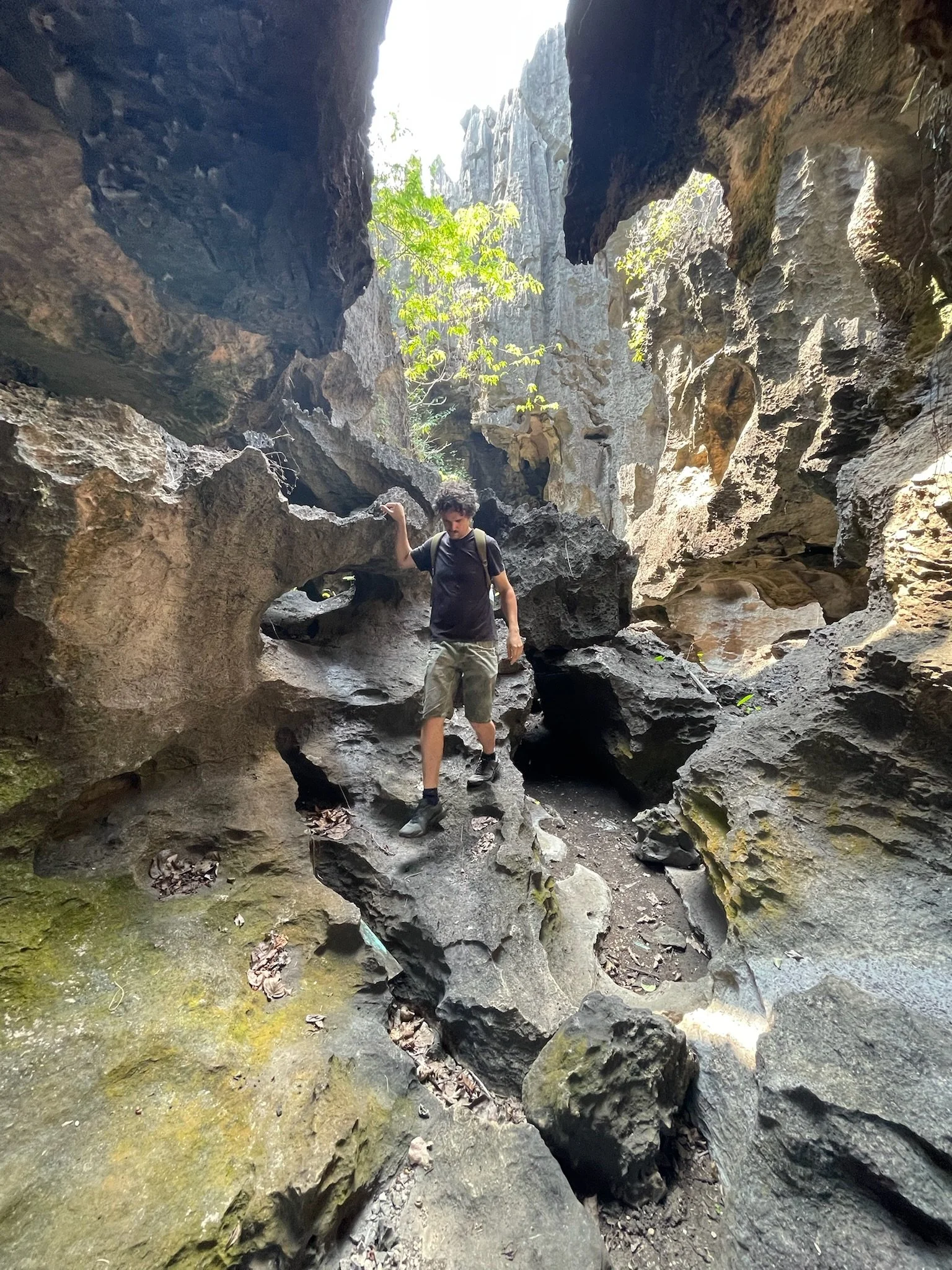 De volgende dag gaan we met Nasrul op zwier. Nasrul valt moeilijk te omschrijven, vooreerst is hij the only gay in the village, en hij wandelt door de karstgebergtes alsof hij door the Paris Fashion Week paradeert, onderwijl maakt hij nog wat planten-prints op onze armen en boven zijn wenkbrauwen (effortlessly chic and classy). Geheel volgens de verwachtingen blijkt hij toch wat verongelijkt te zijn dat we gisteren op eigen houtje al één van de hoogtepunten hebben bezocht, maar hij neemt ons graag mee naar het karst labyrint waar hij zijn jeugd heeft doorgebracht. Het karstige rotslandschap is het gevolg van eeuwenlange erosie en is een bijna sprookjesachtige omgeving om door te wandelen. Robin heeft al snel door dat Nasrul toch vooral graag over zichzelf bezig is, en daarnaast heeft hij een vreemd gevoel voor humor. Af en toe laat hij eens een mopje vallen over een 7 meter lange python die daar ‘zoek’ is geraakt, en hoe die een mensenlichaam wurgt en breekt. De kinderen are not amused. Hij heeft het onding op video, dus het beest bestaat wel degelijk, maar gelukkig heeft hij een klein twijgje vast waarmee hij van plan is om eventuele pythons af te weren.