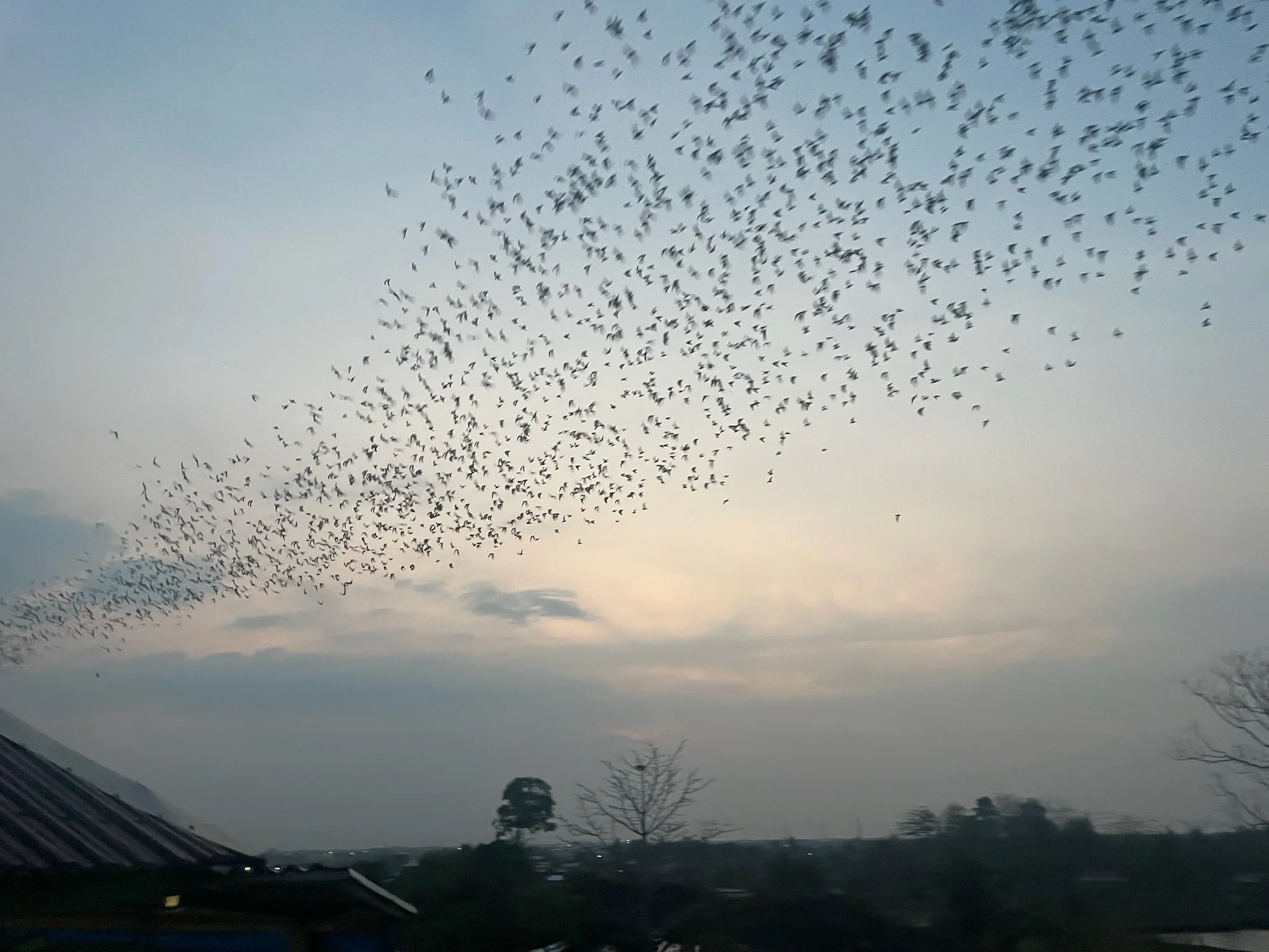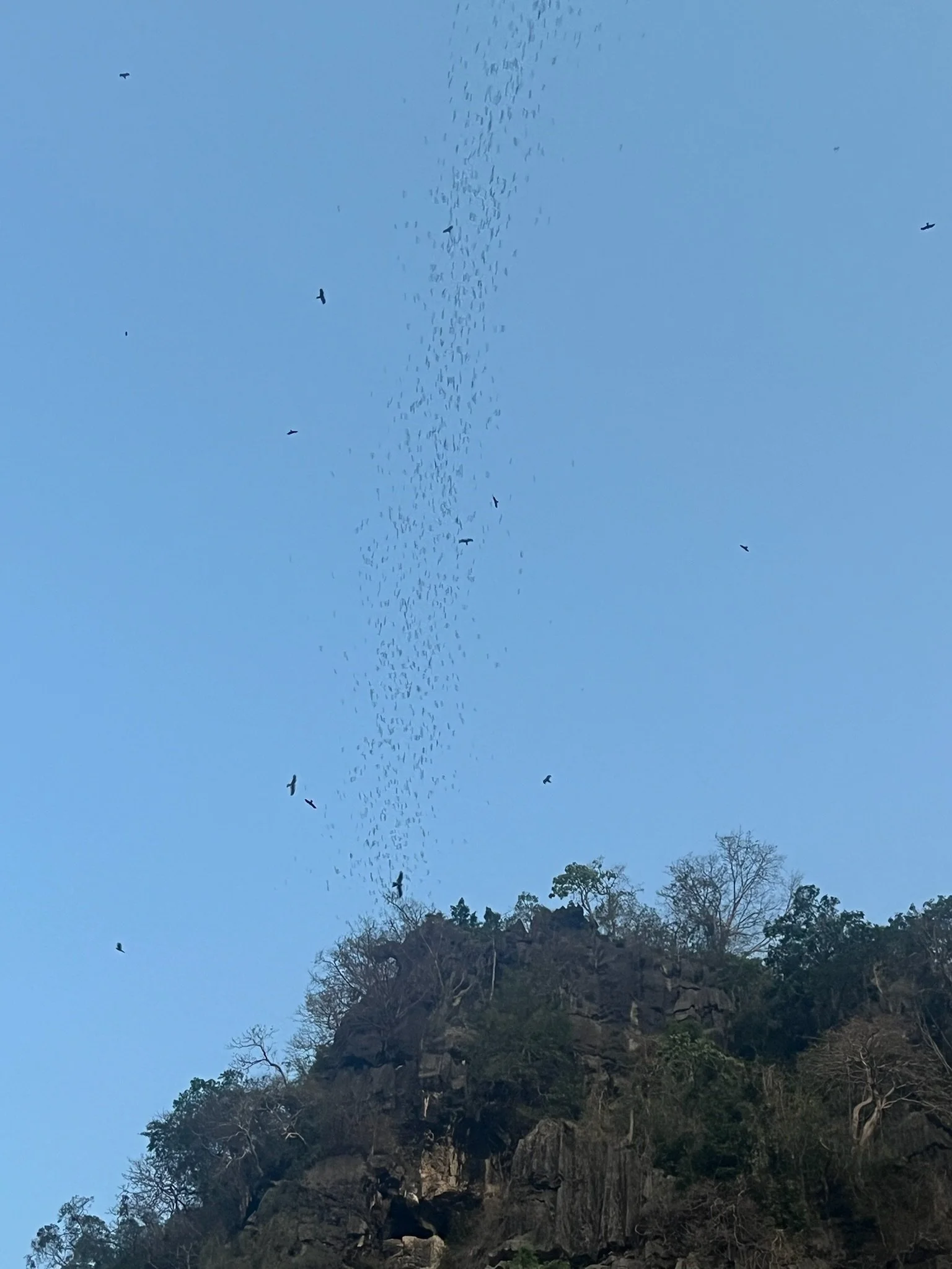 Nasrul had ons deze plaats aangeraden omdat we hier een grote zwerm vleermuizen zouden zien uitvliegen uit hun caves, en wel om 18u. Het is 18:10 en we vragen eens rond aan de andere locals in de bar of er hier ‘misschien bats te zien zijn?’.. maar aangezien bijna niemand hier Engels kan, lijkt het alsof we niet op de juiste plaats zijn.. waarna er opeens duizenden! bats over ons hoofd vliegen als laag hangende wolken, een ware Hitchcock belevenis! We horen ze fladderen over onze hoofden.