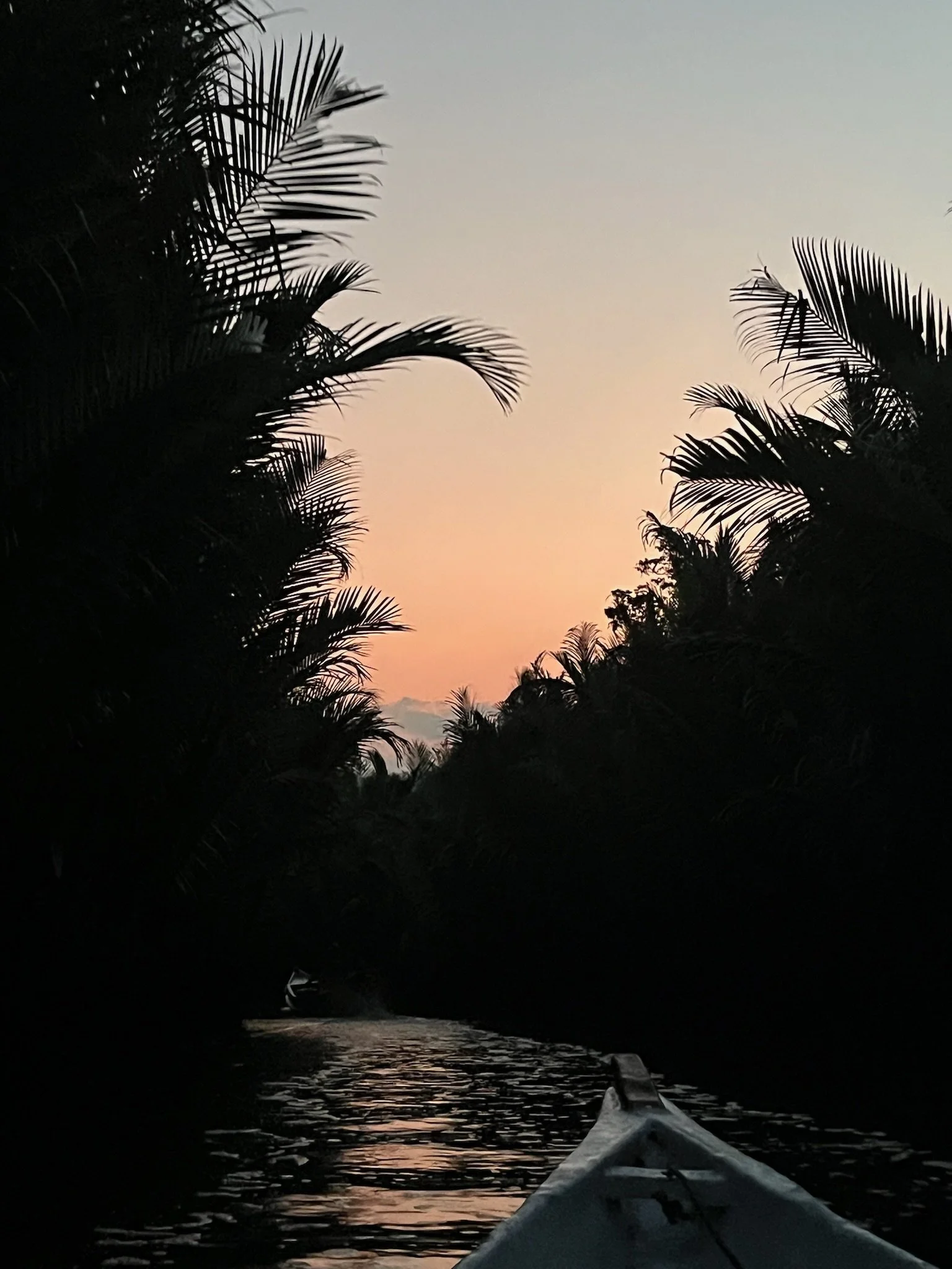 Het vreemde dorpje bestaat uit 1 lang pad dat we helemaal rondstappen - met uiteraard hier en daar een stop voor een fotomomentje met Nasrul. Onderweg komen we een boom tegen met een plastiek zak erin, waarbij Nasrul langs zijn neus weg vertelt dat daar ‘een placenta in zit’. Voor het eerst krijgt Nasrul de aandacht van het voltallige gezin en horen we hem aan de twee meisjes uitleggen wat hij net verteld heeft. Het wordt een interessant gesprek. Op de terugweg stoppen we met ons bootje net onder de ‘uitgang’ van de vleermuizen cave. We zien opnieuw de oneindige zwerm vleermuizen de grot verlaten, met daartussen tientallen arenden die de hele tijd door de sliert vliegen voor een heerlijk avondmaal.