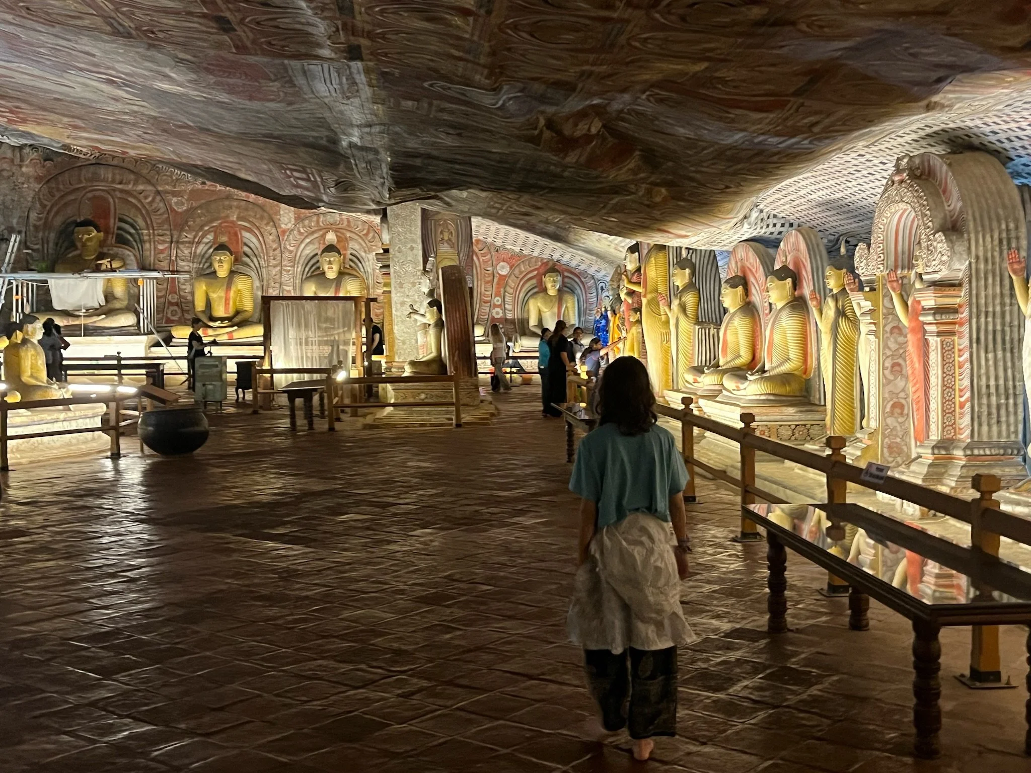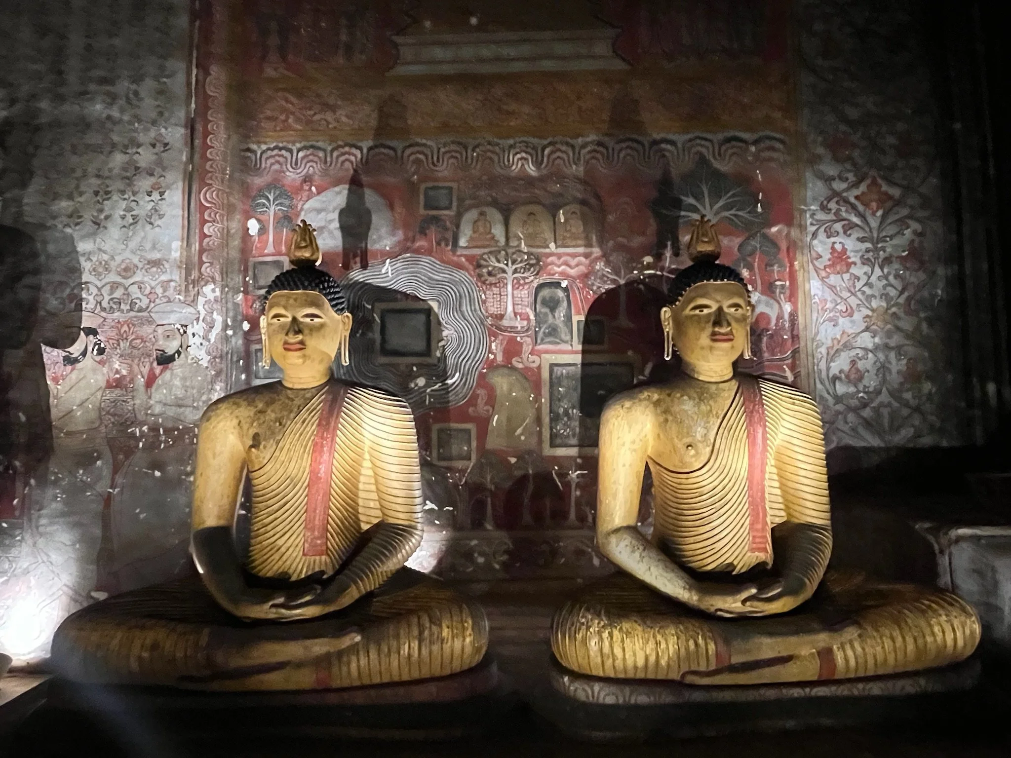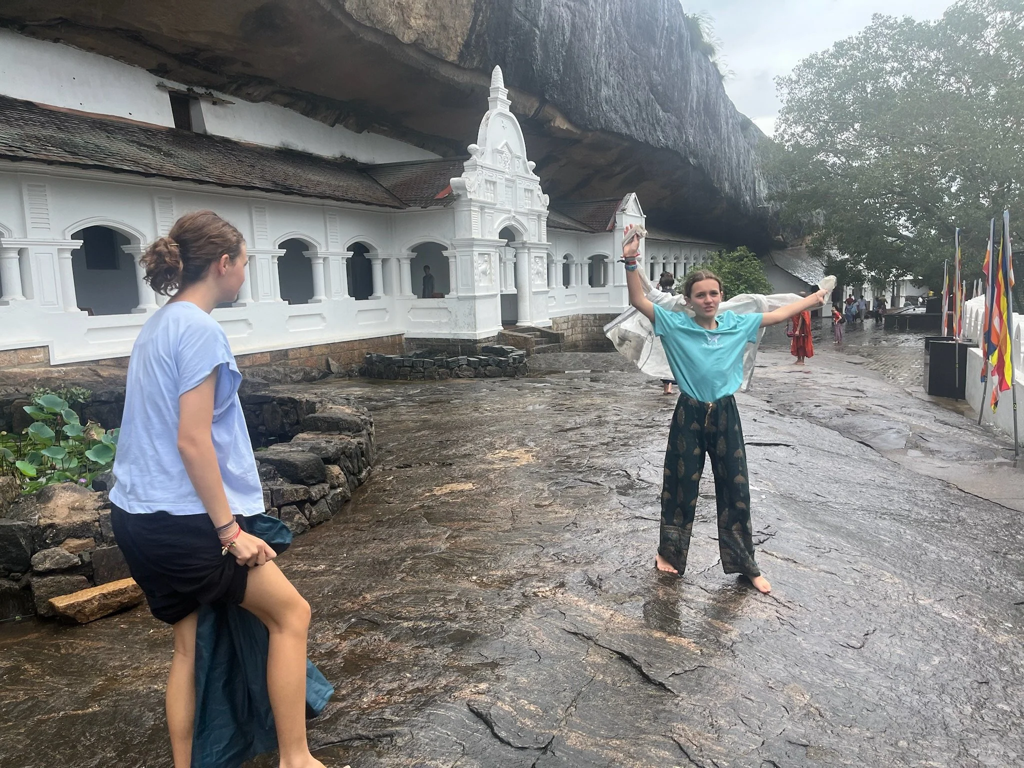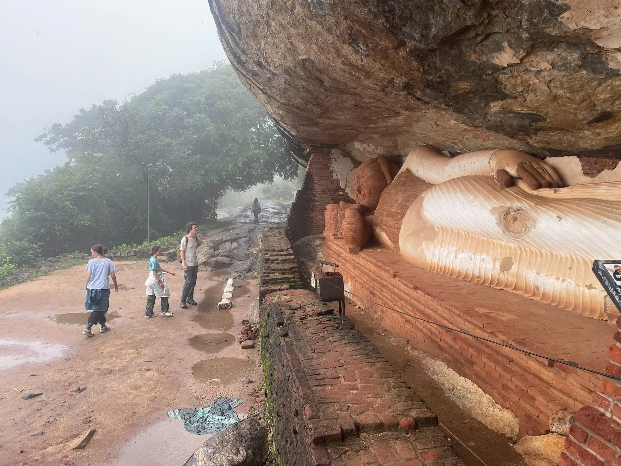 Sri Lanka heeft twee moessons: de North East Monsoon zorgt voor regen in het noorden en oosten tussen november en maart en de South West Monsoon doet hetzelfde in het zuiden en westen tussen mei en september. Als je in ‘t midden zit is het dus met wat tegenslag de hele tijd nat. En laat Sigiriya nu toevallig niet net dáár liggen, zeg. De eerste dag dat we’r zijn valt de regen met bakken uit de lucht. We doen niet veel, trachten onze was te drogen (dat mislukt), proberen een spelletje te spelen (als de stroom het niet laat afweten en we voldoende licht hebben) en lunchen ‘s middags ergens waar ze de grond vol houten paletten gelegd hebben om toch maar niet te verdrinken. Zicht op de Leeuwenrots, dat wel. We hopen dat het de volgende dag beter wordt en overwegen brommertjes te huren om ‘s morgens vroeg naar Pidurangula te rijden. Er doen allerlei verhalen de ronde over wilde olifanten die voornamelijk tussen 21 uur 's avonds en 5 uur's ochtends op pad zijn. We weten niet precies wat we ervan moeten denken, maar de regen lijkt ons vervelender dan een olifant, dus we beslissen om even het weer af te wachten alvorens de knoop door te hakken. En maar goed ook. De volgende ochtend hebben we de wekker heel vroeg gezet om de sunrise op de rots mee te pikken, maar ‘t giet nog maar eens water. We kruipen terug in bed en springen een paar uur later dan maar in een tuk tuk richting Dambula. Dat zijn boeddhistische tempels in een grottencomplex en daarover kan je veel zeggen, kinderen, maar niet dat het er niet droog is.