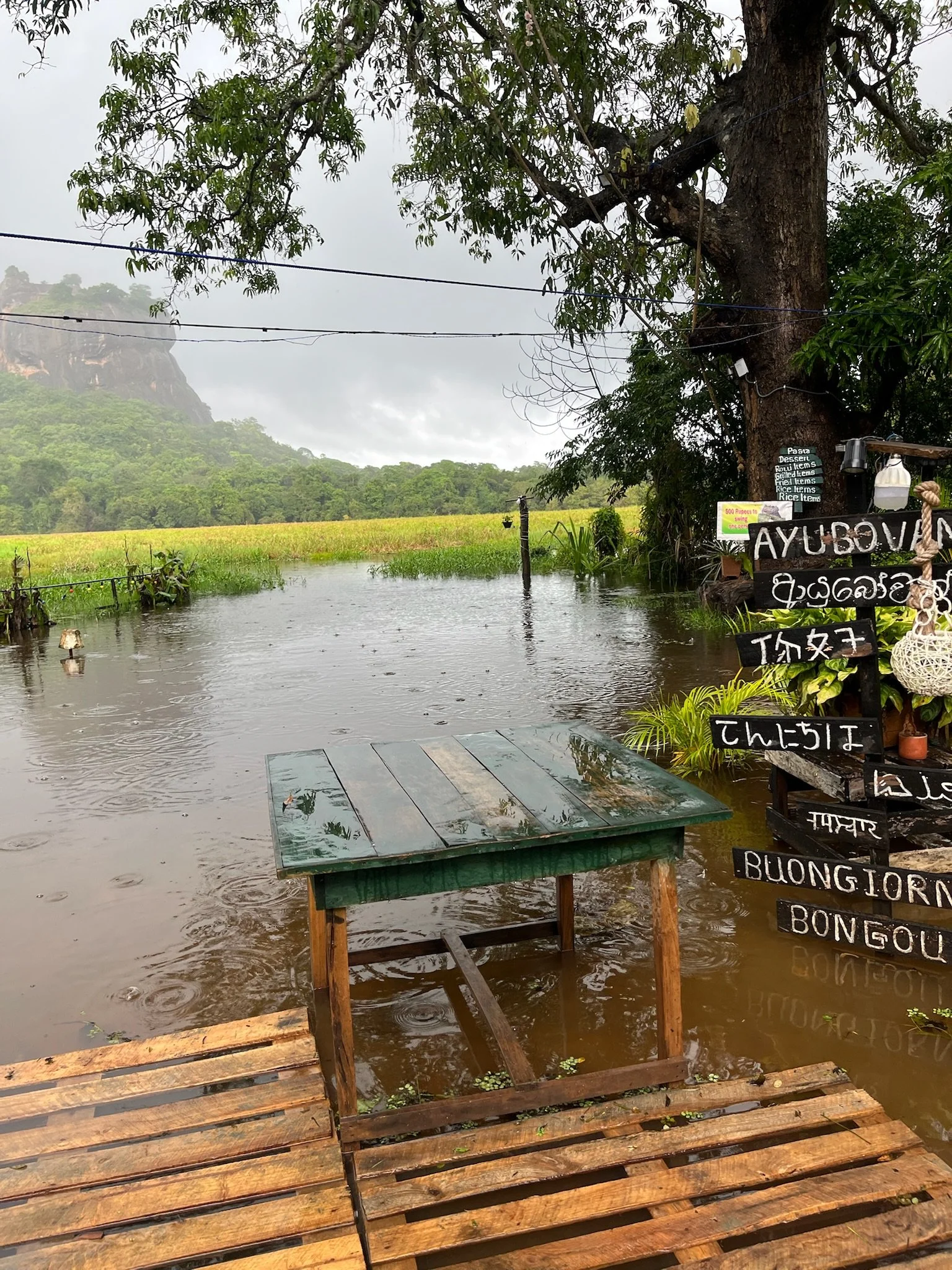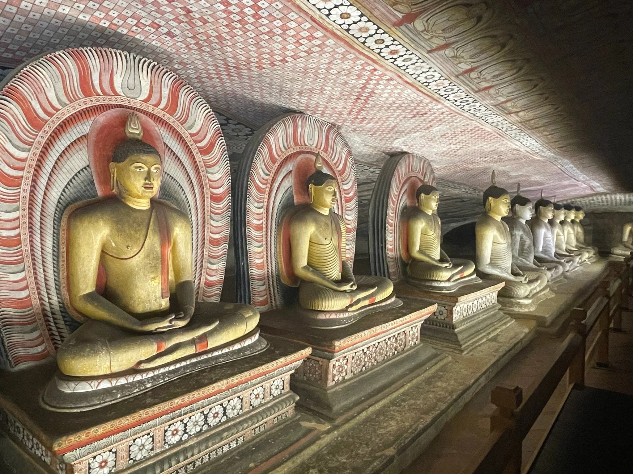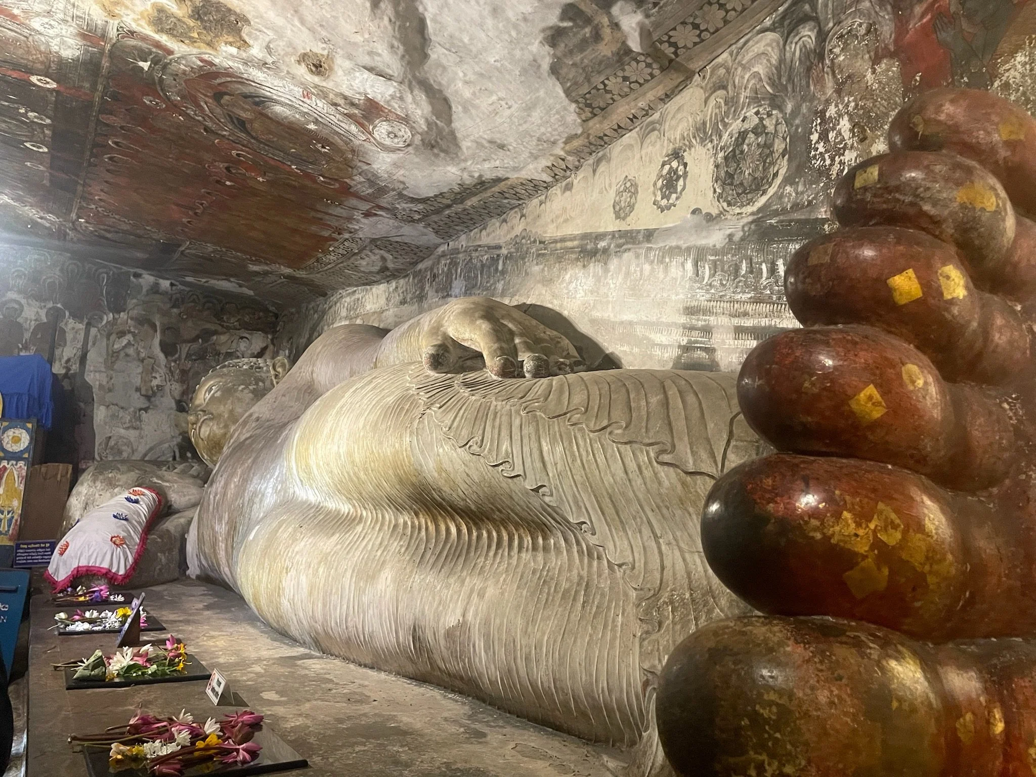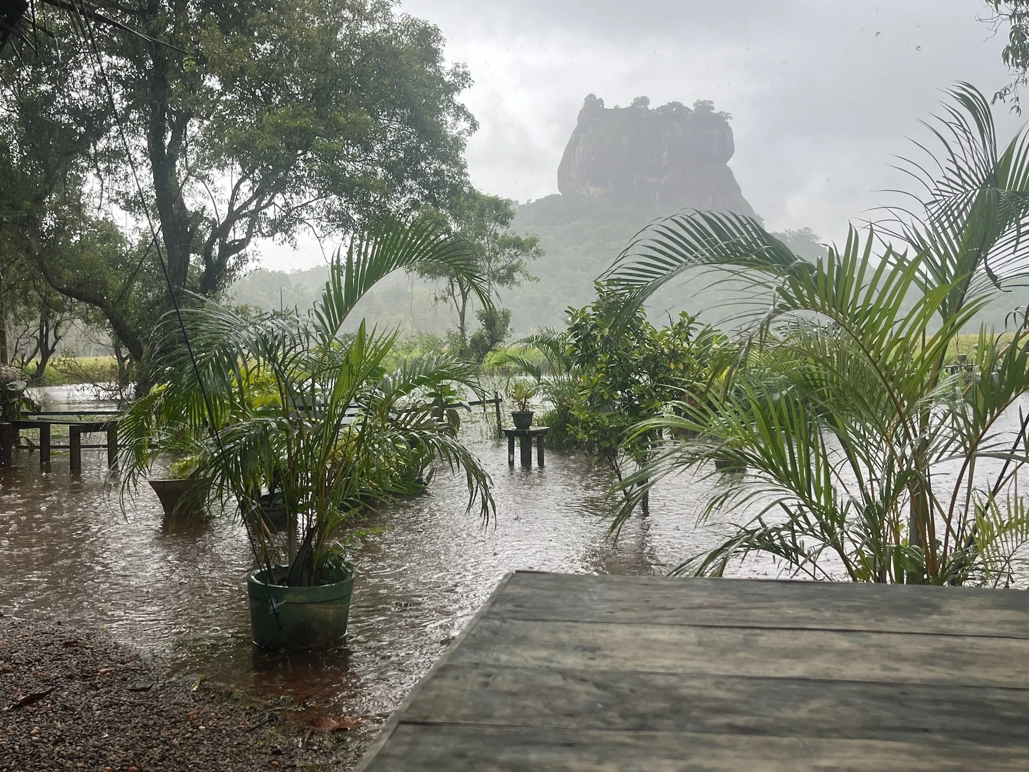 Sri Lanka heeft twee moessons: de North East Monsoon zorgt voor regen in het noorden en oosten tussen november en maart en de South West Monsoon doet hetzelfde in het zuiden en westen tussen mei en september. Als je in ‘t midden zit is het dus met wat tegenslag de hele tijd nat. En laat Sigiriya nu toevallig niet net dáár liggen, zeg. De eerste dag dat we’r zijn valt de regen met bakken uit de lucht. We doen niet veel, trachten onze was te drogen (dat mislukt), proberen een spelletje te spelen (als de stroom het niet laat afweten en we voldoende licht hebben) en lunchen ‘s middags ergens waar ze de grond vol houten paletten gelegd hebben om toch maar niet te verdrinken. Zicht op de Leeuwenrots, dat wel. We hopen dat het de volgende dag beter wordt en overwegen brommertjes te huren om ‘s morgens vroeg naar Pidurangula te rijden. Er doen allerlei verhalen de ronde over wilde olifanten die voornamelijk tussen 21 uur 's avonds en 5 uur's ochtends op pad zijn. We weten niet precies wat we ervan moeten denken, maar de regen lijkt ons vervelender dan een olifant, dus we beslissen om even het weer af te wachten alvorens de knoop door te hakken. En maar goed ook. De volgende ochtend hebben we de wekker heel vroeg gezet om de sunrise op de rots mee te pikken, maar ‘t giet nog maar eens water. We kruipen terug in bed en springen een paar uur later dan maar in een tuk tuk richting Dambula. Dat zijn boeddhistische tempels in een grottencomplex en daarover kan je veel zeggen, kinderen, maar niet dat het er niet droog is.