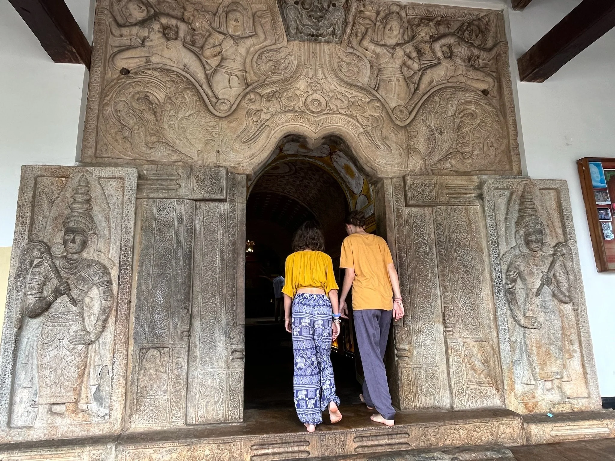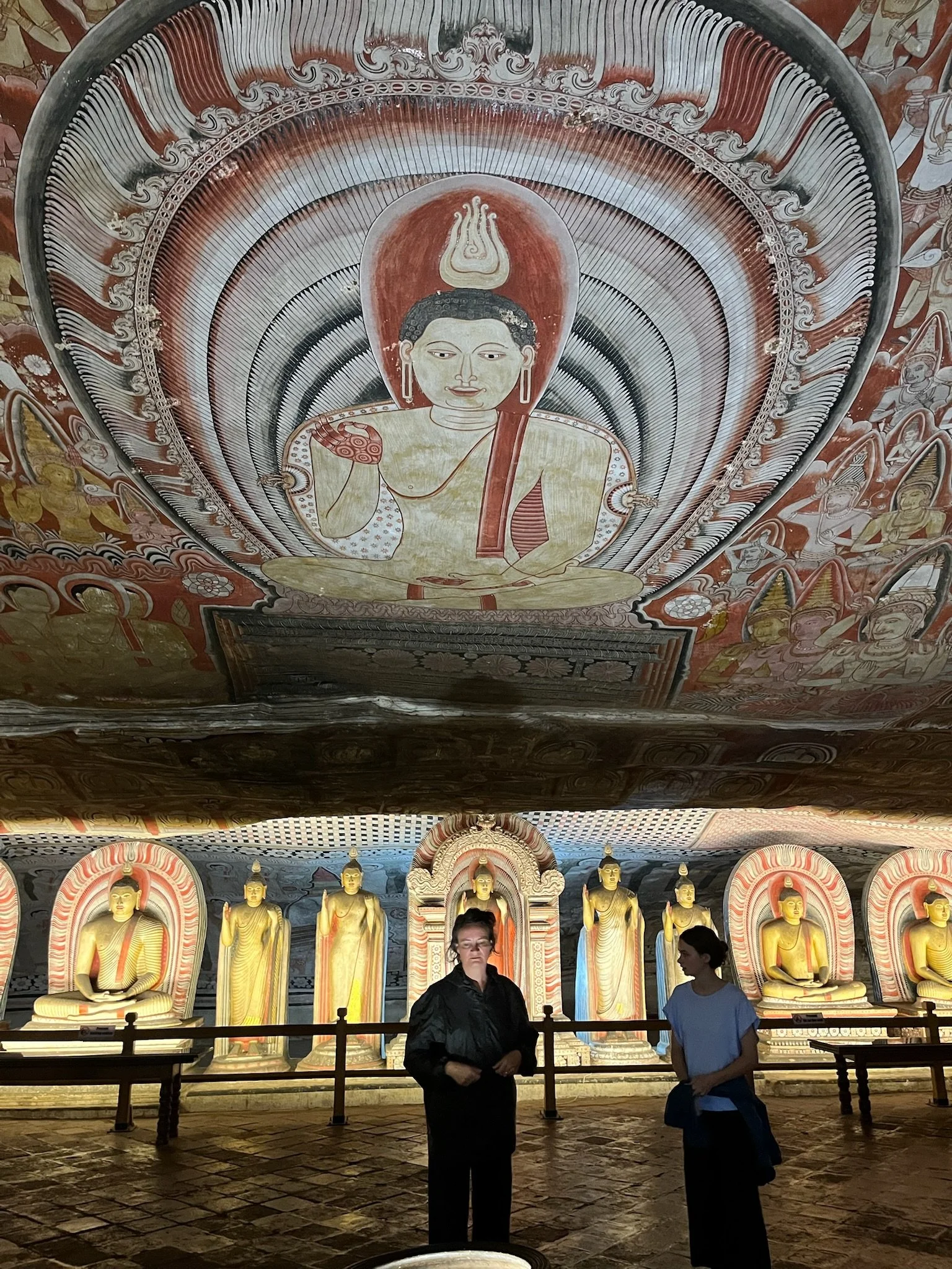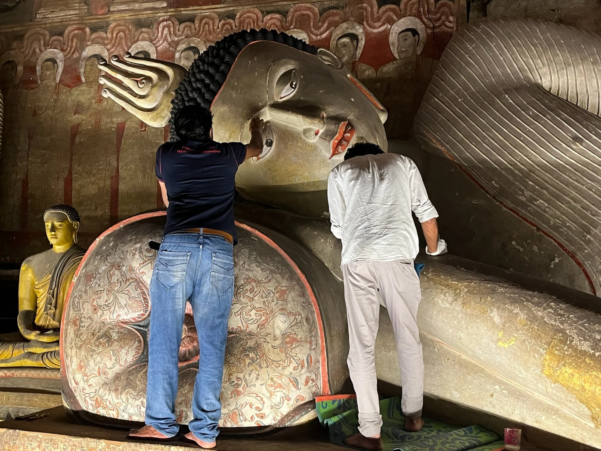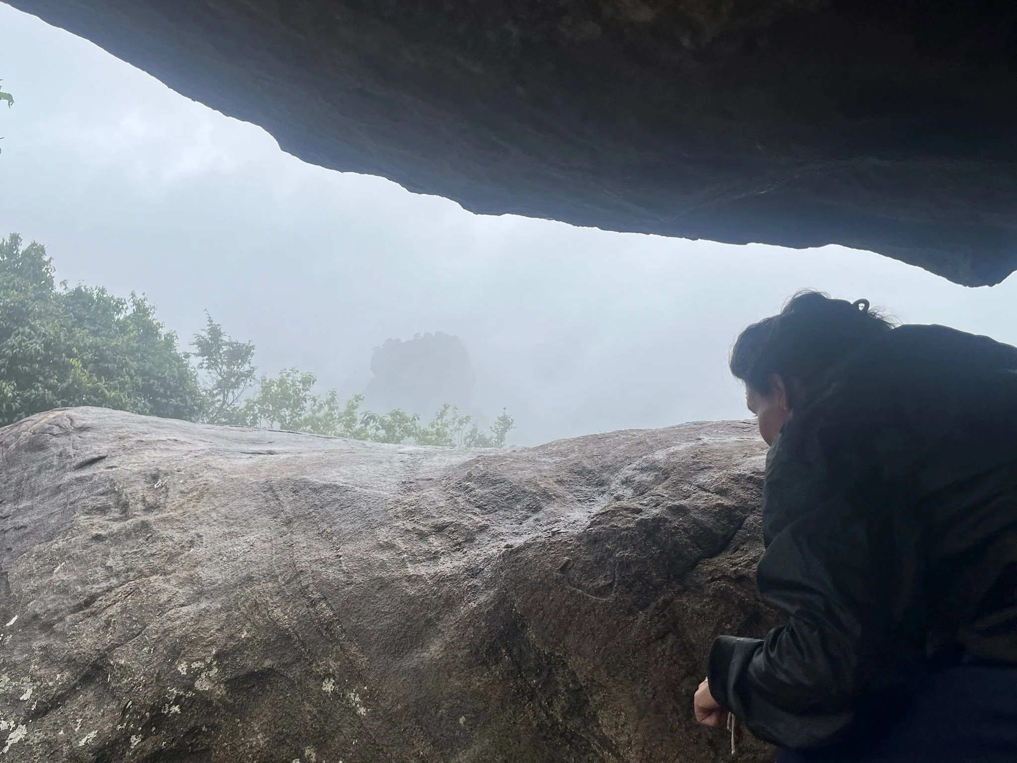 Sri Lanka heeft twee moessons: de North East Monsoon zorgt voor regen in het noorden en oosten tussen november en maart en de South West Monsoon doet hetzelfde in het zuiden en westen tussen mei en september. Als je in ‘t midden zit is het dus met wat tegenslag de hele tijd nat. En laat Sigiriya nu toevallig niet net dáár liggen, zeg. De eerste dag dat we’r zijn valt de regen met bakken uit de lucht. We doen niet veel, trachten onze was te drogen (dat mislukt), proberen een spelletje te spelen (als de stroom het niet laat afweten en we voldoende licht hebben) en lunchen ‘s middags ergens waar ze de grond vol houten paletten gelegd hebben om toch maar niet te verdrinken. Zicht op de Leeuwenrots, dat wel. We hopen dat het de volgende dag beter wordt en overwegen brommertjes te huren om ‘s morgens vroeg naar Pidurangula te rijden. Er doen allerlei verhalen de ronde over wilde olifanten die voornamelijk tussen 21 uur 's avonds en 5 uur's ochtends op pad zijn. We weten niet precies wat we ervan moeten denken, maar de regen lijkt ons vervelender dan een olifant, dus we beslissen om even het weer af te wachten alvorens de knoop door te hakken. En maar goed ook. De volgende ochtend hebben we de wekker heel vroeg gezet om de sunrise op de rots mee te pikken, maar ‘t giet nog maar eens water. We kruipen terug in bed en springen een paar uur later dan maar in een tuk tuk richting Dambula. Dat zijn boeddhistische tempels in een grottencomplex en daarover kan je veel zeggen, kinderen, maar niet dat het er niet droog is.