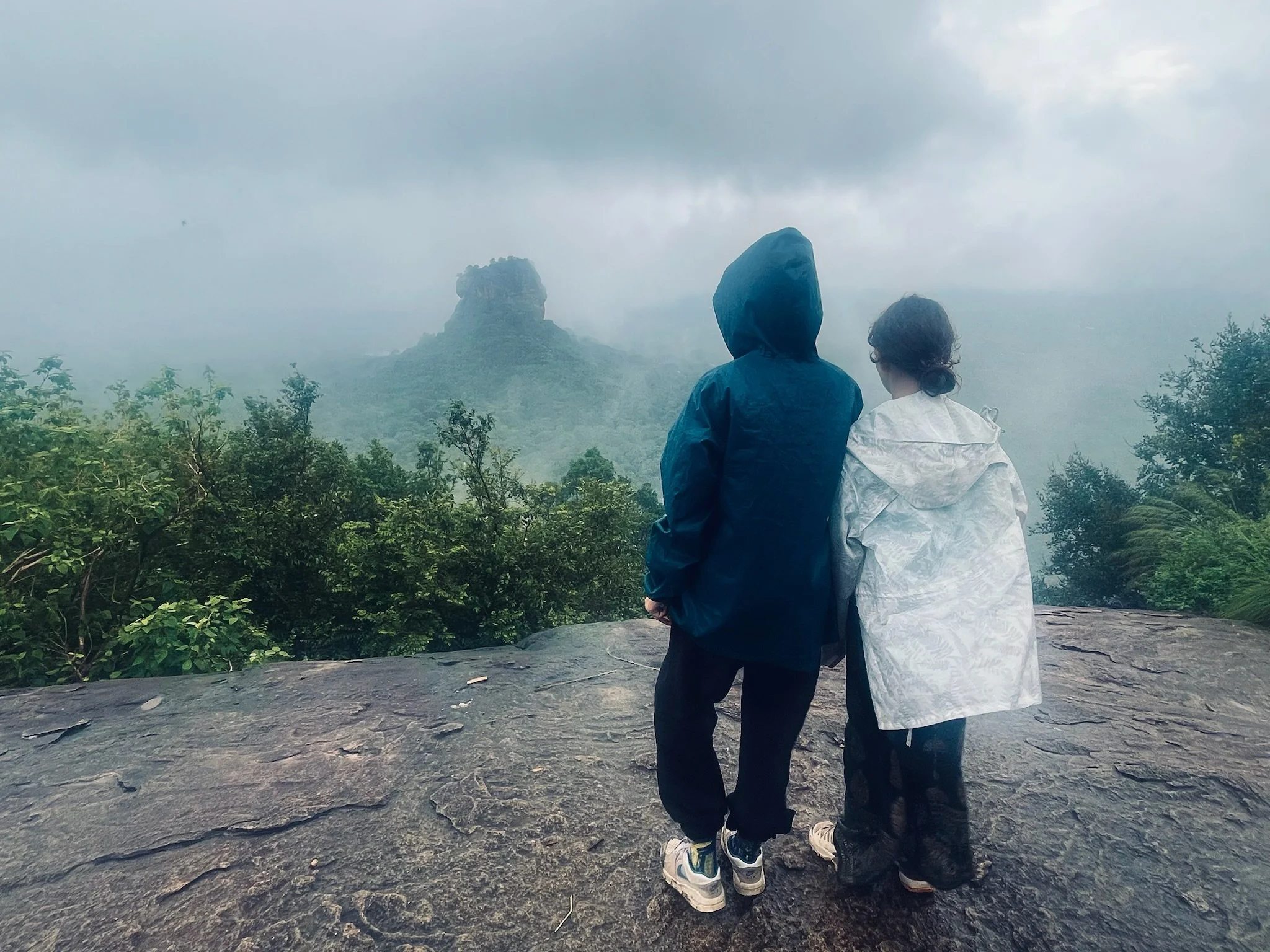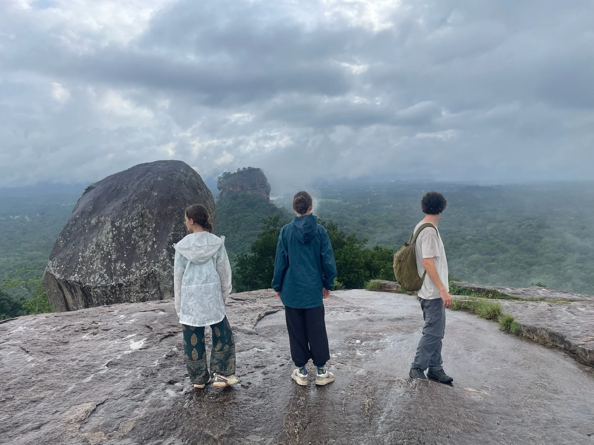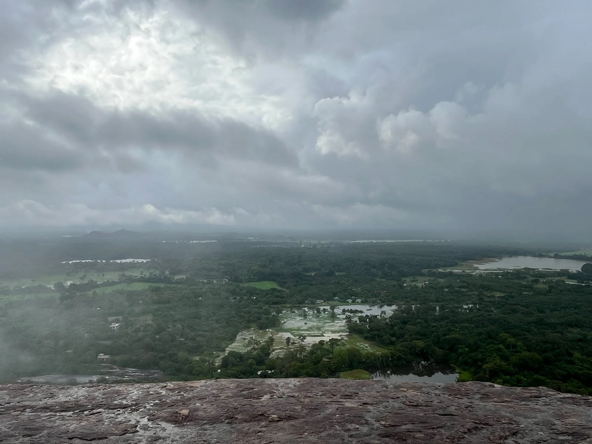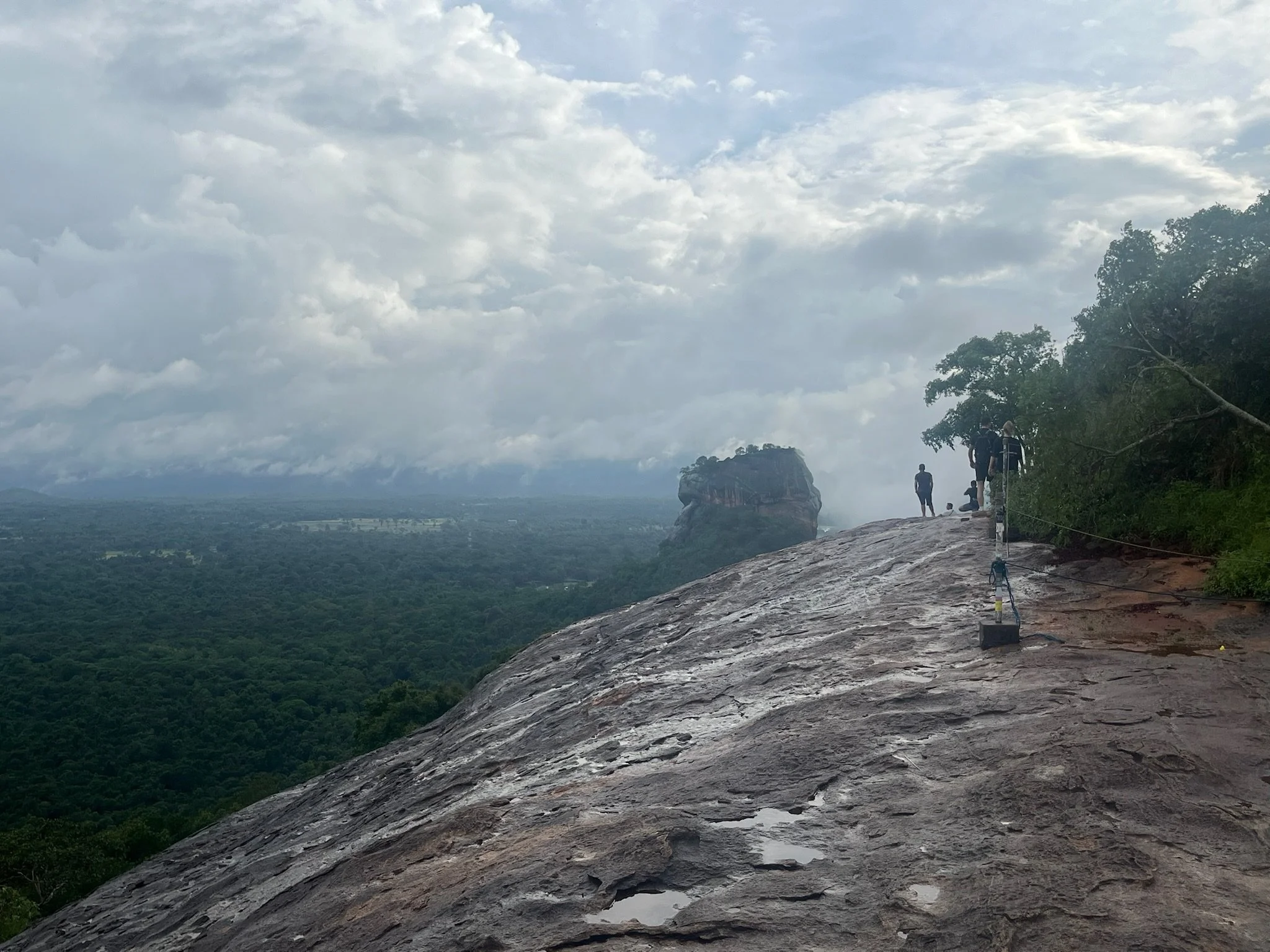 ‘t Is redelijk droog als we eraan beginnen en een plezante klim om te doen. Niet te lang, onderaan trapjes en dan vlak voor het einde een paar grote rotsen, waar je al boulderend zelf een weg naar boven moet zoeken. Daar is ‘t een beetje aanschuiven, omdat er in 2 richtingen altijd maar 1 iemand kan passeren. We kruisen een boze Britse die ons met een gezicht op onweer passeert in de afdaling: “don’t bother, you don’t see a single thing up there, only clouds.” Clouds! Dat kennen we van in België! We laten ons niet zomaar afschrikken en klimmen moedig verder. Ze blijkt echter wel gelijk te hebben, want eenmaal boven zijn we inderdaad gehuld in een dikke mist. We rusten even uit van de inspanning en zien dan plots in de verte door de wolken vaagweg een contour van de Leeuwenrots opduiken. Snel een foto! Maar het wordt alleen maar beter en nog eens vijf minuten later klaart de hemel volledig open. Ha! Patience, boze Britse vrouw! Het zicht op de omgeving en de weelderige groene jungle beneden ons is echt prachtig. Na Uluru is dit de tweede inselberg van deze reis. Ik ben er fan van. Op de terugweg begint het alweer zachtjes en daarna veel harder te druppelen, dus we blijken toevallig perfect getimed te hebben. Of we zijn gewoon echt ervaren reizigers, dat kan ook. Ocharme, die mensen die nu naar boven vertrekken, denken we. En ook wel: wat bezielt hen om deze klim in te korte topjes, op crocs, met een paraplu of een sjakosj van Louis Vuitton te doen? Soms voelt Sri Lanka echt een beetje als een pretpark.