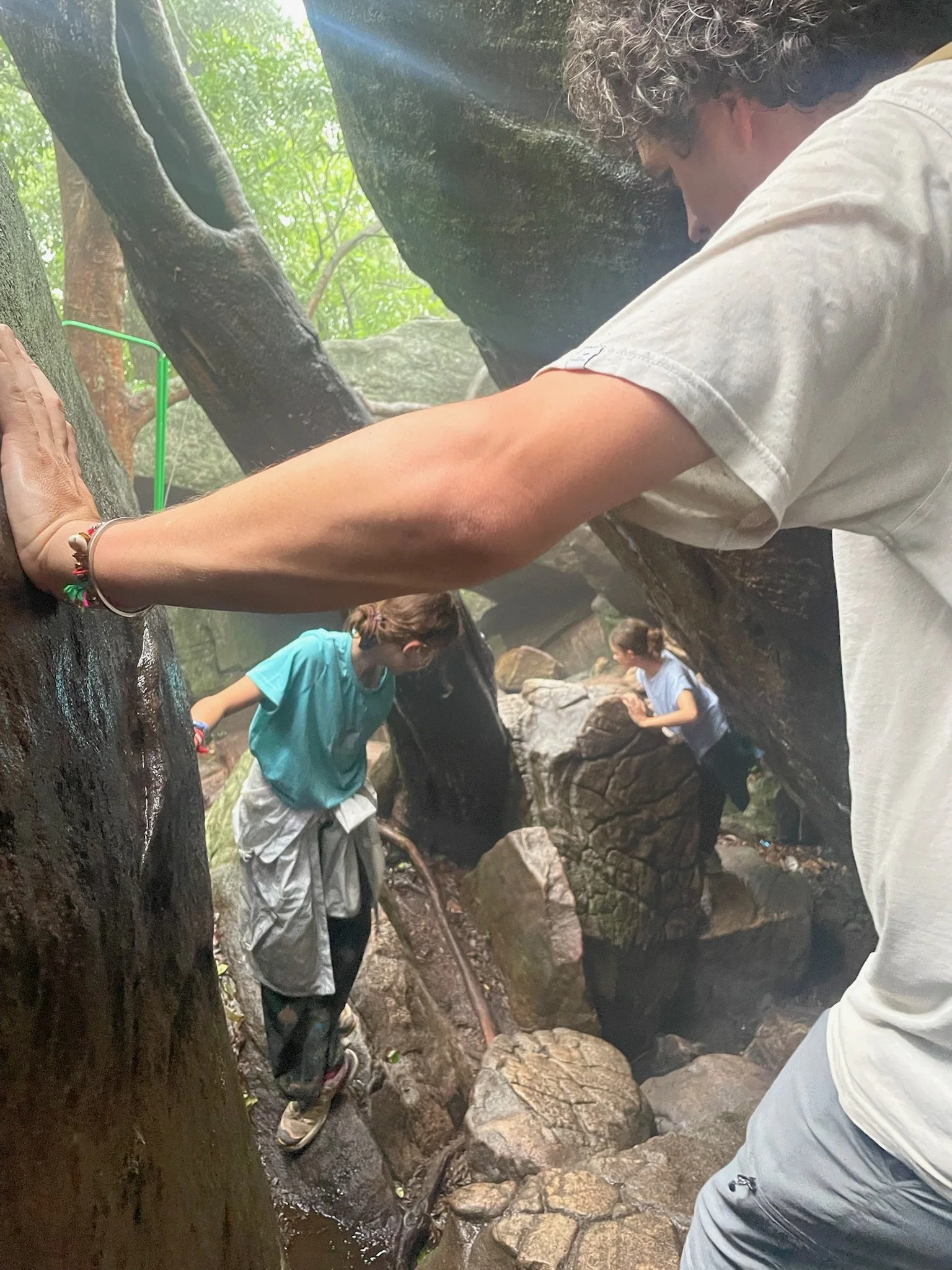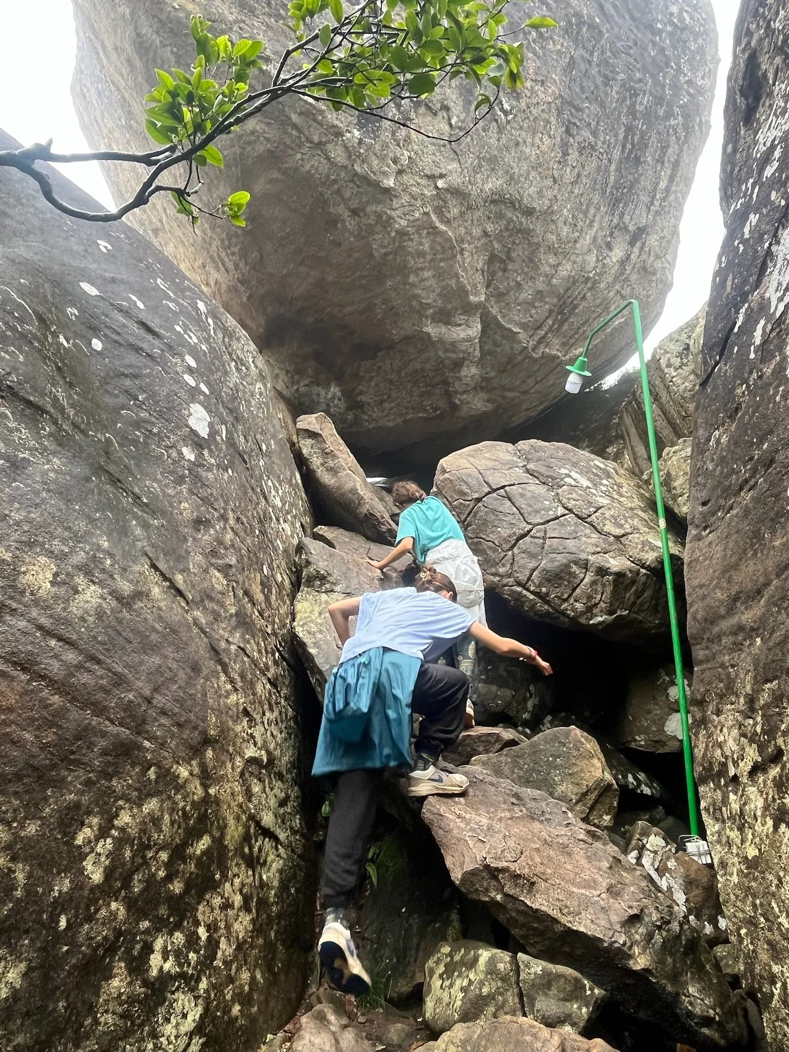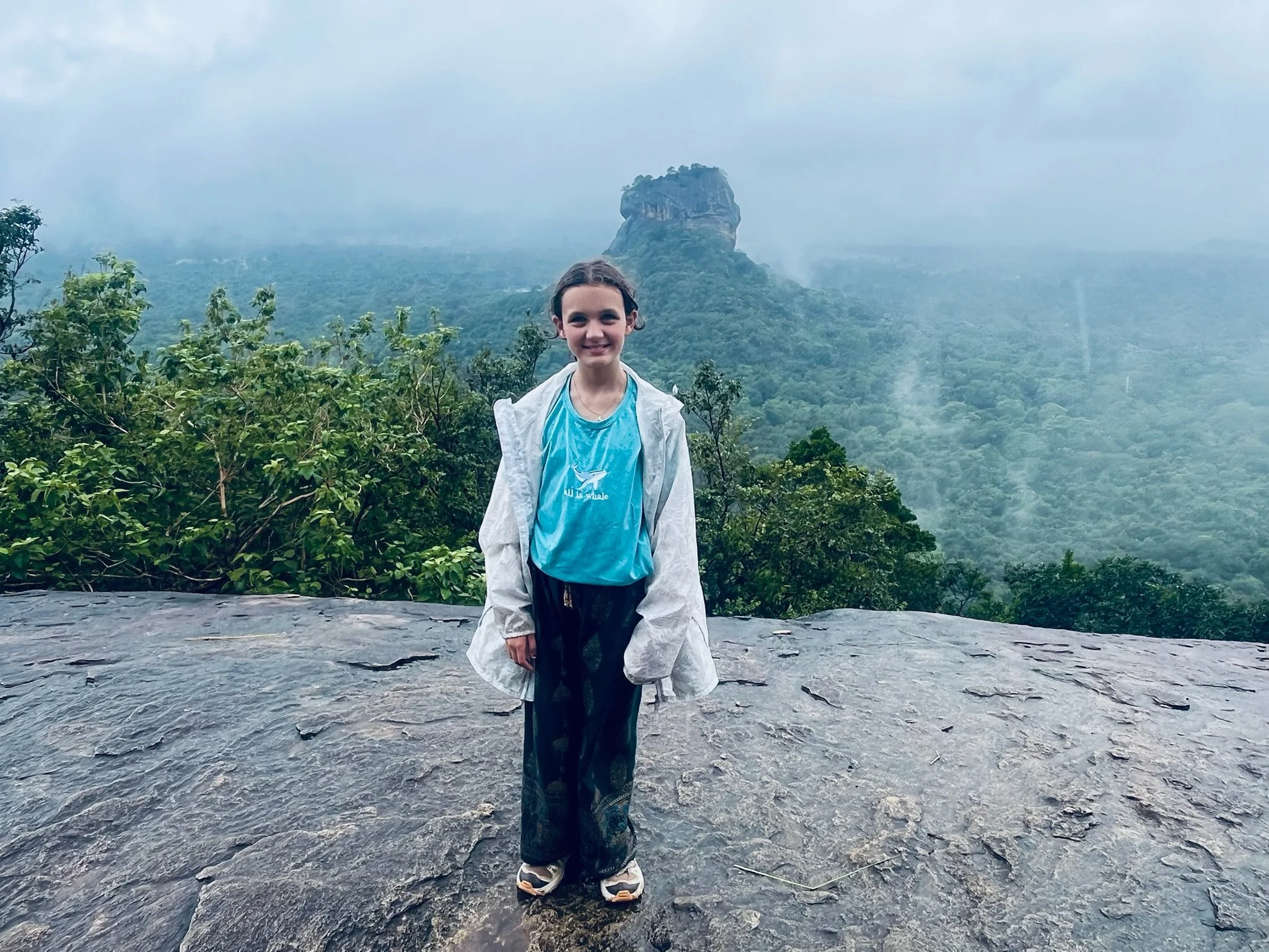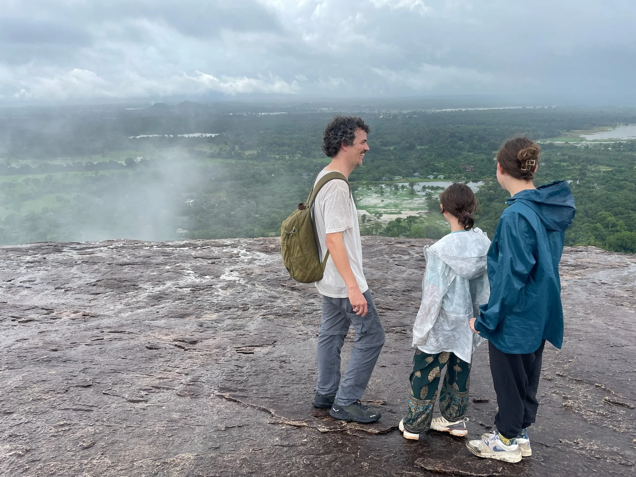 ‘t Is redelijk droog als we eraan beginnen en een plezante klim om te doen. Niet te lang, onderaan trapjes en dan vlak voor het einde een paar grote rotsen, waar je al boulderend zelf een weg naar boven moet zoeken. Daar is ‘t een beetje aanschuiven, omdat er in 2 richtingen altijd maar 1 iemand kan passeren. We kruisen een boze Britse die ons met een gezicht op onweer passeert in de afdaling: “don’t bother, you don’t see a single thing up there, only clouds.” Clouds! Dat kennen we van in België! We laten ons niet zomaar afschrikken en klimmen moedig verder. Ze blijkt echter wel gelijk te hebben, want eenmaal boven zijn we inderdaad gehuld in een dikke mist. We rusten even uit van de inspanning en zien dan plots in de verte door de wolken vaagweg een contour van de Leeuwenrots opduiken. Snel een foto! Maar het wordt alleen maar beter en nog eens vijf minuten later klaart de hemel volledig open. Ha! Patience, boze Britse vrouw! Het zicht op de omgeving en de weelderige groene jungle beneden ons is echt prachtig. Na Uluru is dit de tweede inselberg van deze reis. Ik ben er fan van. Op de terugweg begint het alweer zachtjes en daarna veel harder te druppelen, dus we blijken toevallig perfect getimed te hebben. Of we zijn gewoon echt ervaren reizigers, dat kan ook. Ocharme, die mensen die nu naar boven vertrekken, denken we. En ook wel: wat bezielt hen om deze klim in te korte topjes, op crocs, met een paraplu of een sjakosj van Louis Vuitton te doen? Soms voelt Sri Lanka echt een beetje als een pretpark.