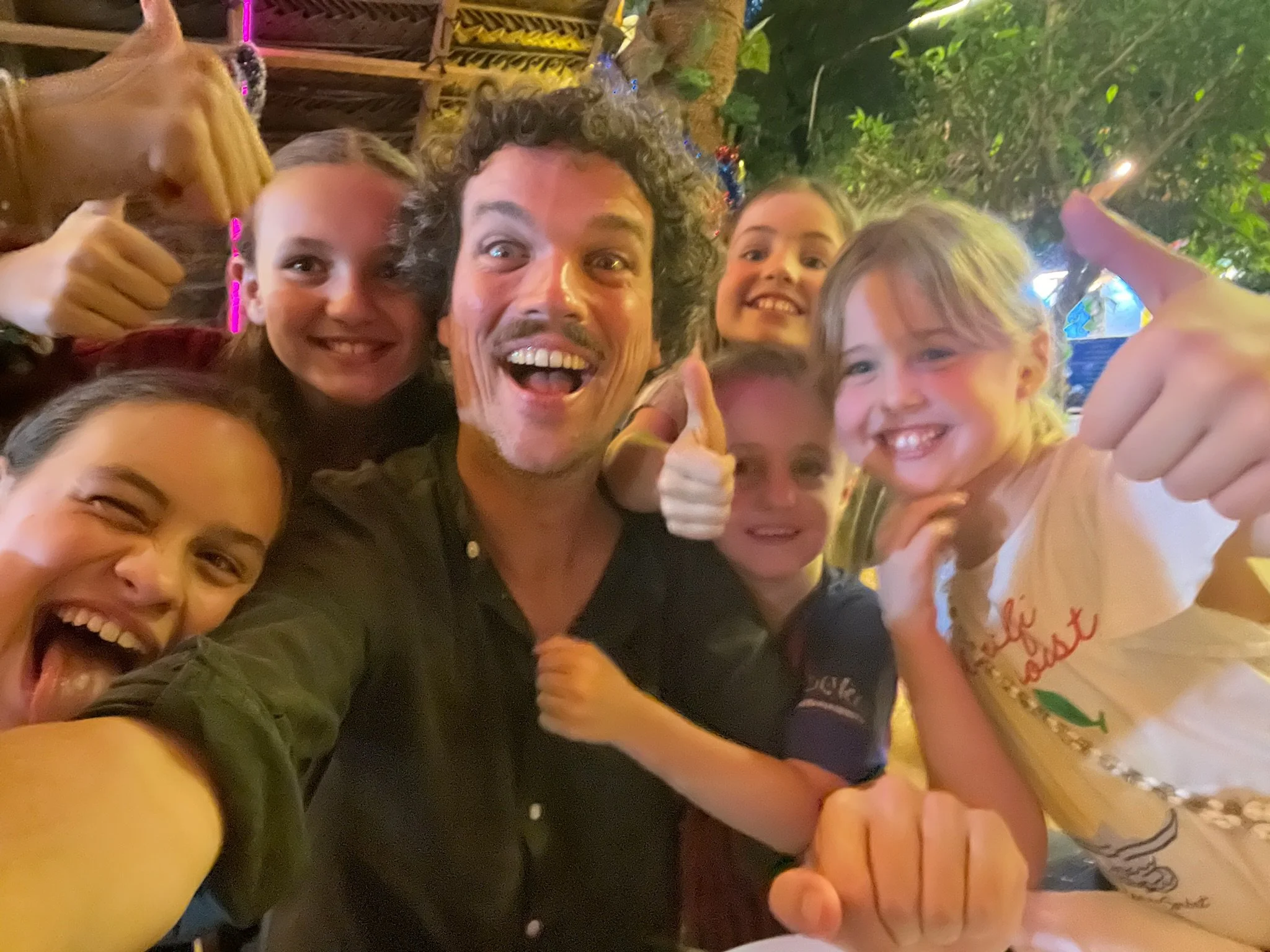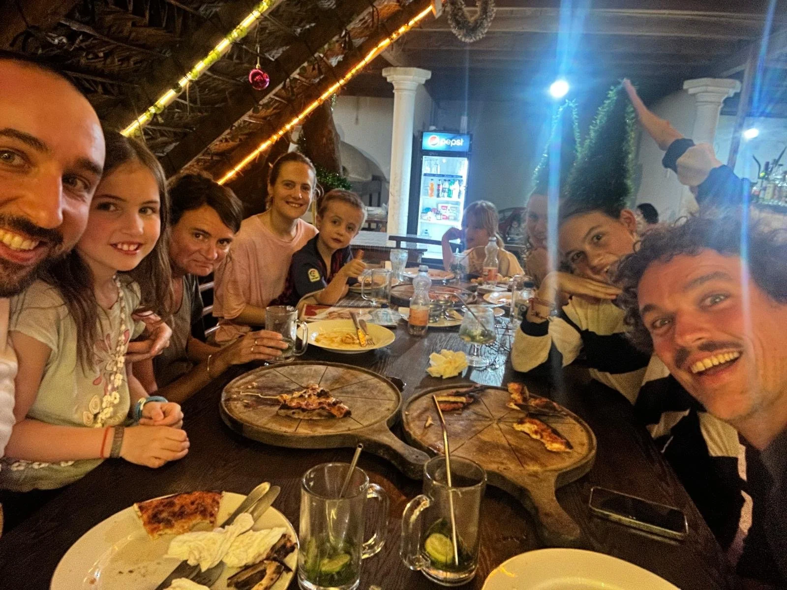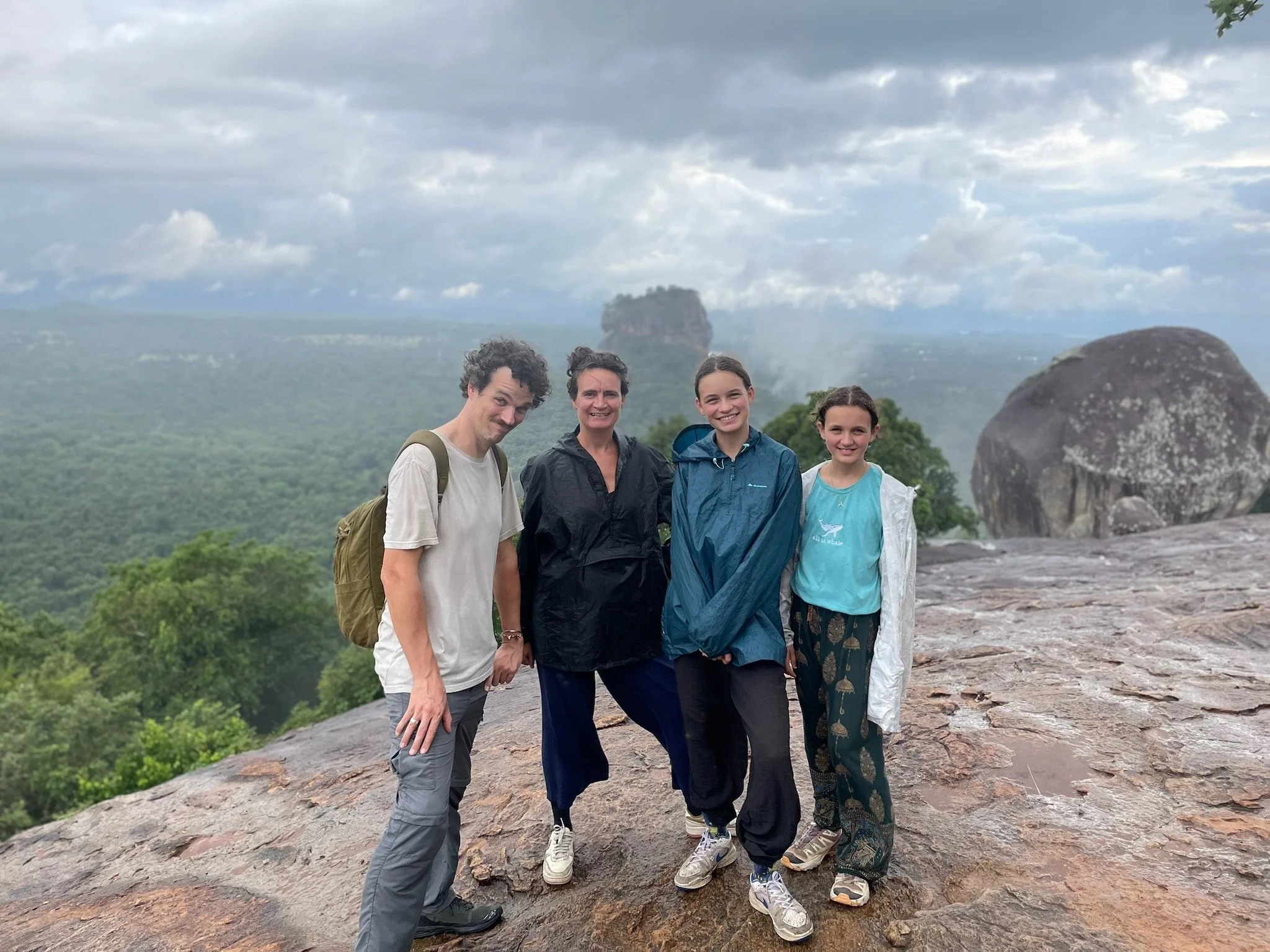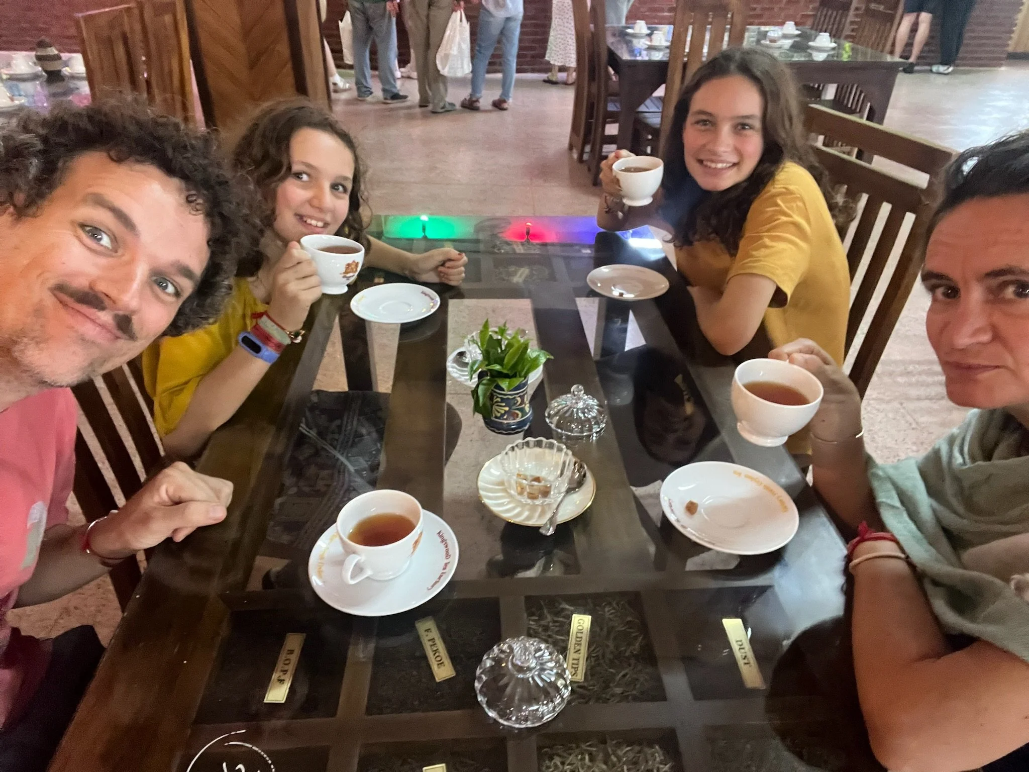 Naast oma en opa en meme Toren hebben we hier in Sri Lanka namelijk afgesproken met nog een ander quasi familielid: de Lokko family! Zij doen in Sri Lanka ongeveer dezelfde tour als ons, maar iets sneller en met beaucoup plus de randonnés. Echt “vakantie” samen doen we pas op ‘t einde, aan de kust in Mirissa, maar dit land is niet groot, dus onderweg kruisen onze wegen wel al een paar keer. En als de kans zich voordoet op een aperitief of een snelle zakenlunch, dan gaan we die uiteraard niet laten liggen. Wanneer we ‘s avonds in Sigiriya arriveren sturen we op goed geluk een berichtje en laten we weten dat we pizza gaan eten in Leon’s Café. Mevrouw Billiet antwoordt dat haar man nog ligt te bekomen van de Leeuwenrots op de ayurvedische massagetafel en dat het daarna aan haar is, dus we stellen onze verwachtingen bij. Maar kijk, we hebben nog maar net besteld of daar stopt een hippe witte minivan met 1 vers gemasseerde vader en 3 all excited kinderen. We schuiven stoelen bij, drinken mojito’s en bestellen pizza’s, heerlijk. Een uurtje later arriveert Perrine ook, maar hun tourschema is strak en hun chauffeur streng: 4 slokken mojito en dan hop, retour vers l’hotel, parce que demain on se réveille tôt! Au revoir, vrienden, dank om even tijd te maken voor deze lazy travellers en tot bij de volgende stop!