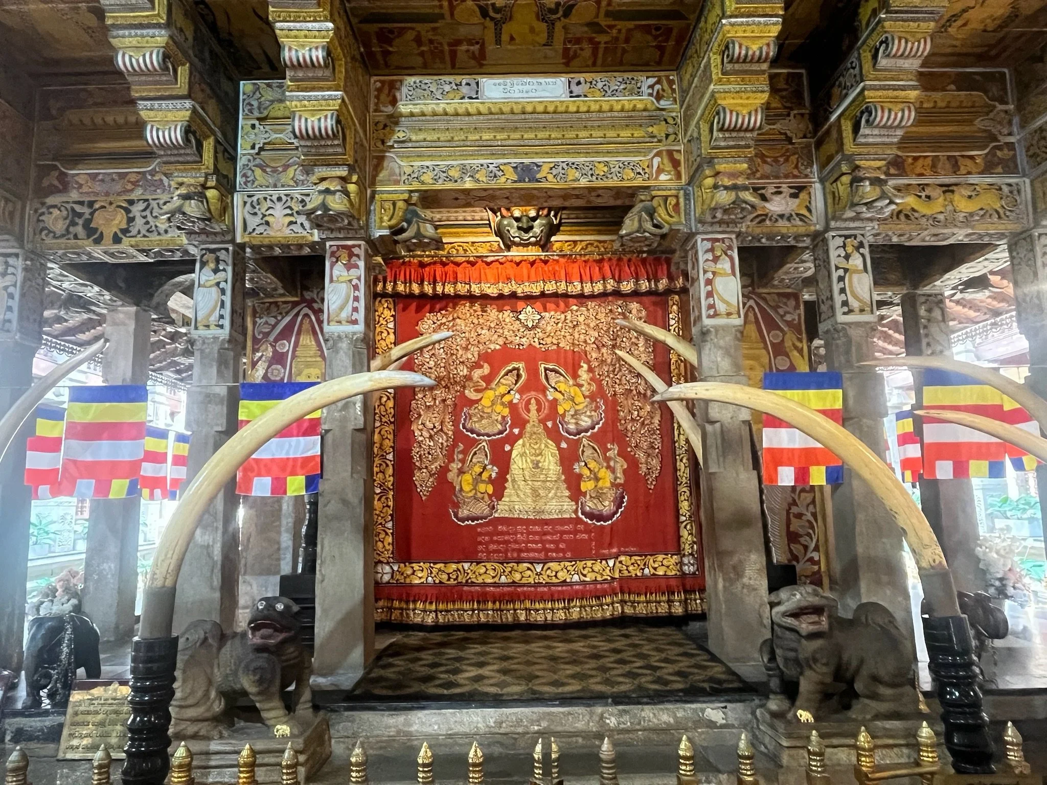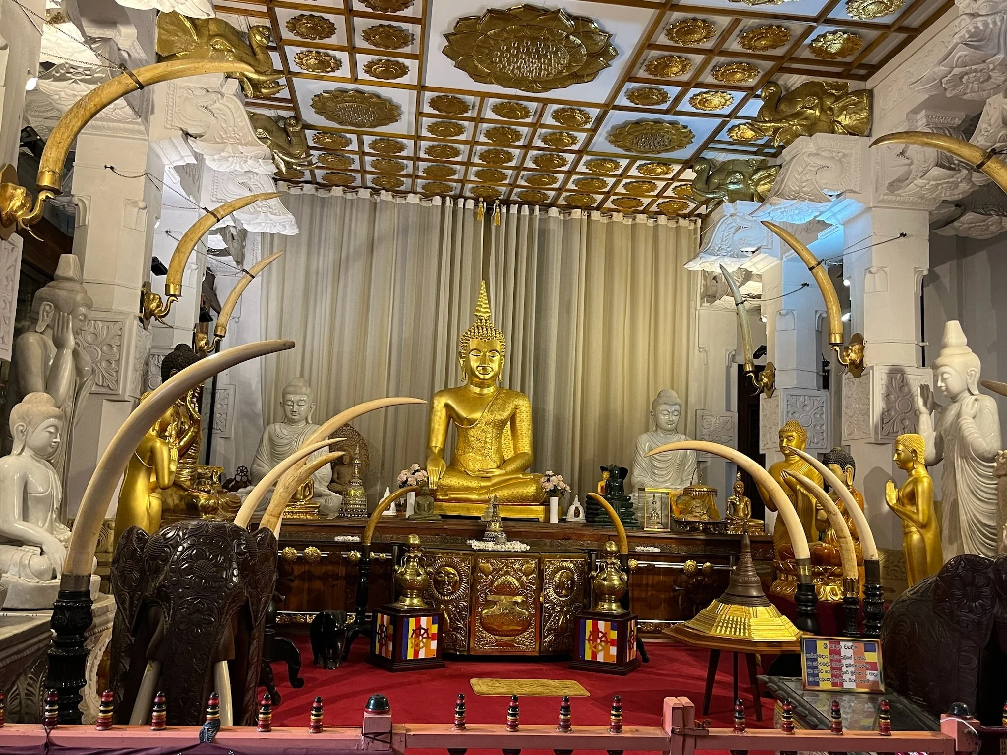 De attracties in Sigiriya hebben we ondertussen wel afgevinkt, dus de volgende dag pikt een driver ons op om ons naar Nuwara Eliya te voeren, op 1865 meter een van de hoogste bergdorpen van Sri Lanka. ‘t Is een stevige rit van 5 uur, die in het midden wordt gebroken door een tussenstop in Kandy, de laatste hoofdstad van het Sinhalese koninkrijk tussen 1400 en 1800 en nog maar eens een religieus bedevaartsoord, omdat ze hier de Temple Of The Tooth hebben. In die tempel ligt een van de belangrijkste relikwieën van de boeddhistische canon: een hoektand van Gautama Boeddha zelve. Ons zegt het niet meteen geweldig veel, maar als je hier een trip boekt van punt a naar b, lappen ze er onderweg gegarandeerd 2 watervallen en 3 bezienswaardigheden bij. Het breekt de lange autorit ook een beetje, da’s tof, maar de tempel is niet bijzonder mooi of sfeervol. Hoewel Boeddha voor zover wij weten geen olifant was, hebben ze de hele tempel ook nog eens versierd met slagtanden en ander ivoor. Een tand is een tand, moet de conservator gedacht hebben. Dé tand van Boeddha zelf zit uiteraard goed verborgen onder een gouden mini stoepa, dus veel meer dan “dus daar zit de tand dan onder?” is er ook niet aan. Gelukkig is er vlakbij de tempel een Soul Food restaurantje, jazeker, aandachtige lezer die zich de eerste paragraaf van dit verslag nog herinnert: het blijkt een keten te zijn. Het filiaal in Kandy heeft gelukkig wél wraps én avocado, dus lang leve de Temple Of The Tooth, we gaan hier nog komen!