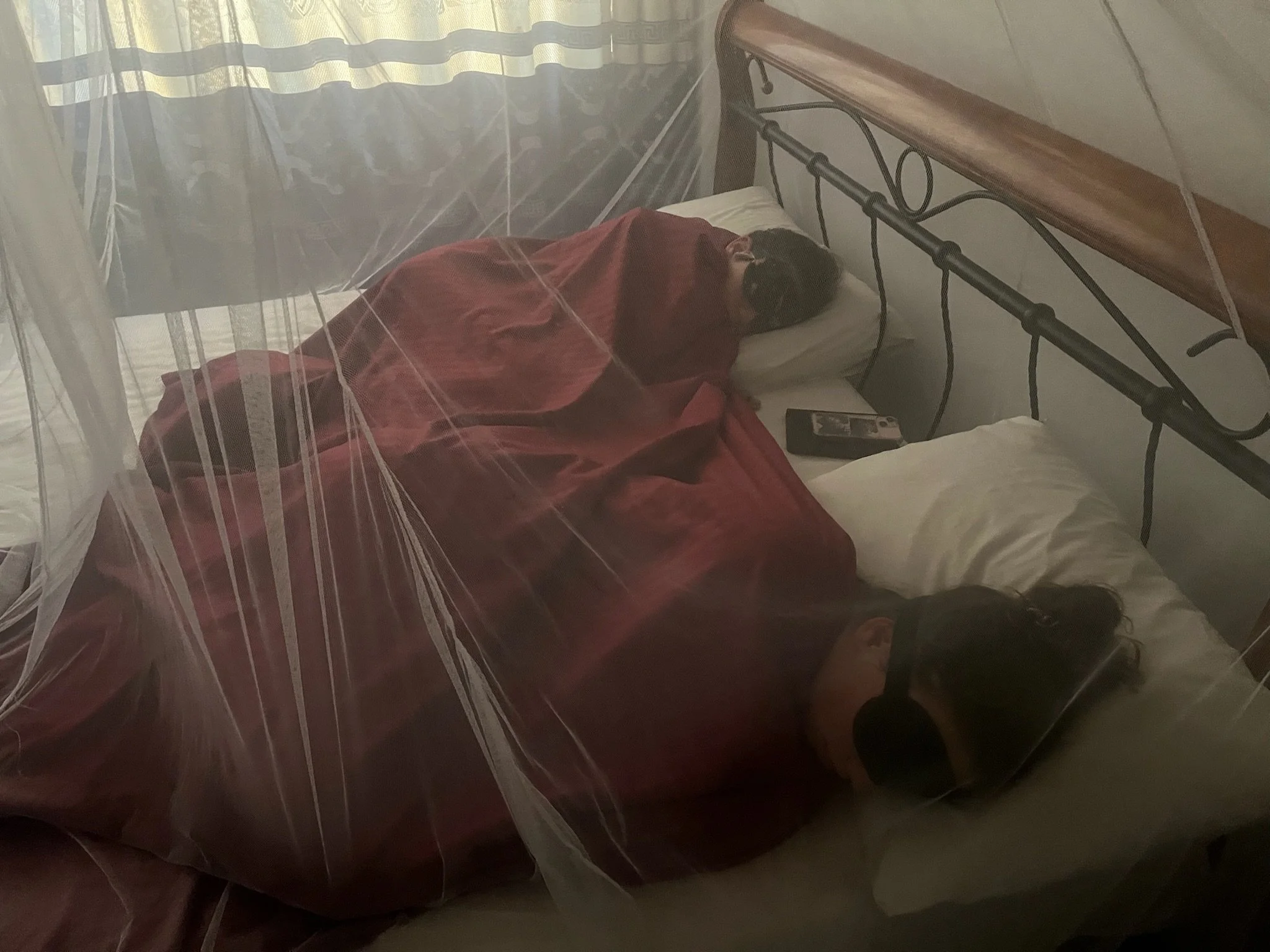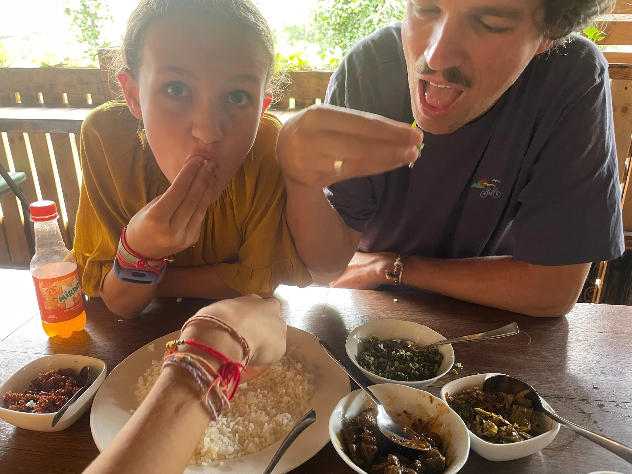 Onze Homestay is super chique. We hebben een soort dubbele kamer, met de kindjes hun twee bedden op de mezzanine. Het is warm, veel warmer dan in India. De bedden zijn fantastisch; propere katoenen lakens (geen dikke muffige dekens), een moderne badkamer die niet ruikt naar zakjes chemische geurverfrissers, een harde straal uit de douche, en vooral ook een douche die niet gewoon in het midden van de badkamer boven de wc hangt. Efkens genieten toch van dit alles. Echter niet voor lang, want de volgende middag reizen we alweer verder. Maar eerst springen we nog eens in het zwembad, dat is lang geleden. Onderweg naar de volgende bestemming stoppen we nog voor een eerste lokaal restaurantje waar we vriendelijk verzocht worden met onze handen te eten. Dat blijkt met die curryās toch niet zo evident!