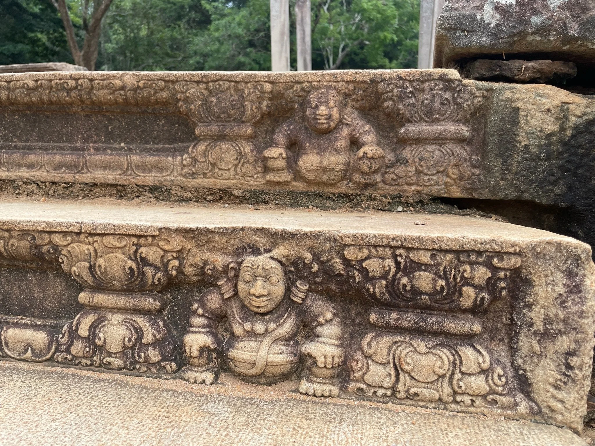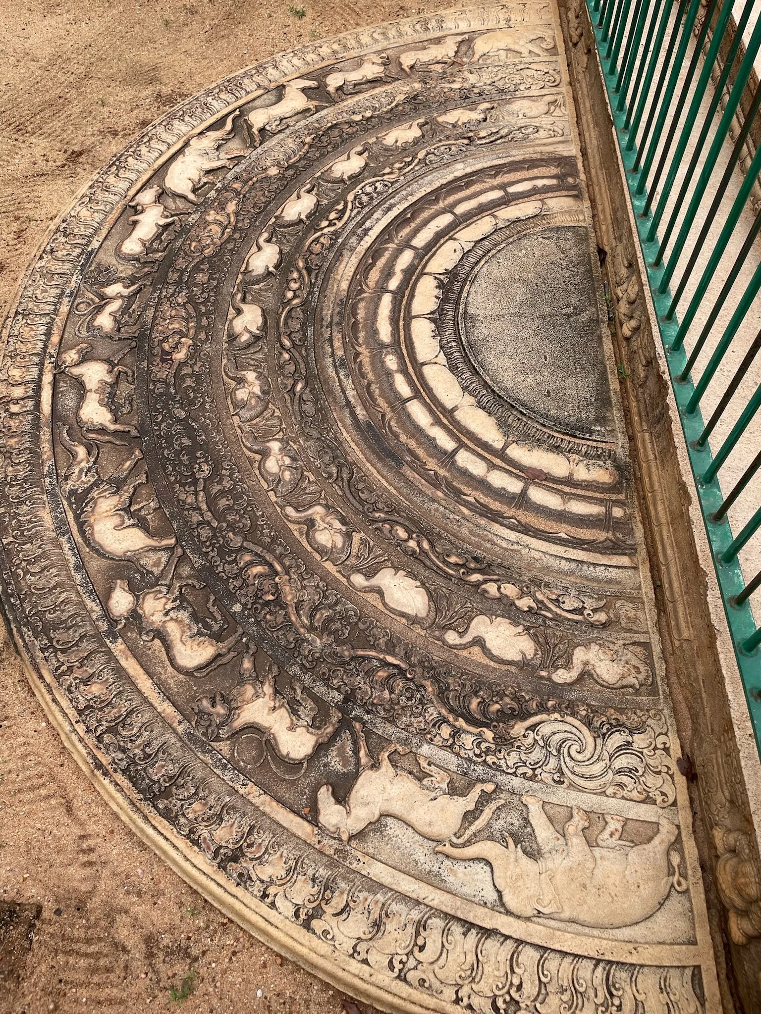 We fietsen ook langs de moonstone, een bewerkte halfronde stenen plaat die meestal onderaan trappen en ingangen staat, waar er een heleboel dieren in zijn gecarved, en grappige dwergjes die de trappen ondersteunen. Daarna gaat het verder langs oude tempels, kloosters en ahja, stoepaās! De Ruwanweliseya stoepa is een witte, waar de as van boeddha zou bewaard liggen. Rondom rond staan er rijen zuilen waarvan men de betekenis niet meer kan achterhalen. Een andere is de Thuparamaya, dat was dan weer de oudste, en ga zo maar door :) in veel van die stoepaās liggen relikwieĆ«n van boeddha; wat as, een tand, en nog wat overblijfselen. Sommige stoepaās blenden fantastisch met de lucht erachter.