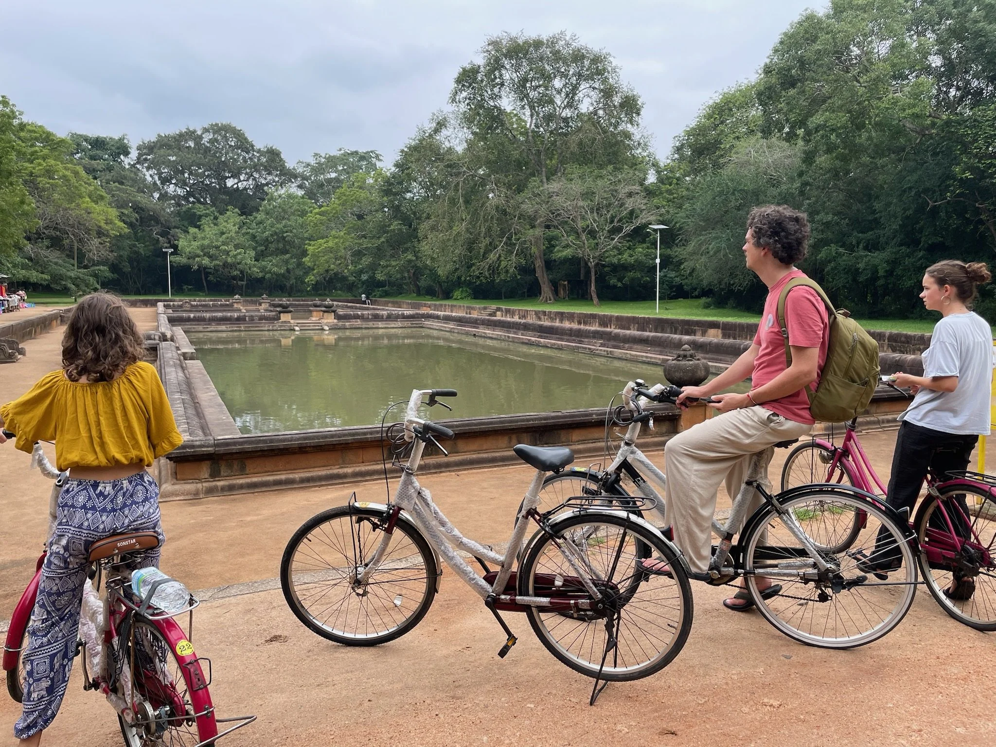 De volgende dag staat Anura-dingens op de planning. De eigenaar van ons hotel raadt ons af om het met de fiets te doen, āveel te verā, maar we laten ons niet ompraten en huren elk een fiets aan de start van de site. Het vriendelijke vrouwtje toont ons eerst nog eens tot waar het water kwam tijdens de storm en floodings, en rekent ons daarna 32 euroots aan voor 4 doenbare fietskes. We betalen het met plezier, want we hebben wel zin in wat beweging.