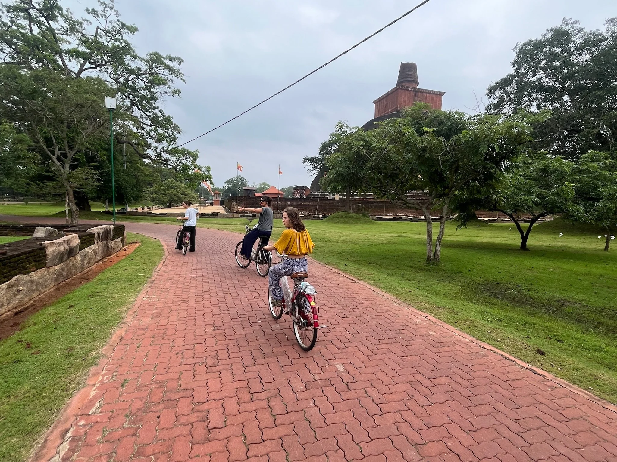 Anuradhapura is Sri Lankaās (toen Ceylon) eerste hoofdstad die meer dan duizend jaar heeft bestaan en nu een ruĆÆne complex is, vergelijkbaar met het Forum Romanum in Rome. Het is een UNESCO World Heritage site, die samen met Dambulla en Polonnaruwa onderdeel is van de zogenaamde āculturele driehoekā, met de drie belangrijke hoofdsteden van de vroegere koninkrijken in Sri Lanka. De stad werd gesticht door prins Vijaya die uit India werd verbannen en er hier dan maar het beste van maakte. Ergens halverwege bekeerde hij zich tot het boeddhisme en zo werd deze stad ook de hoofdstad van het boeddhisme, en geraakte deze plaats volgebouwd met gigantische stoepaās, kloosters en andere boeddhistische monumenten. Rond dezelfde tijd hadden we in Europa de Griekse staten Athene en Sparta die groot en machtig waren, en de Etrusken in ItaliĆ«. Dichter bij ons deden ze een omgekeerde beweging, en verbrokkelde het land langzaamaan door het leenstelsel. Daarover meer in de cursus geschiedenis van het derde middelbaar. We fietsen heerlijk rustig door de site en stappen hier en daar eens af om rond een stoepa te wandelen of de pauwen die hier in grote getale rondwandelen te bewonderen.