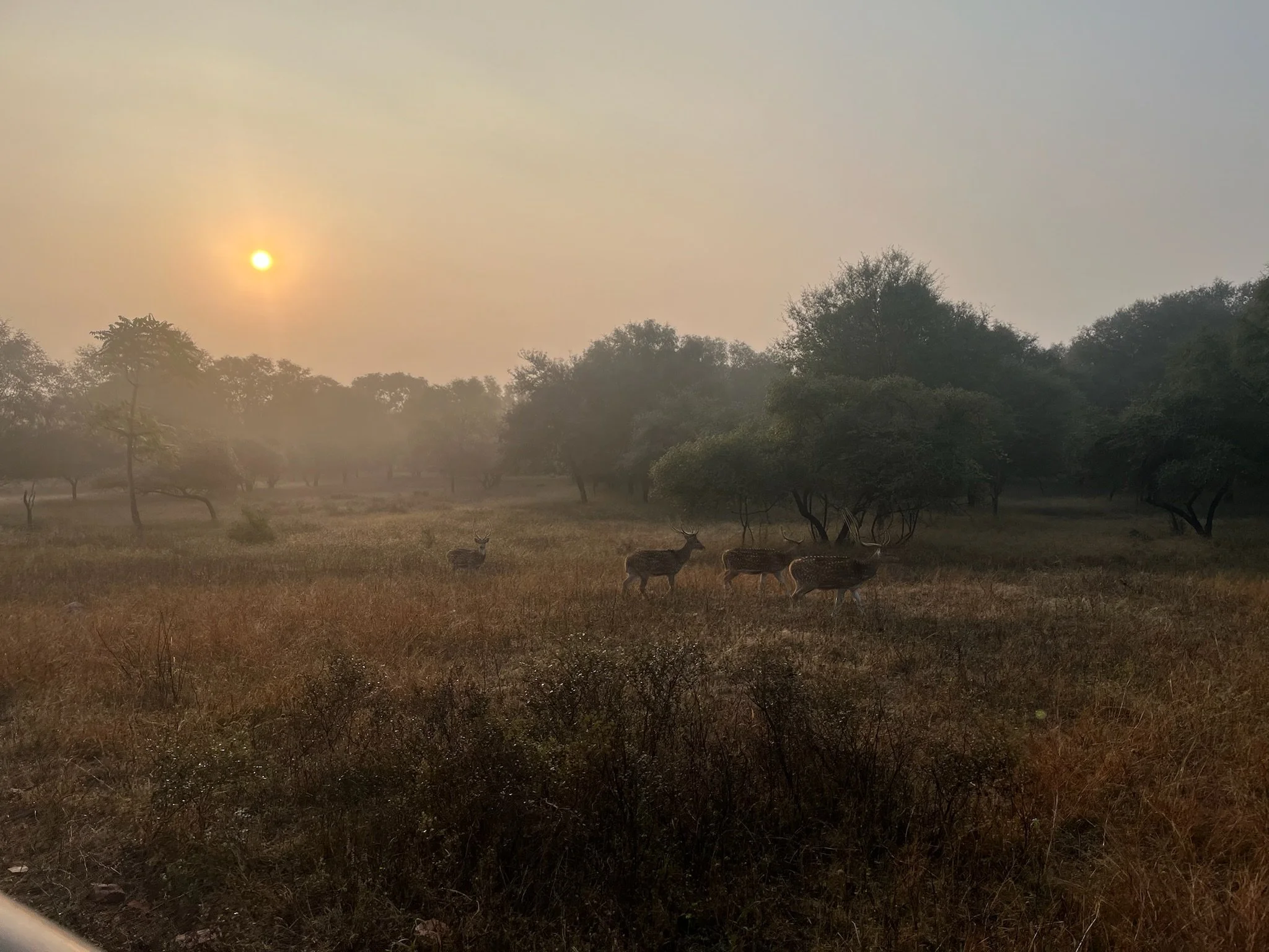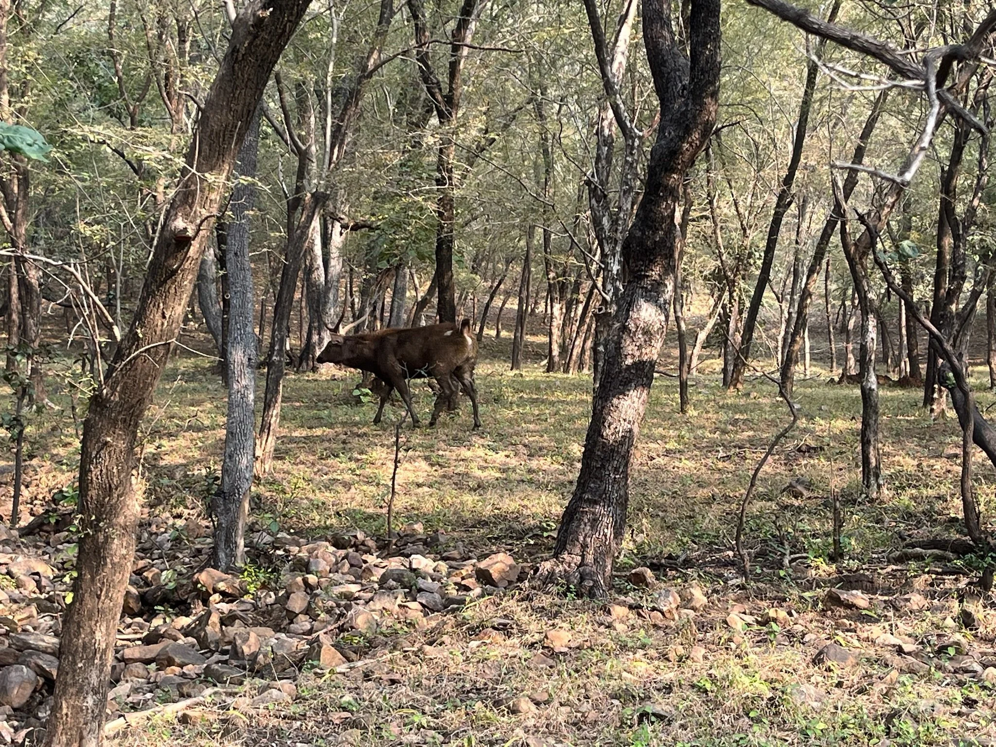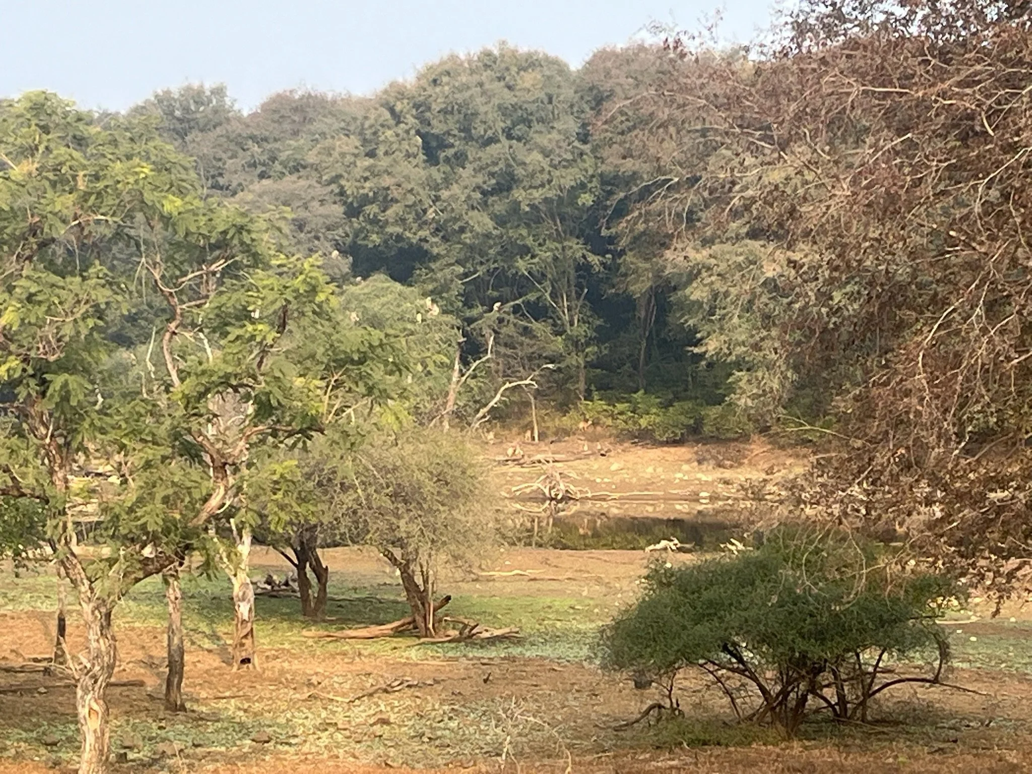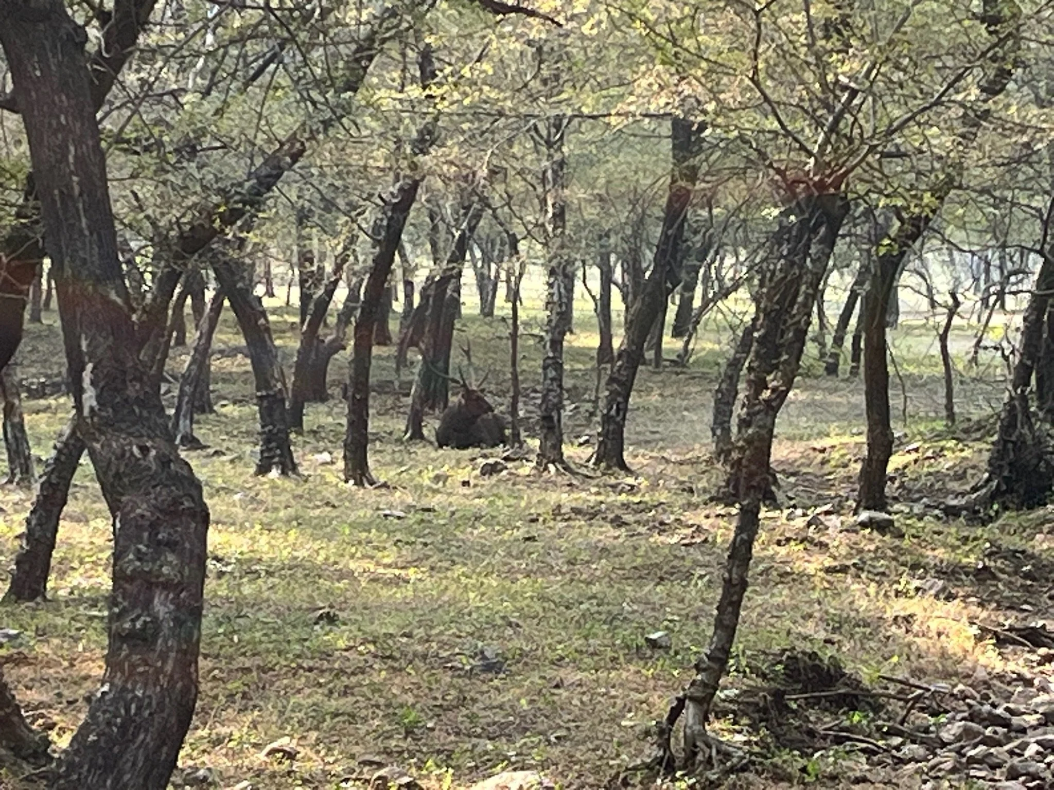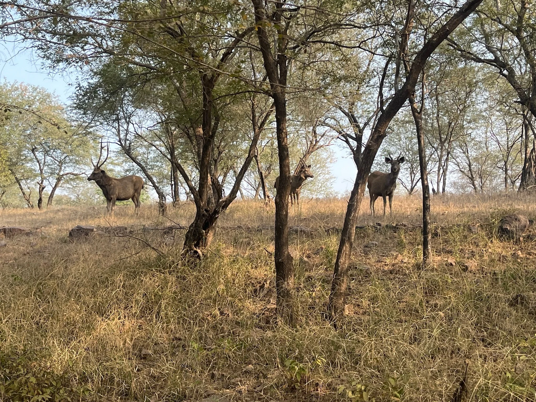Op een bepaald moment houden we halt bij een klein beekje met een soort afspanning. Er is niets te zien, maar dit is de grens met Zone 5 “and this morning, they saw a tiger here.” Motor uit en wachten, dus. ‘t Lijkt me heel sterk dat dat beest daar nu nog steeds zou zitten, maar wat weet ik ervan. Gemiddeld zou je hier om de 10 kilometer een tijger moeten kunnen tegenkomen, las ik. ‘t Zal dan toch niet in dit segment zijn, want na tien minuutjes zwiert de chauffeur de motor weer in gang en rijden we verder, bergop deze keer, waar we stoppen bij een soort viewpoint voor een uitgebreide fotosessie en de gids wat begint te vertellen over de plantjes en de flora. Uit ervaring weten wij ondertussen dat dat meestal een teken is dat de fauna het wat laat afweten. Terwijl de zon bijna ondergaat zien we op weg naar beneden in de verte nog Indische blackbucks en kleinere gazelles, dus nu kunnen we ook antilopes afvinken op ons dierenlijstje.