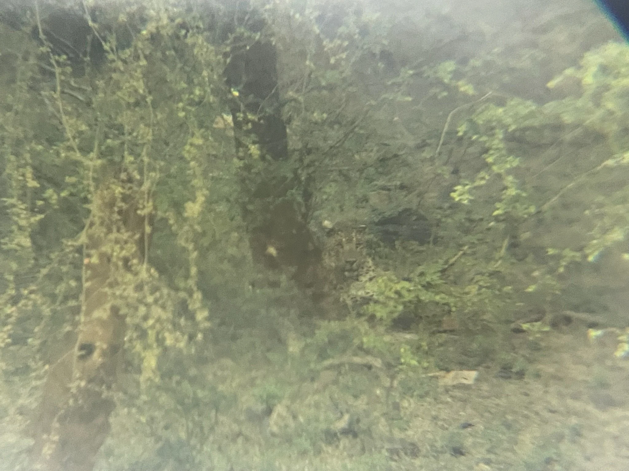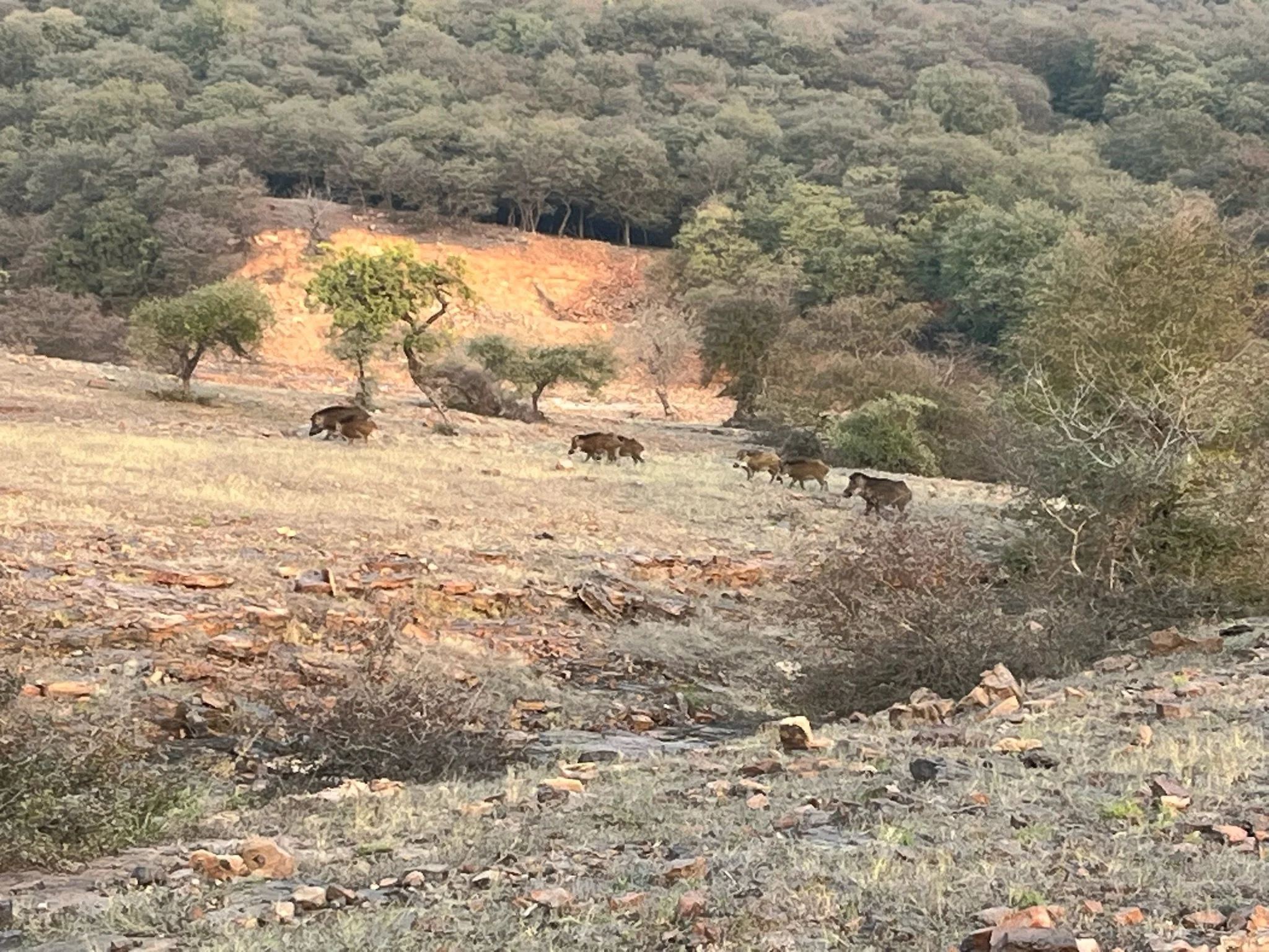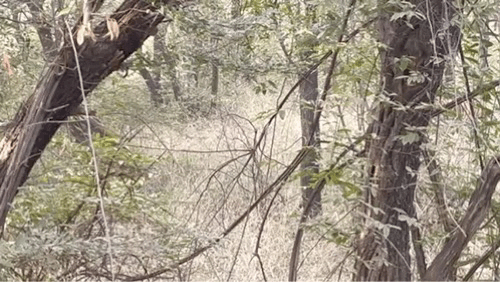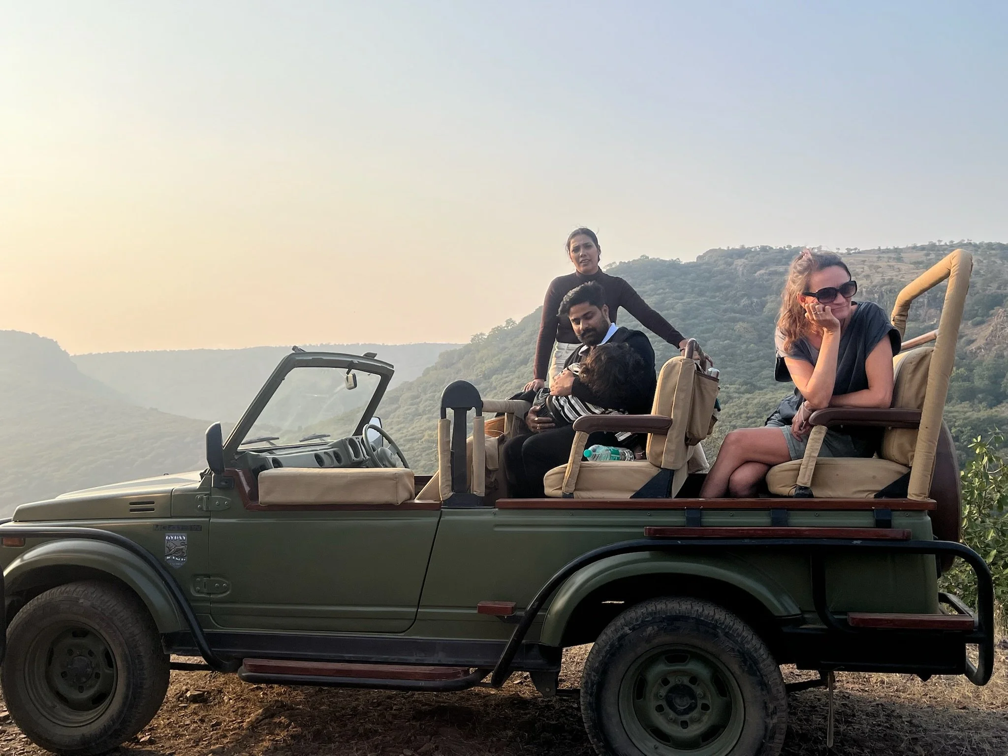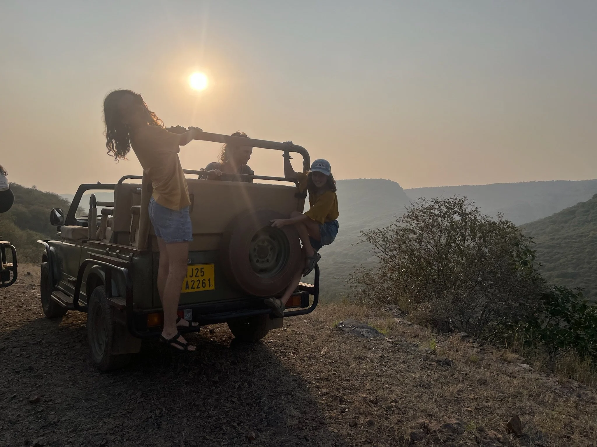 Op een bepaald moment houden we halt bij een klein beekje met een soort afspanning. Er is niets te zien, maar dit is de grens met Zone 5 “and this morning, they saw a tiger here.” Motor uit en wachten, dus. ‘t Lijkt me heel sterk dat dat beest daar nu nog steeds zou zitten, maar wat weet ik ervan. Gemiddeld zou je hier om de 10 kilometer een tijger moeten kunnen tegenkomen, las ik. ‘t Zal dan toch niet in dit segment zijn, want na tien minuutjes zwiert de chauffeur de motor weer in gang en rijden we verder, bergop deze keer, waar we stoppen bij een soort viewpoint voor een uitgebreide fotosessie en de gids wat begint te vertellen over de plantjes en de flora. Uit ervaring weten wij ondertussen dat dat meestal een teken is dat de fauna het wat laat afweten. Terwijl de zon bijna ondergaat zien we op weg naar beneden in de verte nog Indische blackbucks en kleinere gazelles, dus nu kunnen we ook antilopes afvinken op ons dierenlijstje.