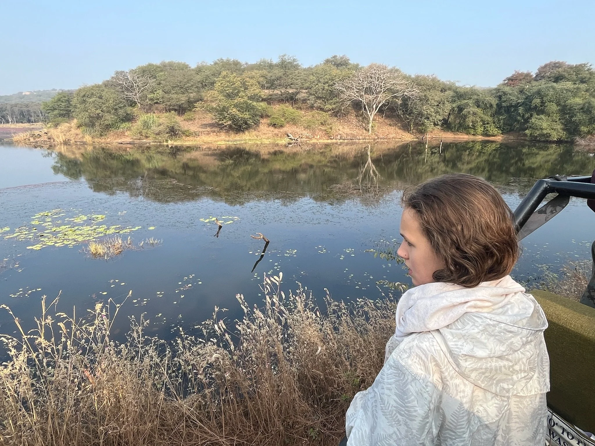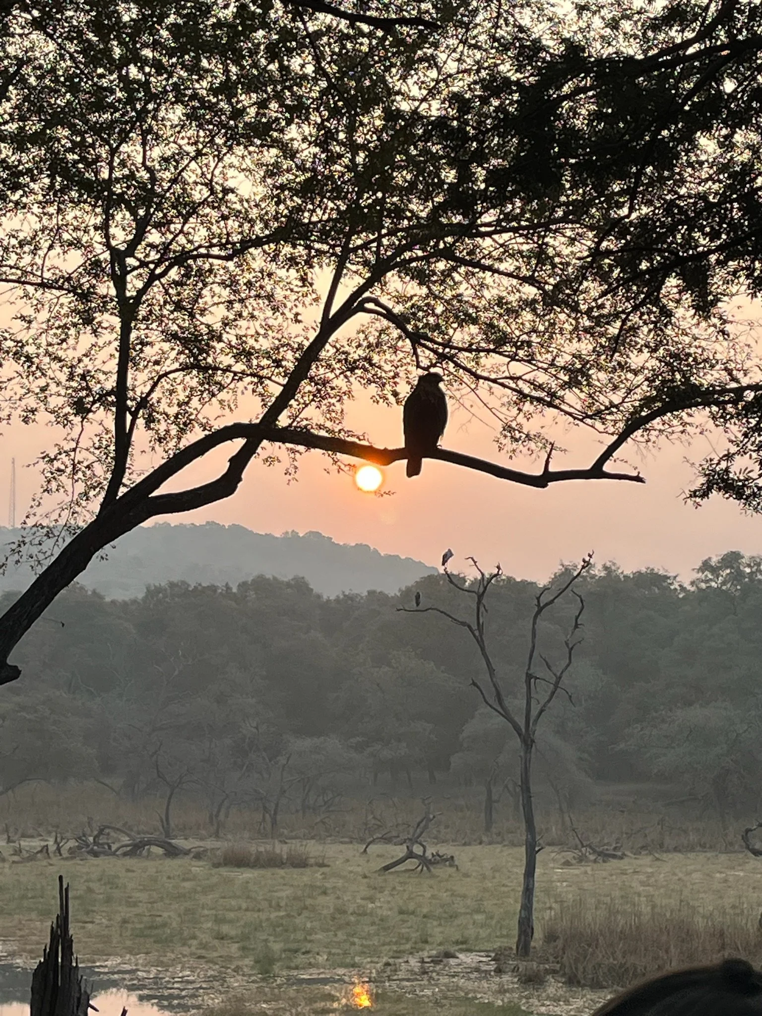 Zone 2 ligt aan de hoofdingang van het park en heeft een andere vibe dan zone 9. Er is overduidelijk meer volk en omdat we in colonne met allemaal andere jeeps en canters door een officiële grote poort rijden, heeft het ook een groot “Welcome to Jurassic Parc”-gehalte. De voertuigen verspreiden zich en terwijl de zon opkomt, rijden we alweer langs prachtige dieren. Er is veel meer water in zone 2, dus er zit ook veel meer wildlife en deze keer zien we naast de herten ook heel veel pauwen, krokodillen, ijsvogels, een uil en een arend. Na een tijdje komen we de andere voertuigen weer tegen en wisselen de drivers en de gidsen telkens wat woorden uit. ‘t Is duidelijk dat iedereen de omgeving aan het afspeuren is. Blijkbaar delen ze de zone zelf ook nog eens op in verschillende sectoren en rijdt iedereen op verschillende baantjes, waarna ze verslag uitbrengen aan mekaar. Er is veel speculatie - “Shanti has been seen somewhere with a deer she caught, so changes are high” - maar echt concreet wordt het nooit. Zo blijven we wat in verschillende rondjes rijden, stoppen we plots, luisteren we eens, rijden we weer verder en leggen we er ons na een uurtje of drie bij neer dat ‘t wellicht niet voor vandaag zal zijn.