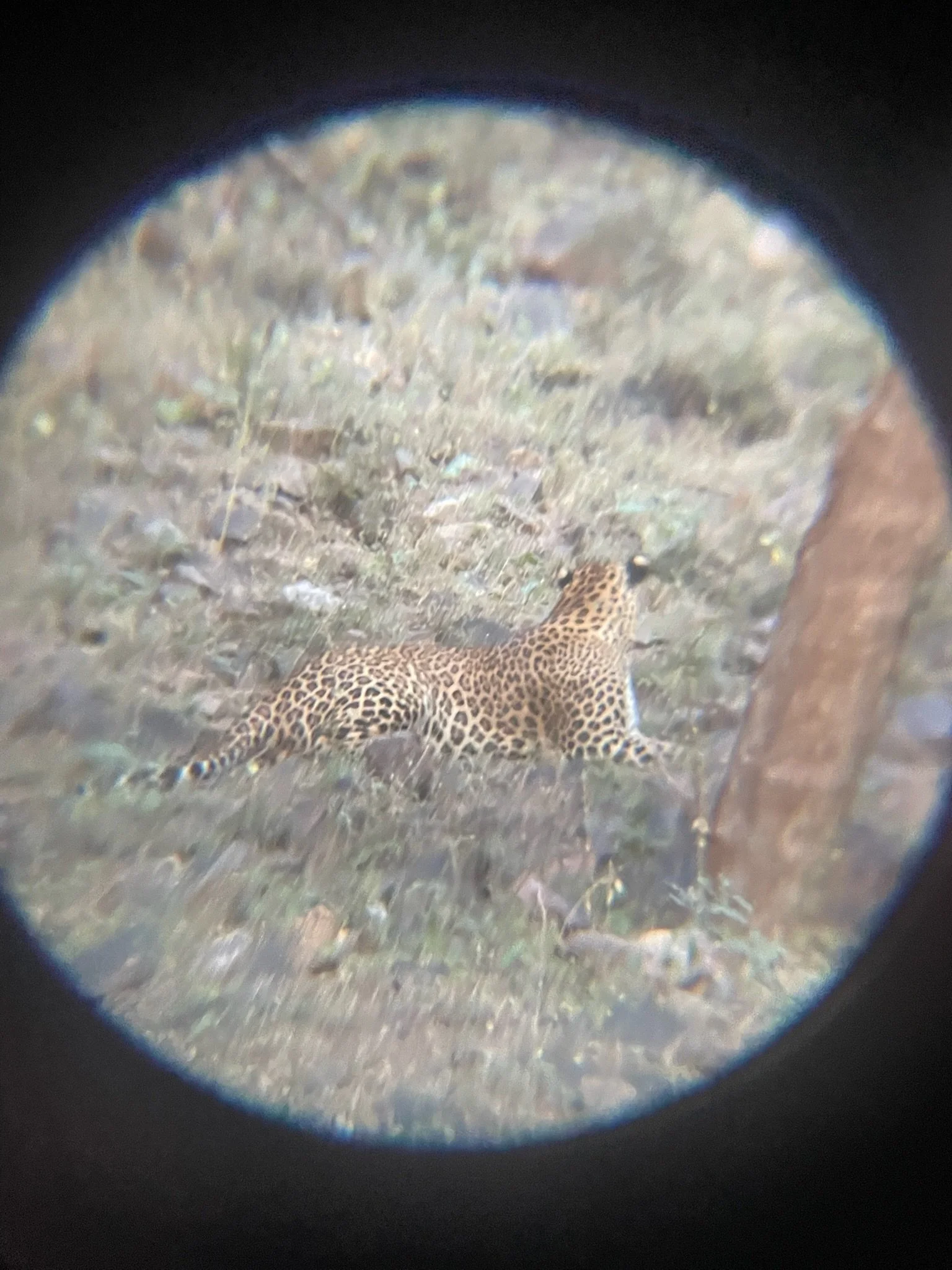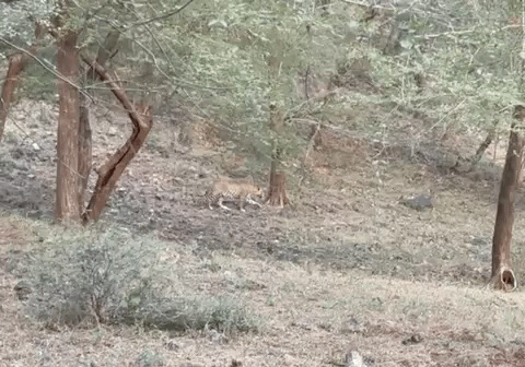 Wij hebben al lang vrede met dit mooie tochtje, maar 100 meter voor de ingang staat er plots een parkwachter enthousiast te zwaaien. Onze chauffeur gooit de jeep prompt in vierde vitesse en sjeest razendsnel voorbij de ingang over een zandweg tot bij een andere jeep. “Leopard! Leopard!”, roept iemand. Griet was al wat aan ‘t indommelen, maar gaat nu een beetje dood op de achterbank. Ik vind het ook wel spannend, maar ben vooral benieuwd als de chauffeur plots alles dichtgooit. En dan zien we een meter of 10 voor ons ineens, superchill, een luipaard tussen de bomen wandelen. “This is close enough, ok, close enough!”, maant Griet iedereen aan tot kalmte. Gelukkig heeft Sam zich ondertussen gespecialiseerd in fotograferen door de verrekijker. Het prachtig beest zal het allemaal worst wezen. Ze (leren we achteraf) is zwanger en installeert zich rustig onder een boom, terwijl ze de 2 jeeps voor haar neus gadeslaat. Ondertussen is er op de hoofdweg naast het park ook een halve verkeersopstopping ontstaan van nieuwsgierige Indiërs die snel even willen stoppen voor een foto. “Dat is toch ongelofelijk”, merkt Griet achteraf op. “We rijden drie uur een volledig park door en dan zit er gewoon een luipaard aan de ingang, vlak naast de wc waar ik daarstraks nog ben gaan plassen.” Oeps.