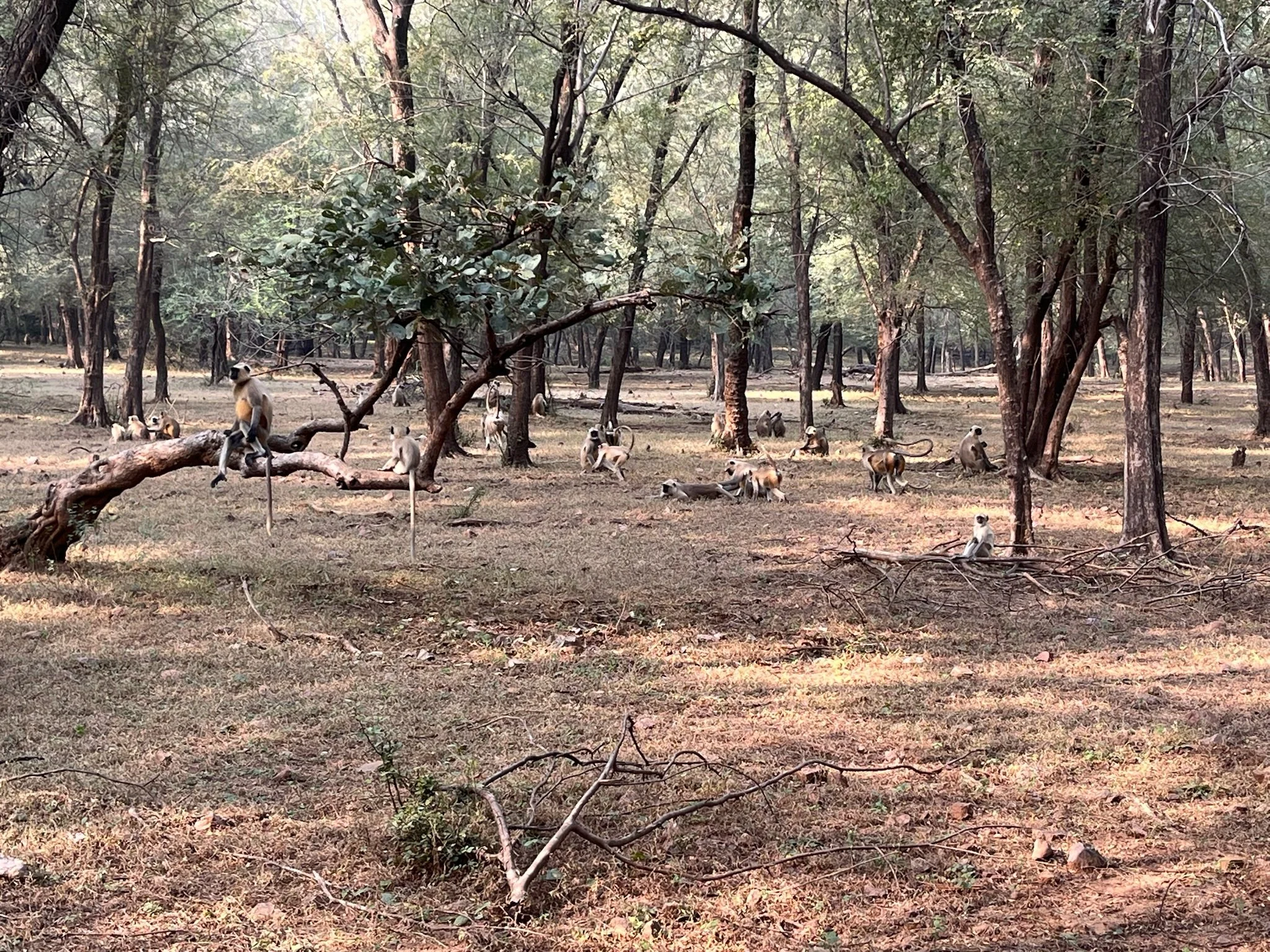 Omdat er maar 1 ding beter is dan 1 safari, doen we er 2. Eentje in de namiddag in zone 9, in een gipsy (een jeep voor 6 personen) en eentje de volgende ochtend in zone 2, in een canter (een soort bus met open dak waar een man of 20 in past). Daarmee hebben we alles gehad, denk ik. We hebben na onze rit uit Jaipur nog net tijd om snel iets te eten voor de gipsy ons aan het hotel komt ophalen. We worden vergezeld door een Indiaas koppel. Er is iemand jarig (we zijn er niet echt uit wie) en voor de gelegenheid hebben ze hun zoontje van 4 meegenomen op safari. ‘t Manneke houdt het een half uurtje vol en dommelt dan in. De sambar-herten ziet hij nog net. Een soort Zuid-Aziatische versie van een edelhert, met indrukwekkend grote geweien, prachtig. Los van de beesten is dit ook een heel mooi park. ‘t Is geen jungle, eerder een soort kruising van bos en dicht begroeide savanne, waar het licht vaak heel mooi tussen de lage bomen invalt. We spotten pauwen, chitals (gevlekte hertjes), wilde zwijnen en dan - net op ‘t moment dat je denkt: “dit zouden even goed de Ardennen kunnen zijn” - een vrolijke bende langur-aapjes. De jeep houdt er onderweg een stevig tempo op na. Hertjes en zwijnen, allemaal goed, kort even stoppen, “Ok, take picture? Cello, let’s go!” en hop, weer verder, we zijn hier ten slotte voor de tijger.