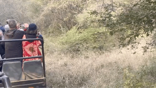 En dan zien we plots 300 meter voor ons op de weg een canter stil staan waar iedereen rechtstaat en er allemaal armen en GSM’s de lucht in gaan. Het zal toch niet waar zijn? “Tiger! Tiger!”, roept de driver. Sam en ik springen recht. Griet (die “Leopard! Leopard!” al verschrikkelijk vond) knijpt Robin ter bescherming bijna dood. Ik zie ‘m in eerste instantie niet (zoals meestal als mensen enthousiast naar dieren beginnen wijzen), gewoon omdat ik niet goed door heb dat het beest zo dicht bij ons loopt. Hij komt op z’n dooie gemak van rechts door het hoge gras, wandelt langs de eerste auto en zo verder links het bos in, alsof de hele wereld ‘m gestolen kan worden. Het luipaard was al behoorlijk straf, maar dit is echt wel next level coolness. Even snel als hij tevoorschijn kwam, is hij ook al weer verdwenen, zonder nog een keer om te kijken. De jeep die met gierende banden achter ons stopt, is te laat. Twee canters, op en al zo’n 40 mensen, hebben vandaag een tijger gezien. En wij waren erbij! En het hoefde nochtans echt niet! Dag en bedankt, Ranthambore, op naar Bundi!