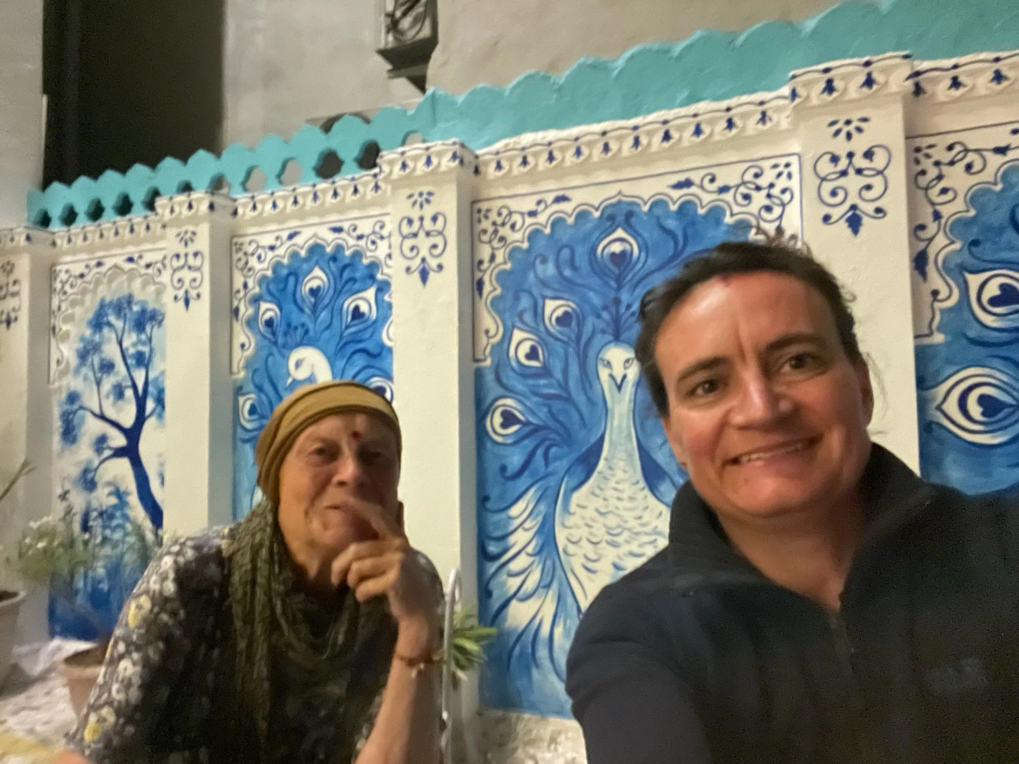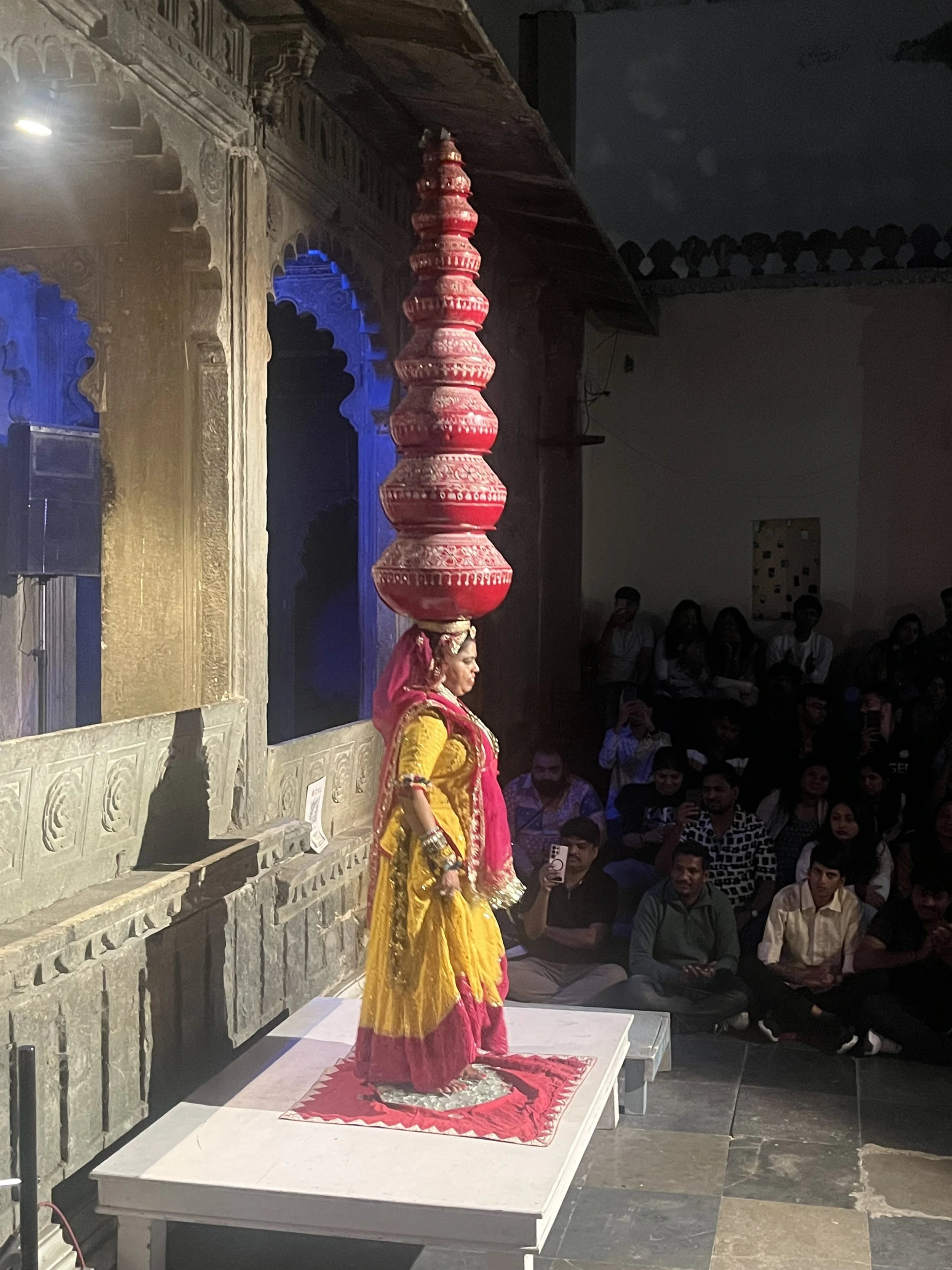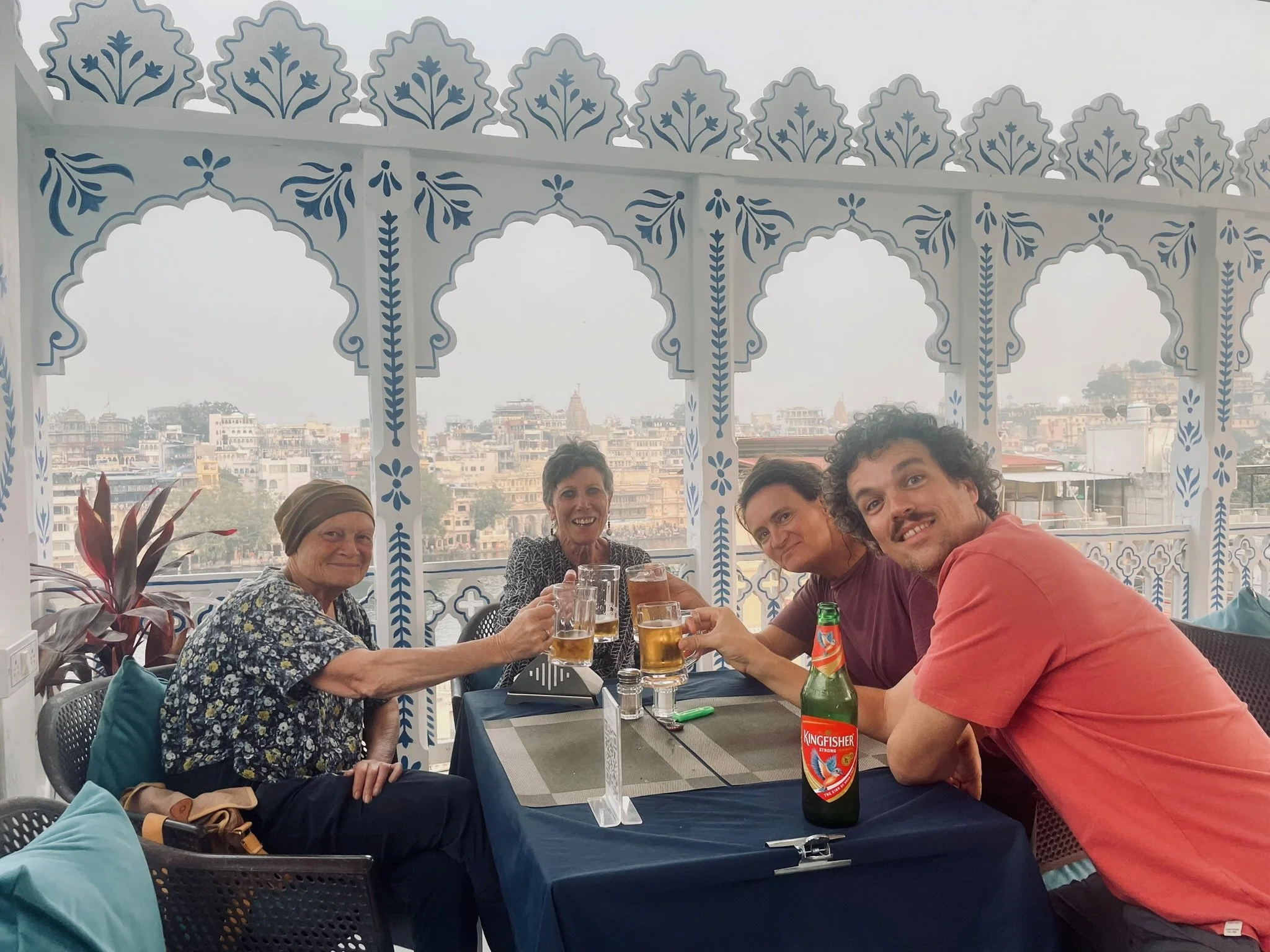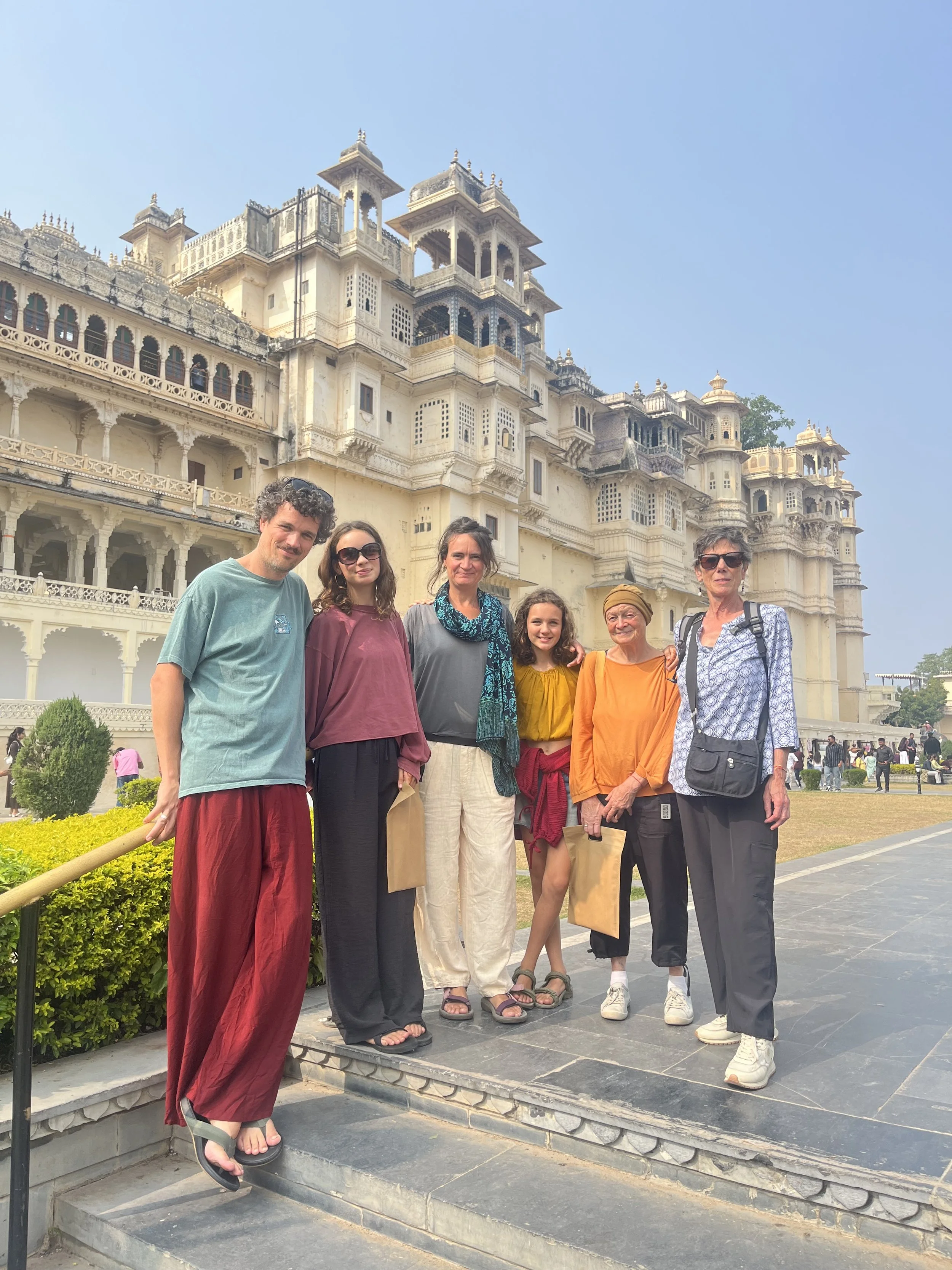 Het weerzien met Meme Toren en Erna is uiteraard de max. Ze zijn een uurtje of voor ons gearriveerd en hebben al een goed restaurantje gevonden, waar we ons met een cocktail op de rooftop installeren. Je moet het die twee wel geven, vind ik. Twee madammen van in de 70, die efkes volledig op hun eigen zonder groepsorganisaties of pakketformules naar India reizen, ik zie het er nog niet zo heel veel doen. Ze vertellen dat ze er in Delhi twee keer na mekaar zijn ingeluisd door een tuktuk-driver die hen meenam naar een plek waar ze helemaal niet moesten zijn, maar sinds die eerste kennismaking gaat ‘t als vanzelf (of zo doen ze het toch lijken). Ze regelen alles old-school, wandelen een reisbureautje binnen en wandelen weer buiten omdat ‘t te duur is. “Fourthousand rupies? Too much!” Die auto fixen ze wel ergens anders. Op een namiddag bezoeken ze het folkloristisch museum in Udaipur terwijl wij met de kinderen wat homeschoolen en tegen de avond hebben ze via een gids 6 tickets gefixt voor een traditionele dansvoorstelling die anders altijd bomvol zit. Dat de gids die hen beloofd heeft om de wachtrij over te slaan ‘s avonds vaneigens nergens meer te bespeuren is, maakt niet uit. De show is mooi, de muziek luid en de kruiken op het hoofd heel hoog.
