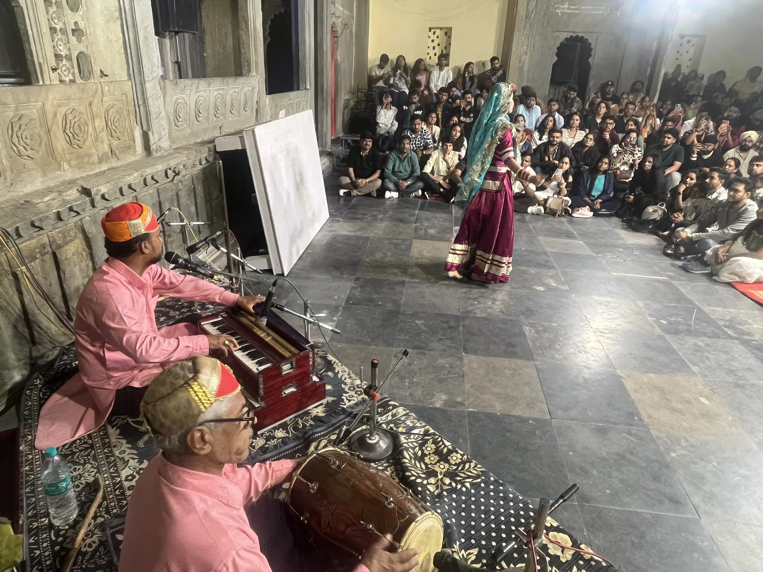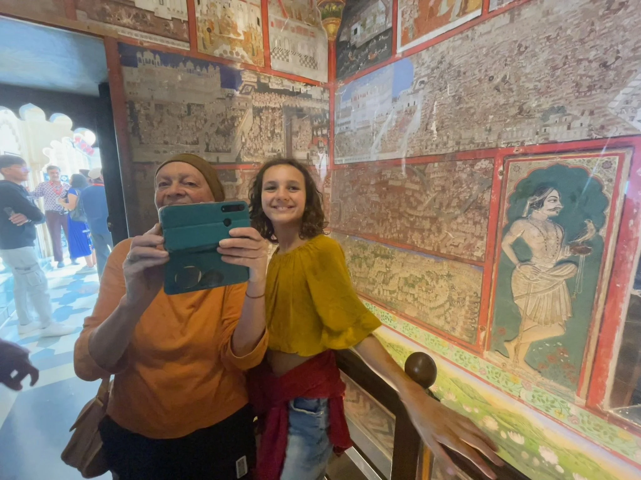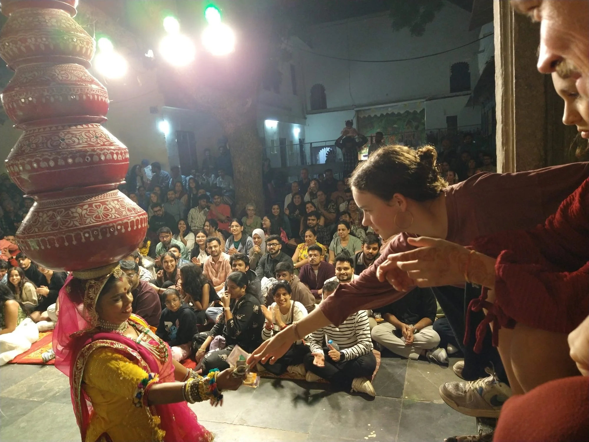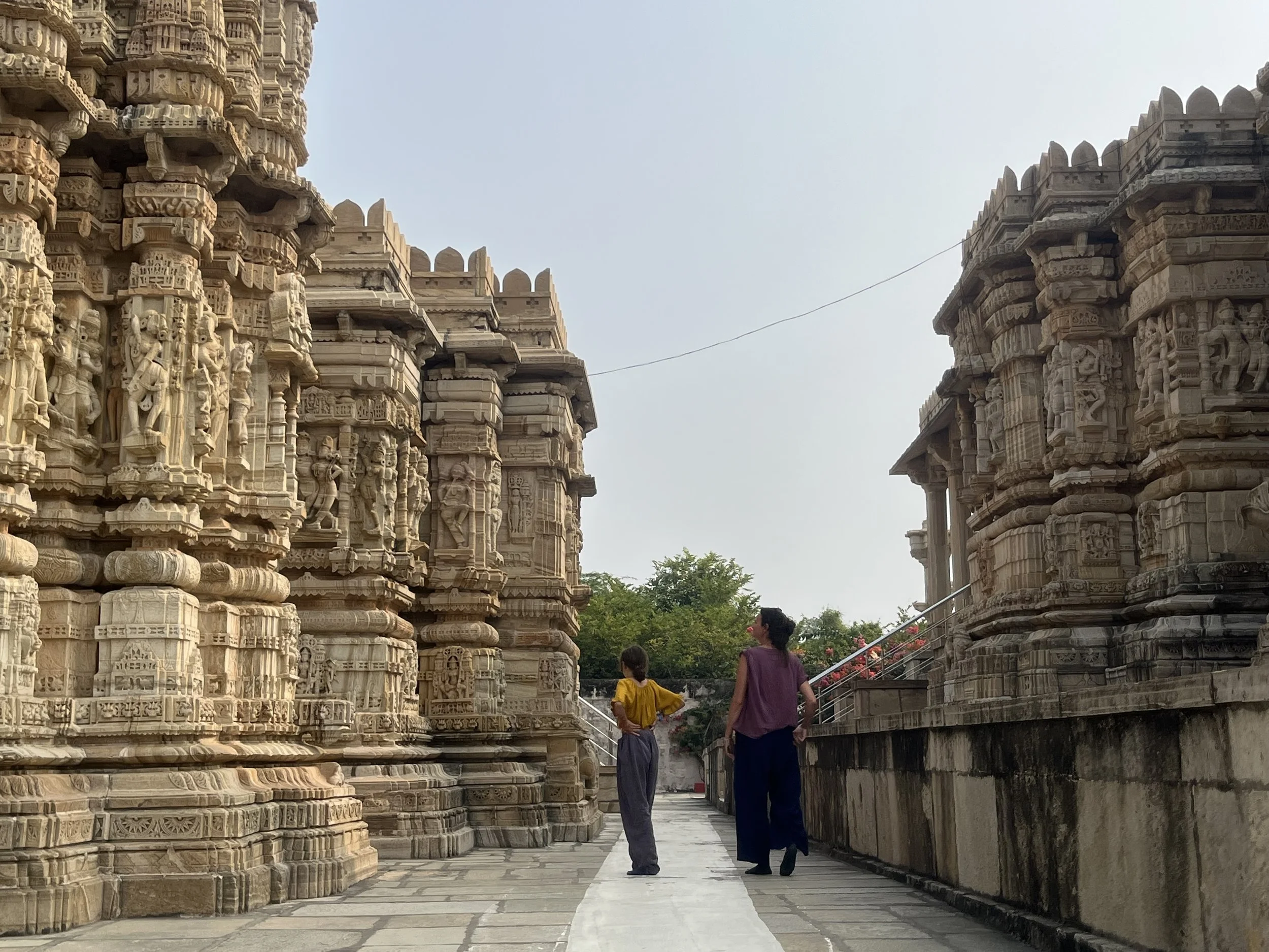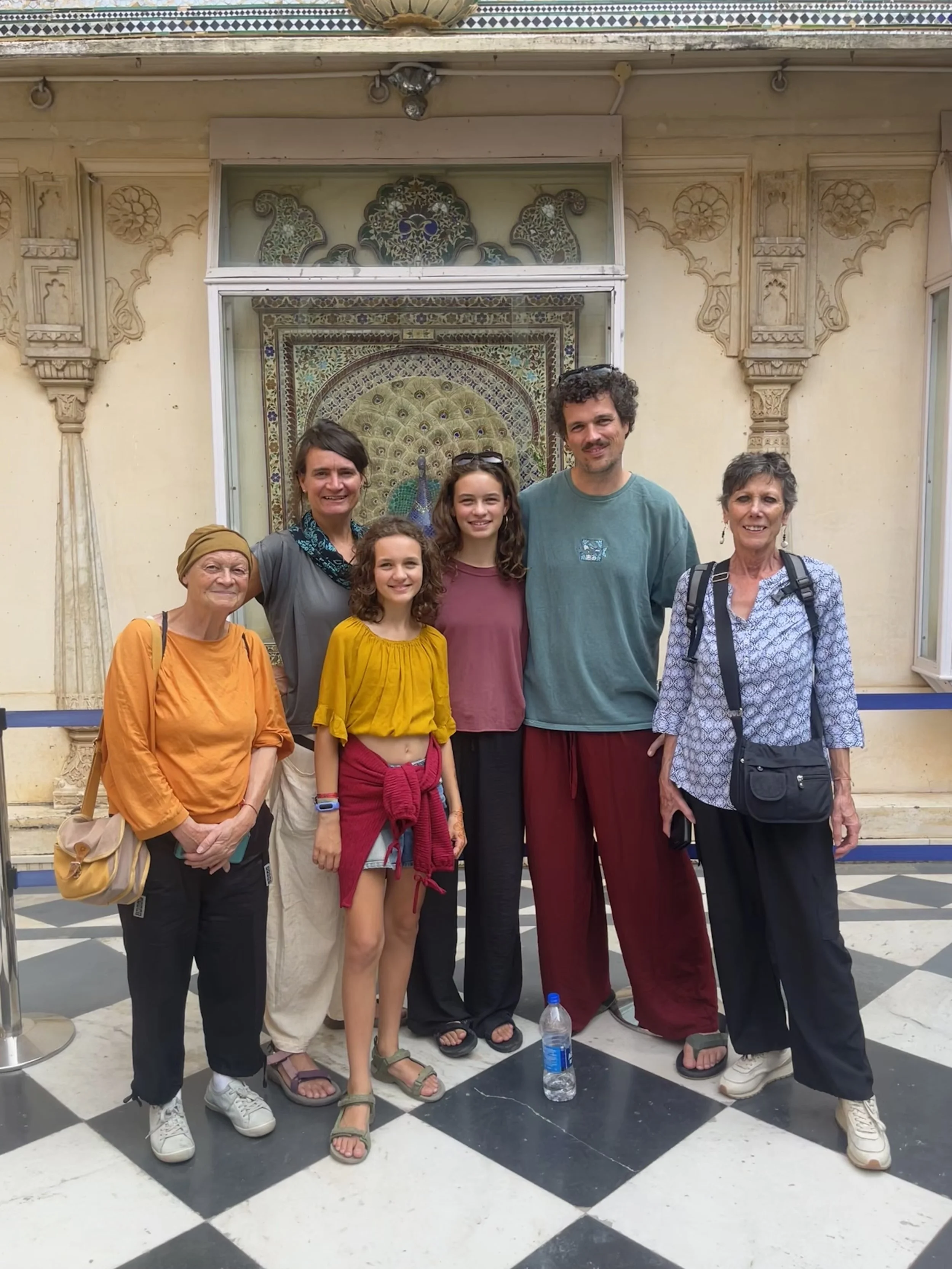 Het weerzien met Meme Toren en Erna is uiteraard de max. Ze zijn een uurtje of voor ons gearriveerd en hebben al een goed restaurantje gevonden, waar we ons met een cocktail op de rooftop installeren. Je moet het die twee wel geven, vind ik. Twee madammen van in de 70, die efkes volledig op hun eigen zonder groepsorganisaties of pakketformules naar India reizen, ik zie het er nog niet zo heel veel doen. Ze vertellen dat ze er in Delhi twee keer na mekaar zijn ingeluisd door een tuktuk-driver die hen meenam naar een plek waar ze helemaal niet moesten zijn, maar sinds die eerste kennismaking gaat ‘t als vanzelf (of zo doen ze het toch lijken). Ze regelen alles old-school, wandelen een reisbureautje binnen en wandelen weer buiten omdat ‘t te duur is. “Fourthousand rupies? Too much!” Die auto fixen ze wel ergens anders. Op een namiddag bezoeken ze het folkloristisch museum in Udaipur terwijl wij met de kinderen wat homeschoolen en tegen de avond hebben ze via een gids 6 tickets gefixt voor een traditionele dansvoorstelling die anders altijd bomvol zit. Dat de gids die hen beloofd heeft om de wachtrij over te slaan ‘s avonds vaneigens nergens meer te bespeuren is, maakt niet uit. De show is mooi, de muziek luid en de kruiken op het hoofd heel hoog.