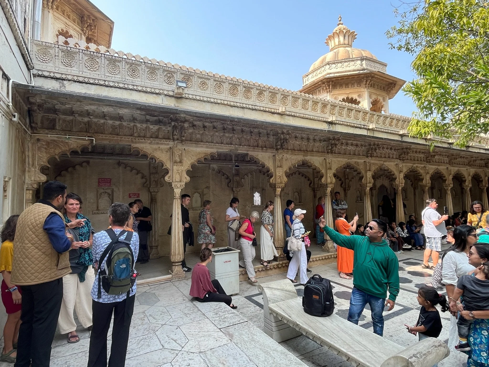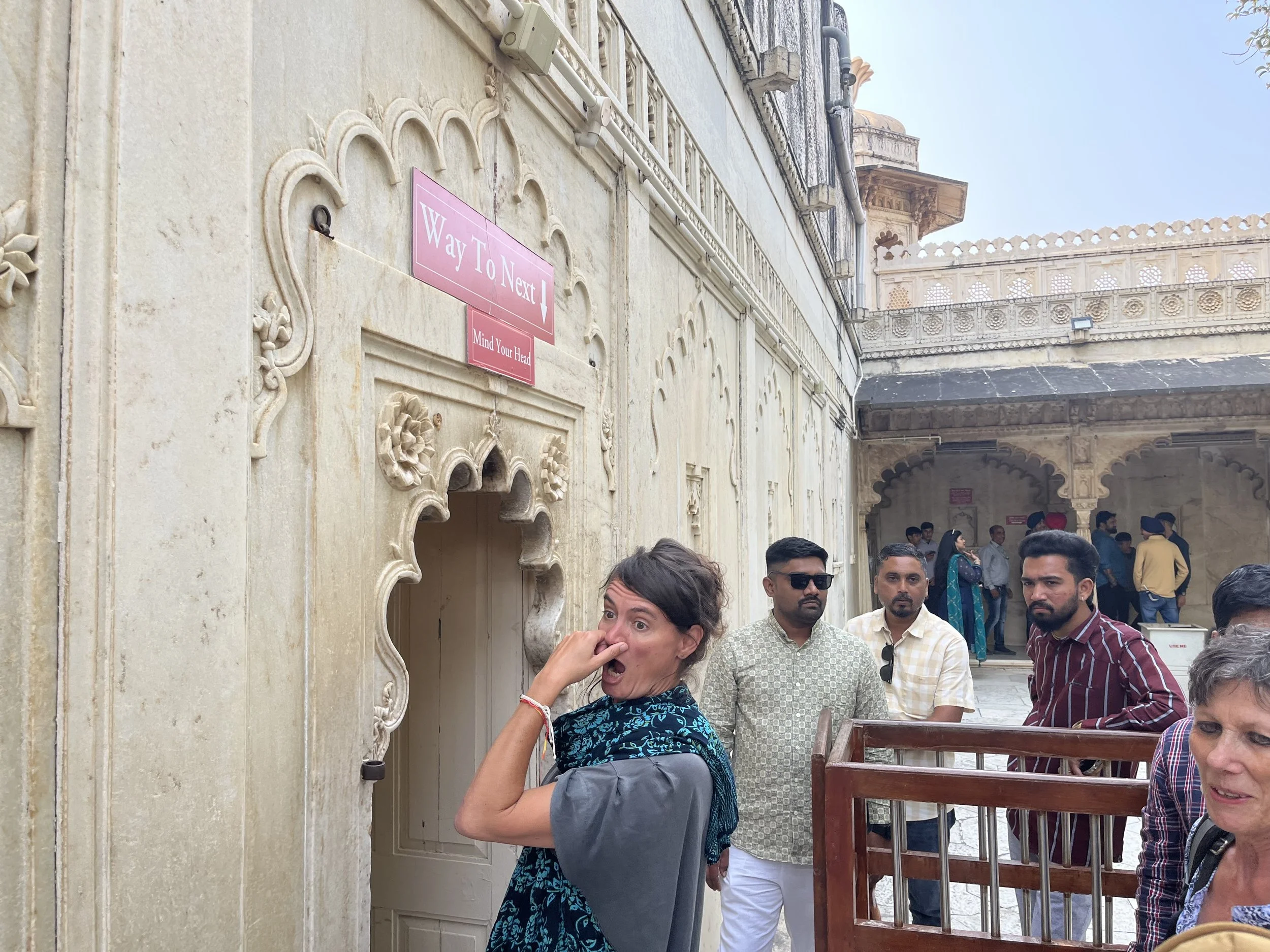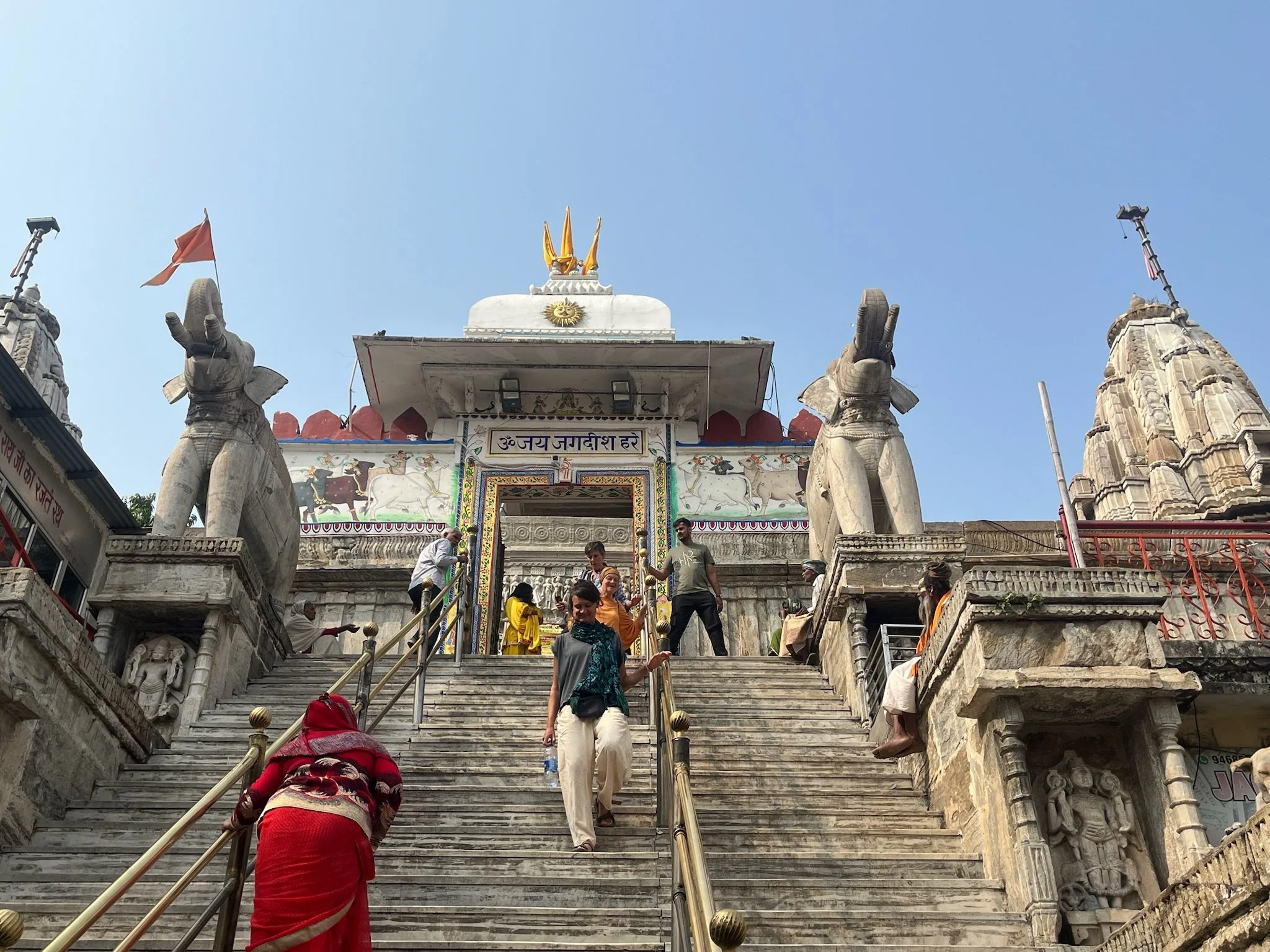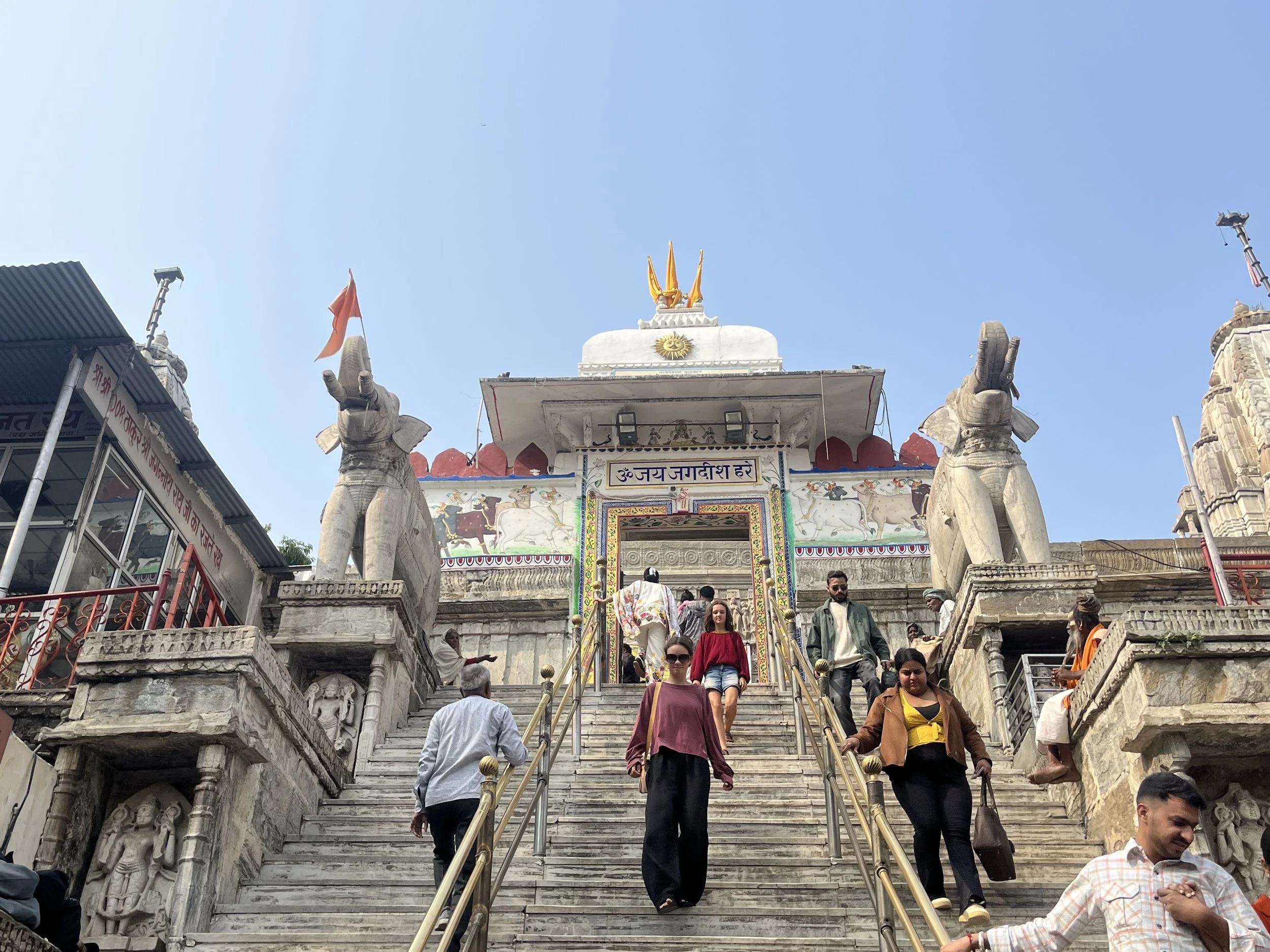 Een stad in Rajasthan zou geen stad in Rajasthan zijn zonder een groot paleis. We brengen het uiteraard een bezoekje en passeren onderweg naar daar langs de prachtige Jagdish tempel, met opnieuw ontelbaar veel gedetailleerde reliëfs. Ik zou er uren kunnen rondlopen om te kijken wie wie is en wat die dansende en werkende mannekes 500 jaar geleden zoal deden in het dagelijks leven, maar ik ben de enige en de dag is nog lang. In het paleis beginnen we ondertussen een aantal dingen te herkennen. Elk paleis heeft “special glasses from Belgium” en wij vragen ons af wat ze zouden antwoorden mochten we zeggen dat we van Zweden zijn (“oh yes, this palace has three tables from Ikea.”). Er zijn grote binnenruimtes voor feesten, er zijn rijkelijk gedecoreerde spiegelzalen, uitzonderlijke afbeeldingen van allerlei goden en er is ook altijd wel een zaal met curiositeiten. In Jaipur waren het de kleren en het transport, in Udaipur zijn het de wapens en een paard dat zich vermomde als olifant. Typisch aan het paleis van Udaipur is ook dat het gebouwd is als doolhof en superveel kleine gangetjes heeft. Perfect op maat van Meme Toren, de rest moet zich bukken. In de meer recente geschiedenis was er in elke stad ook wel ergens een maharaja die het lokale ondernemersschap wilde stimuleren door allerlei winkeltjes binnen de paleismuren te trekken met “real products and honnest prices, not like in the streets”. En daar word je dan als toerist op het einde van de tour uiteraard altijd afgezet. Als je niet oplet in de beide betekenissen van het woord.