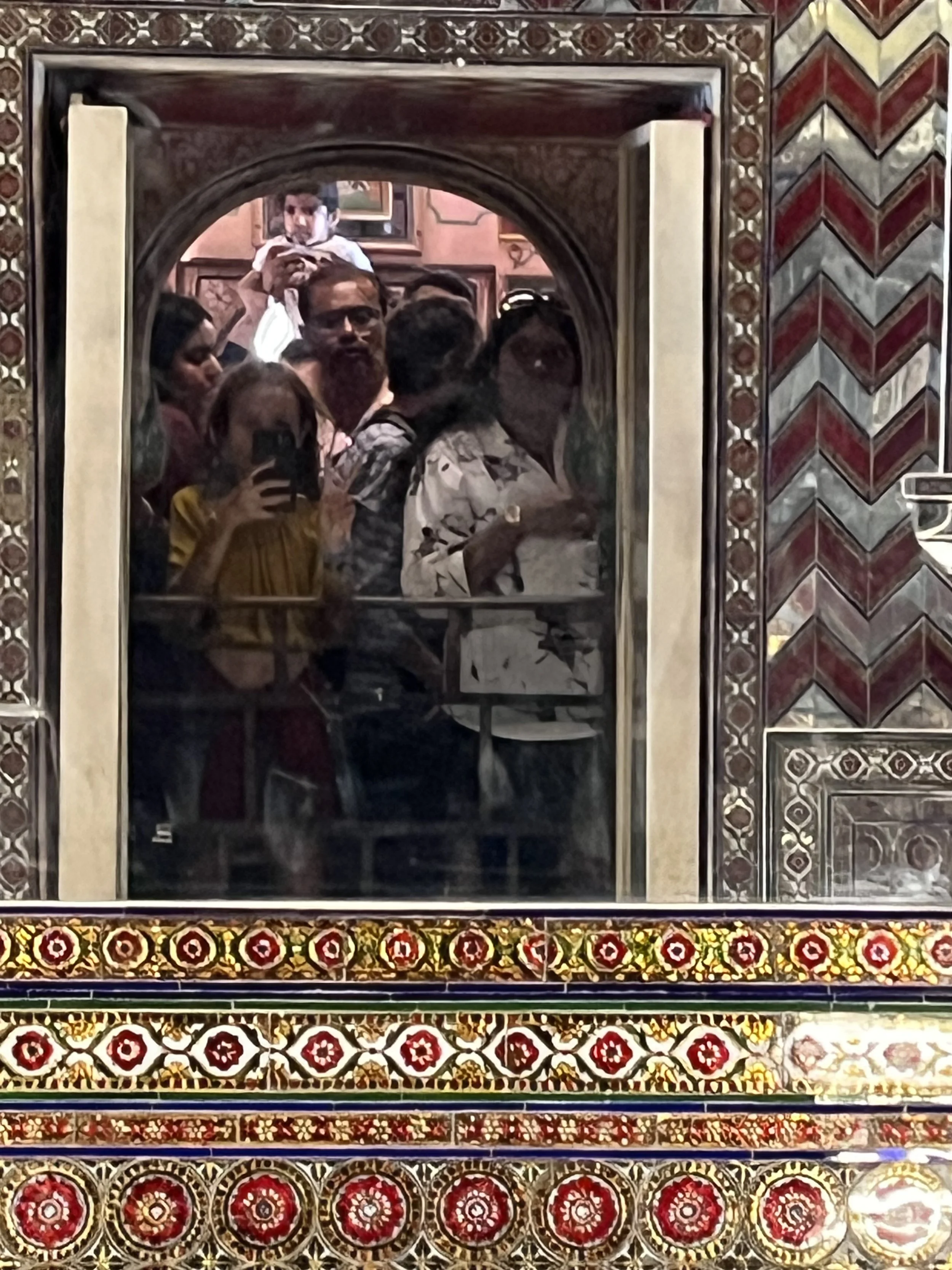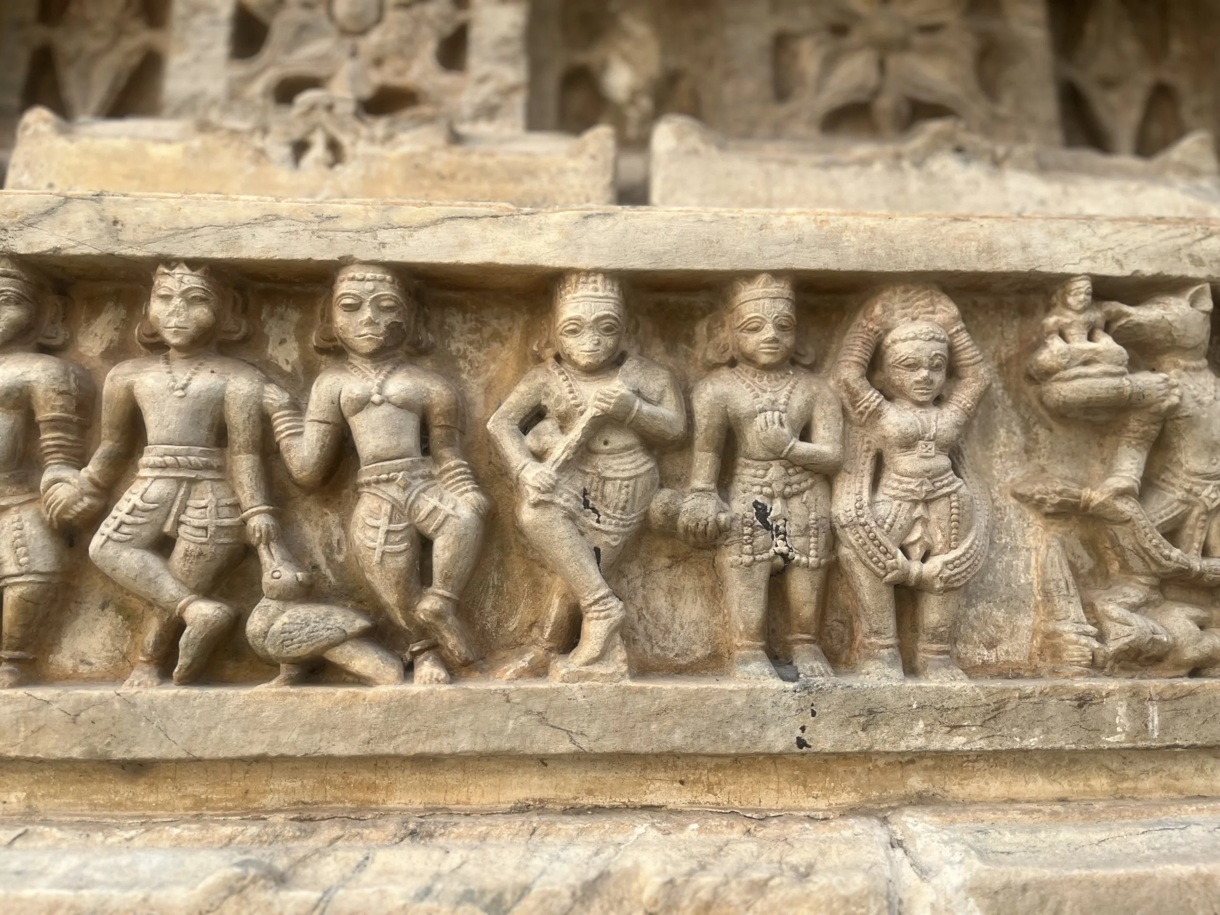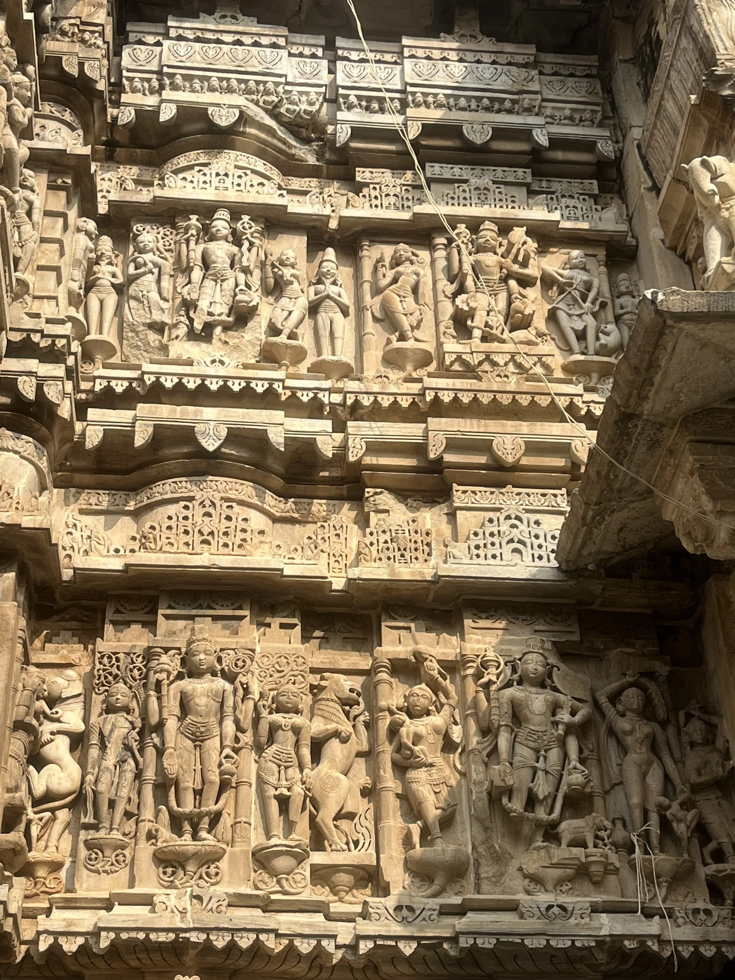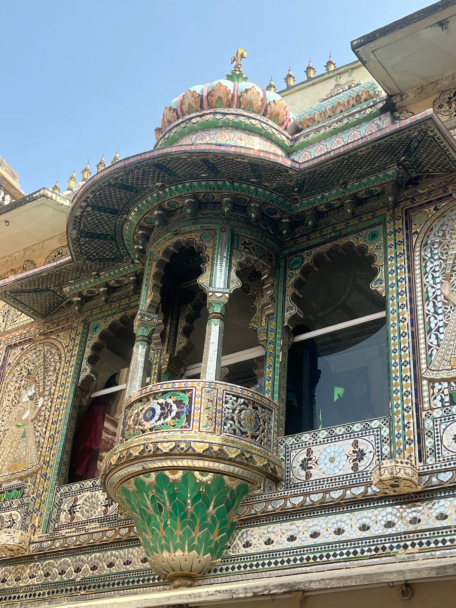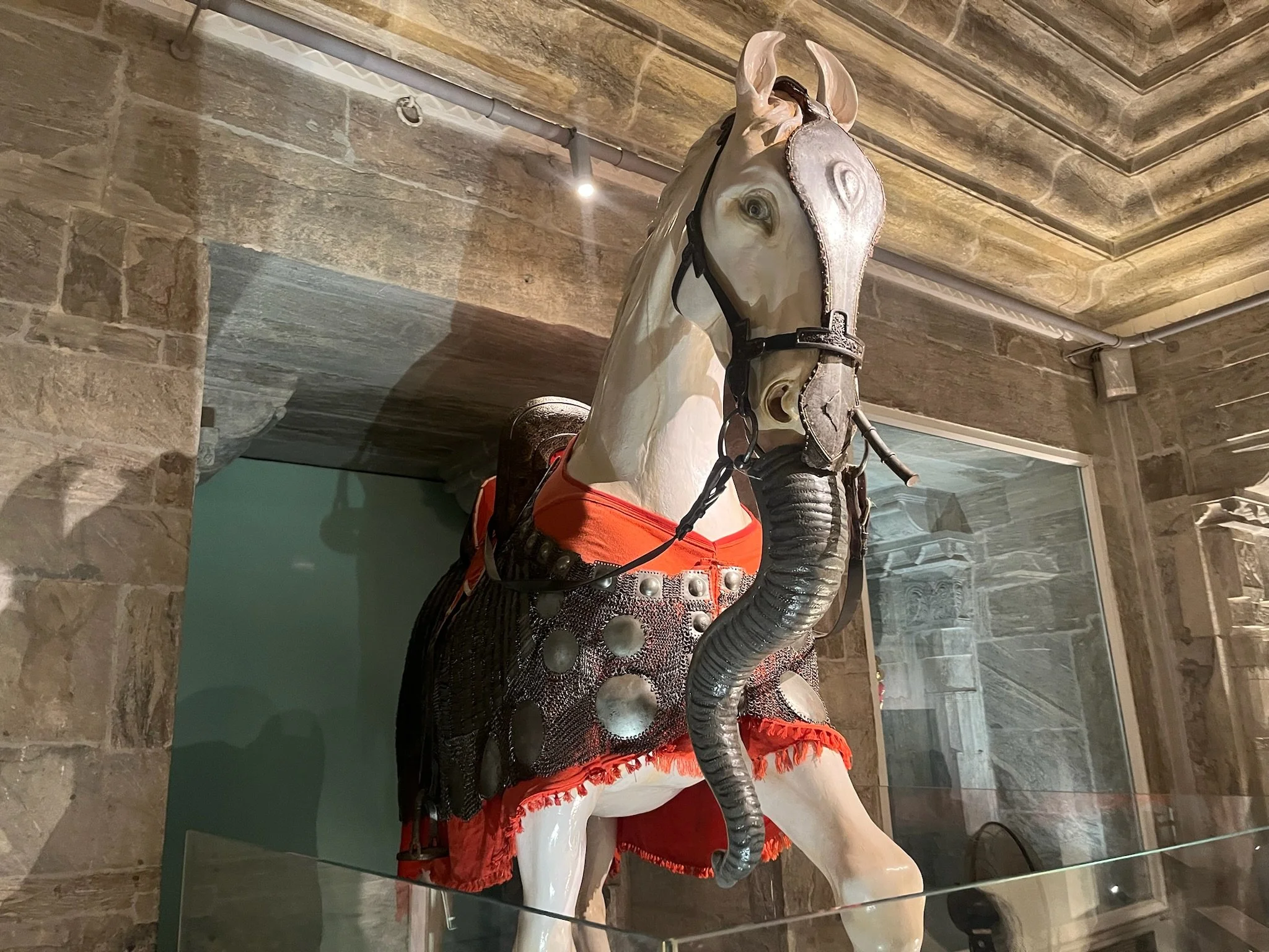 Een stad in Rajasthan zou geen stad in Rajasthan zijn zonder een groot paleis. We brengen het uiteraard een bezoekje en passeren onderweg naar daar langs de prachtige Jagdish tempel, met opnieuw ontelbaar veel gedetailleerde reliëfs. Ik zou er uren kunnen rondlopen om te kijken wie wie is en wat die dansende en werkende mannekes 500 jaar geleden zoal deden in het dagelijks leven, maar ik ben de enige en de dag is nog lang. In het paleis beginnen we ondertussen een aantal dingen te herkennen. Elk paleis heeft “special glasses from Belgium” en wij vragen ons af wat ze zouden antwoorden mochten we zeggen dat we van Zweden zijn (“oh yes, this palace has three tables from Ikea.”). Er zijn grote binnenruimtes voor feesten, er zijn rijkelijk gedecoreerde spiegelzalen, uitzonderlijke afbeeldingen van allerlei goden en er is ook altijd wel een zaal met curiositeiten. In Jaipur waren het de kleren en het transport, in Udaipur zijn het de wapens en een paard dat zich vermomde als olifant. Typisch aan het paleis van Udaipur is ook dat het gebouwd is als doolhof en superveel kleine gangetjes heeft. Perfect op maat van Meme Toren, de rest moet zich bukken. In de meer recente geschiedenis was er in elke stad ook wel ergens een maharaja die het lokale ondernemersschap wilde stimuleren door allerlei winkeltjes binnen de paleismuren te trekken met “real products and honnest prices, not like in the streets”. En daar word je dan als toerist op het einde van de tour uiteraard altijd afgezet. Als je niet oplet in de beide betekenissen van het woord.
