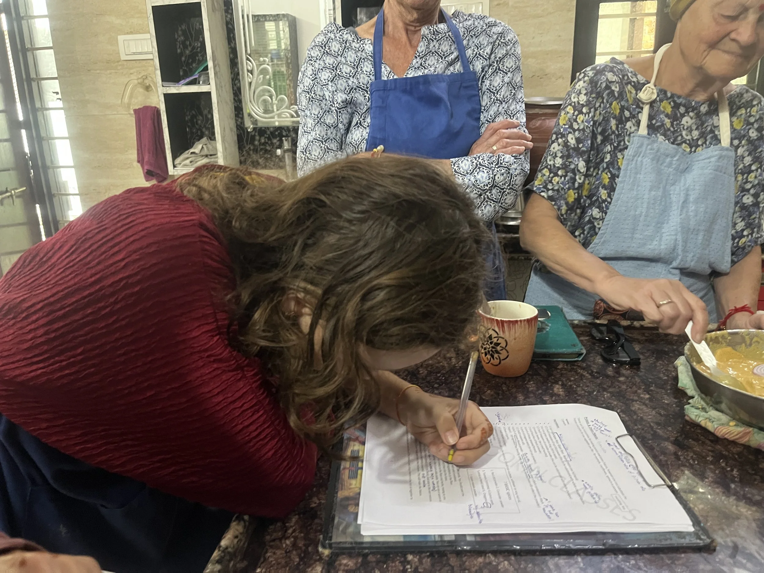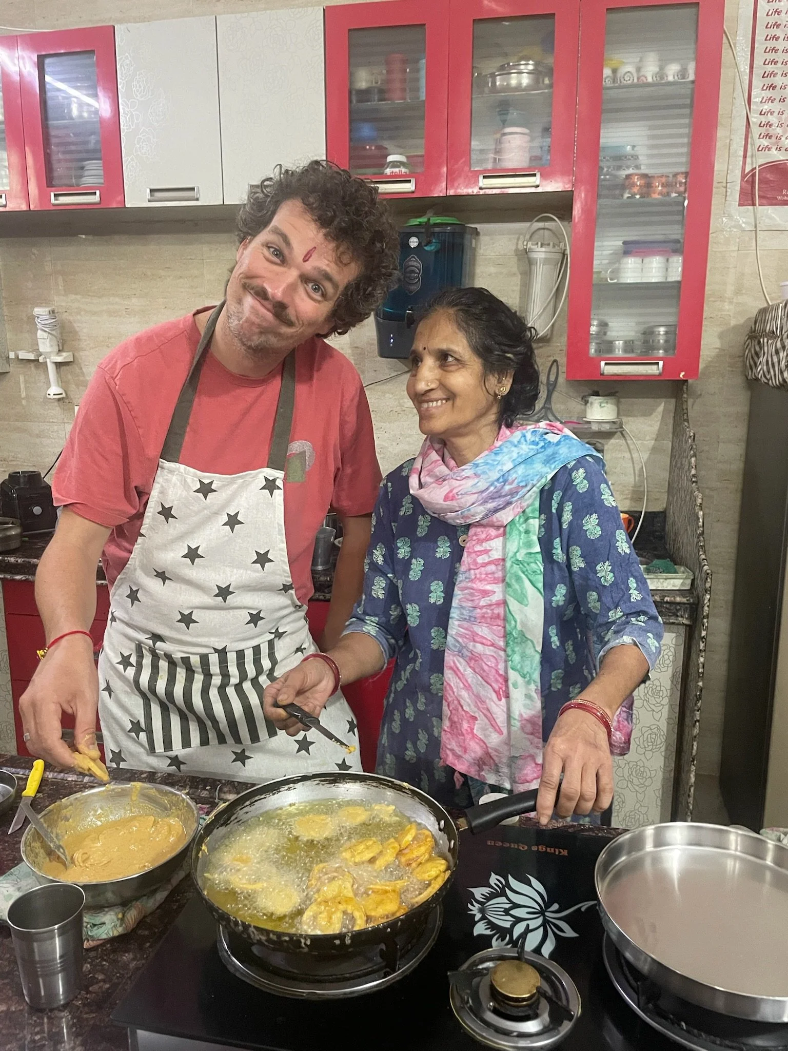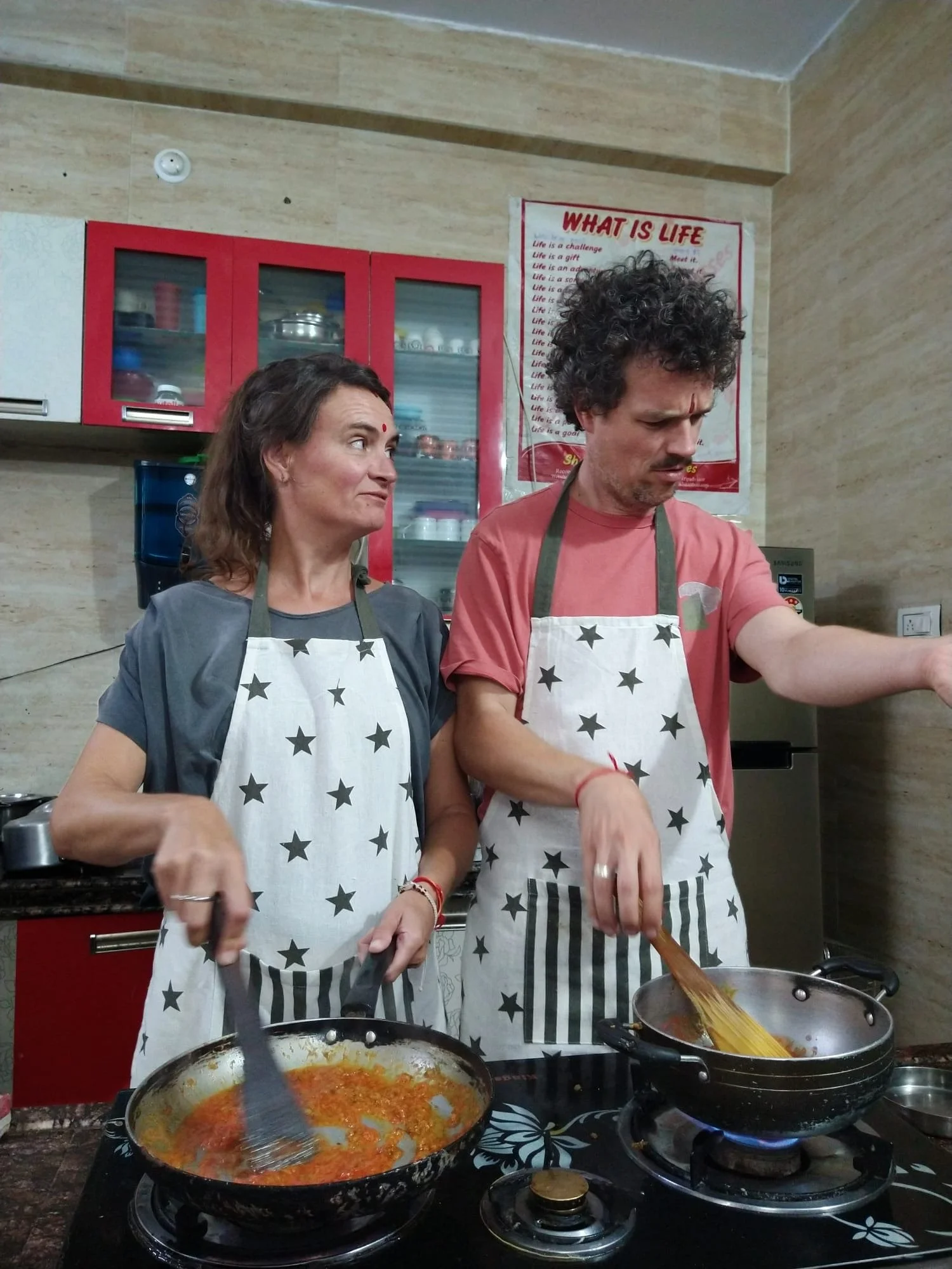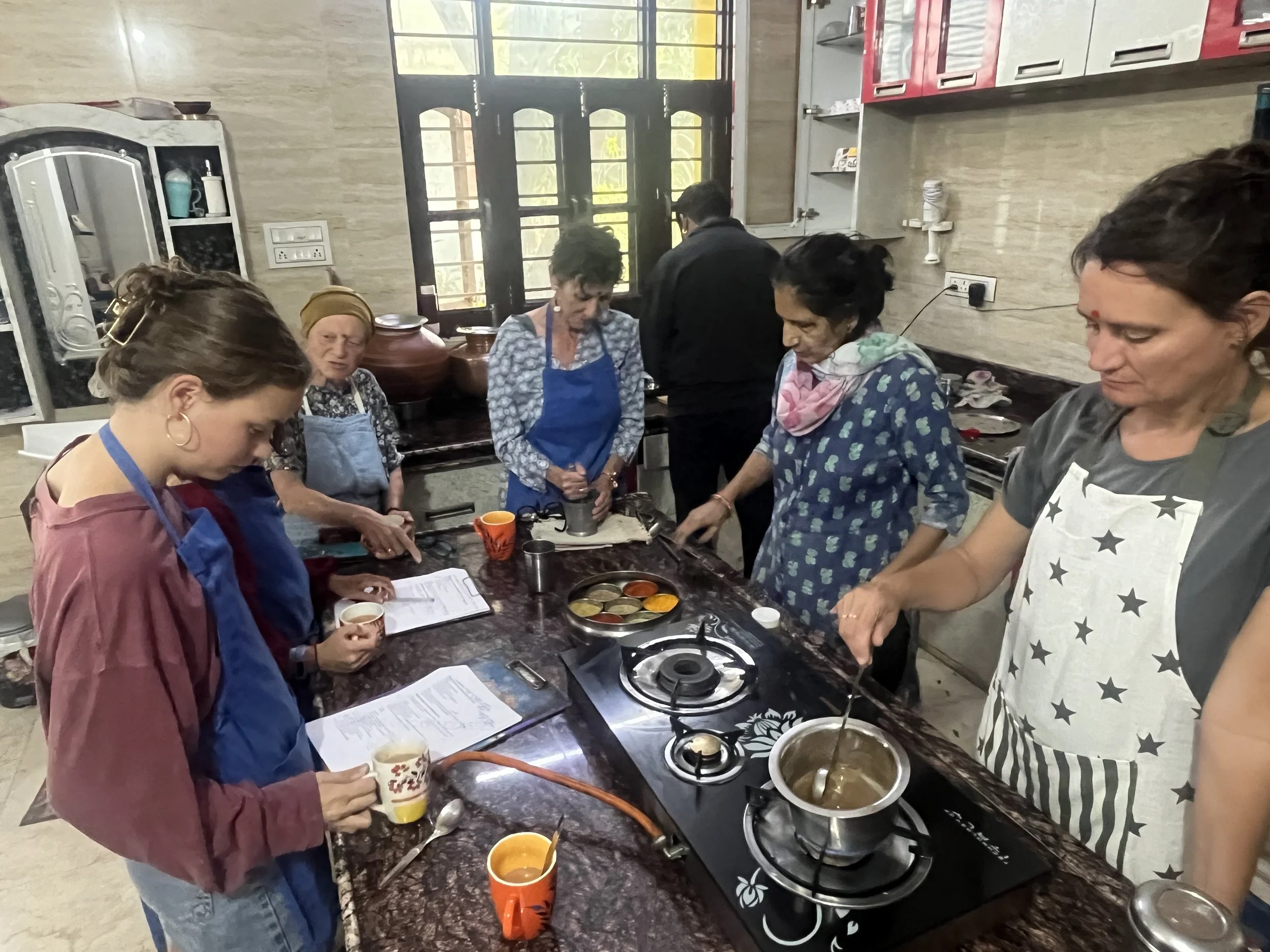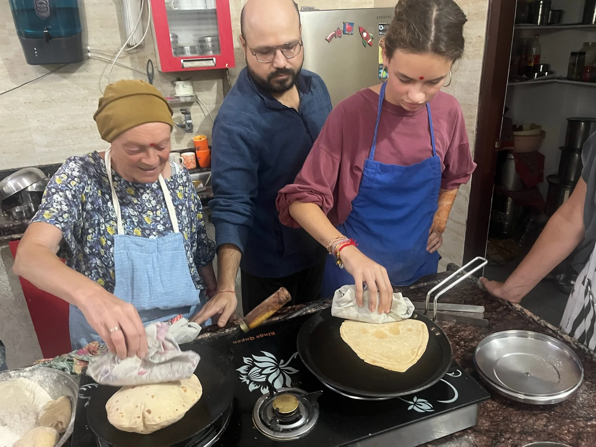 Maar India blijft tussen alle hectiek, lawaai en gekte nog altijd heel plezant. We leren het eten wat beter kennen door op een dag samen met Meme Toren en Erna een cooking class te doen bij Shashi, een vrouw met een bijzondere levenswandel. Haar man is ooit vermoord door een familielid en ze heeft een tijdje de laundry gedaan voor reizigers om rond te komen. Tot een toerist een jaar of 13 geleden blijkbaar opmerkte dat ze goed kon koken en sindsdien doet ze dat. Ze legt ons een hele bundel voor en wij denken naïef dat we er een paar gerechten uit gaan klaarmaken, maar we bereiden álles: allo pakora, naan, chapati, parantha, raita, paneer en magic sauce, de basis voor elke curry. Als afsluiter maken we ook nog een dessert en leren we ‘t verschil tussen tikka en tandoori. Shashi doet een groot deel van ‘t werk en geeft ons af en toe taakjes - “You, come here, stir!” - op een grappig sarcastische manier - “Ok, exam: pass!”. Sam en Robin noteren ondertussen alles heel ijverig. Je zou bijna beginnen denken dat ze school missen. De hele cooking class neemt een uur of drie in beslag en op ‘t einde hebben we echt ongelofelijk veel heel lekker eten. Wat we niet op krijgen mogen we meenemen, dus we kunnen er ‘s avonds nog eens een tweede keer van genieten. Meme Toren is in de wolken, want zij laat nooit eten liggen. We krijgen de eerste dag ons ontbijt niet helemaal op en tot ieders verbazing haalt ze twee dagen later vrolijk het restje boterham met ei uit haar sjakosj om verder op te zeten. Als India level 2 is, is Meme Toren level 3.