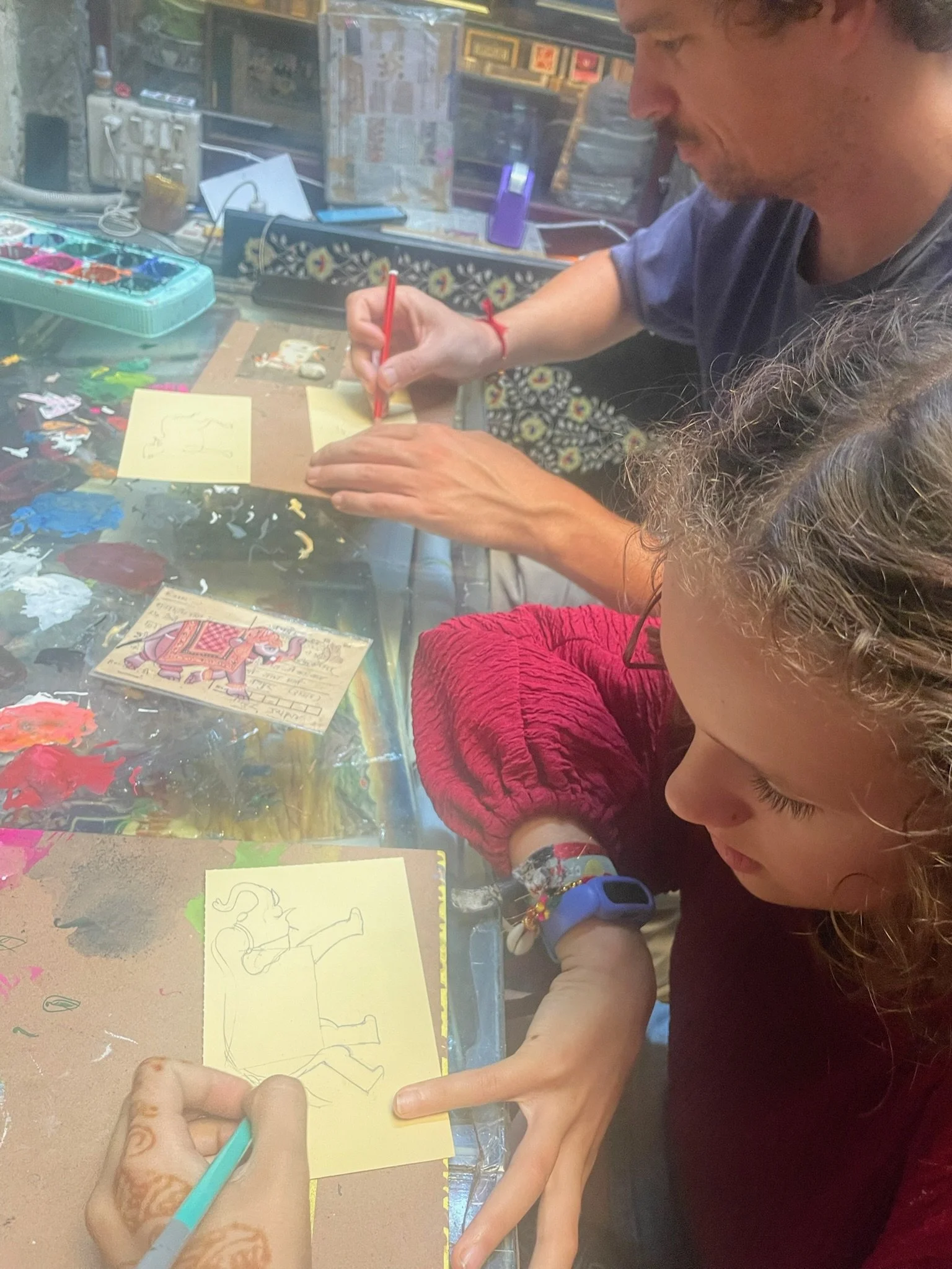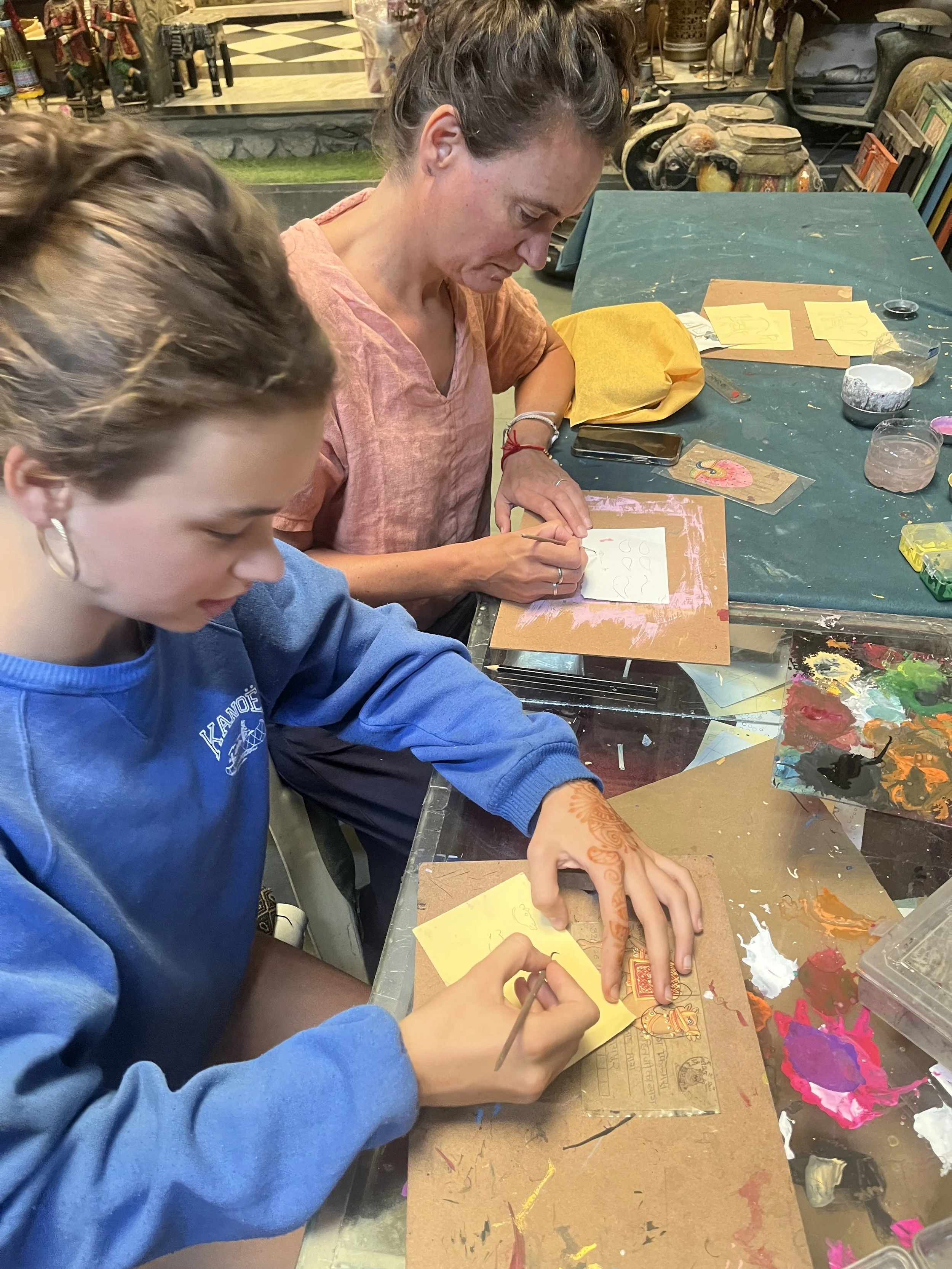 De laatste dag gaan Meme Toren en Erna op excursie naar Ranakphur en Kumbbalgargh en ondertussen gaan wij eens proberen of we naast koken ook kunnen miniature-painten. Omdat ze hier in Udaipur nog nooit van Van Eyck gehoord hebben, vinden ze die piepkleine tekeningetjes vol details ongelofelijk straf. Wij vinden de figuurtjes vooral charmant en ‘t lijkt wel eens tof om het zelf ook te proberen. We spreken af dat we elk een dier zullen proberen tekenen; Robin de olifant, Griet de pauw, Sam de kameel en Senne de koe. De koe is verreweg het makkelijkste dier, maar dat zou je niet zeggen als je mijn koe ziet. Ik snap er ook echt geen hol van en begrijp niet waarom je met een heel fijn borsteltje met eekhoorn-haartjes en een vrije hand een zwarte lijn moet proberen tekenen, terwijl je met een fijn zwart stiftje lekker stevig op papier kan drukken om hetzelfde resultaat te krijgen. In mijn verdediging helpt de leraar deze keer ook niet echt. Hij zet ons in z’n atelier/winkel half in gang en hangt daarna de hele tijd aan de telefoon of zet nail art bij meisjes die op weg zijn naar een trouwfeest. Na een tijdje haak ik af, de uier hangt scheef en de koe is groen, maar daar zullen we ‘t mee doen. Sam haar kameel is prachtig, Griet haar pauw ook en Robin is niet helemaal blij met haar olifant, maar ‘t is het moeilijkste dier van al en ik vind ‘m perfect gelukt. Het resultaat is weldra te bewonderen in Expo Zonnebloem, naast de lampionnen, bamboe-lampjes en woodcarvings. Ik voorzie de hapjes.