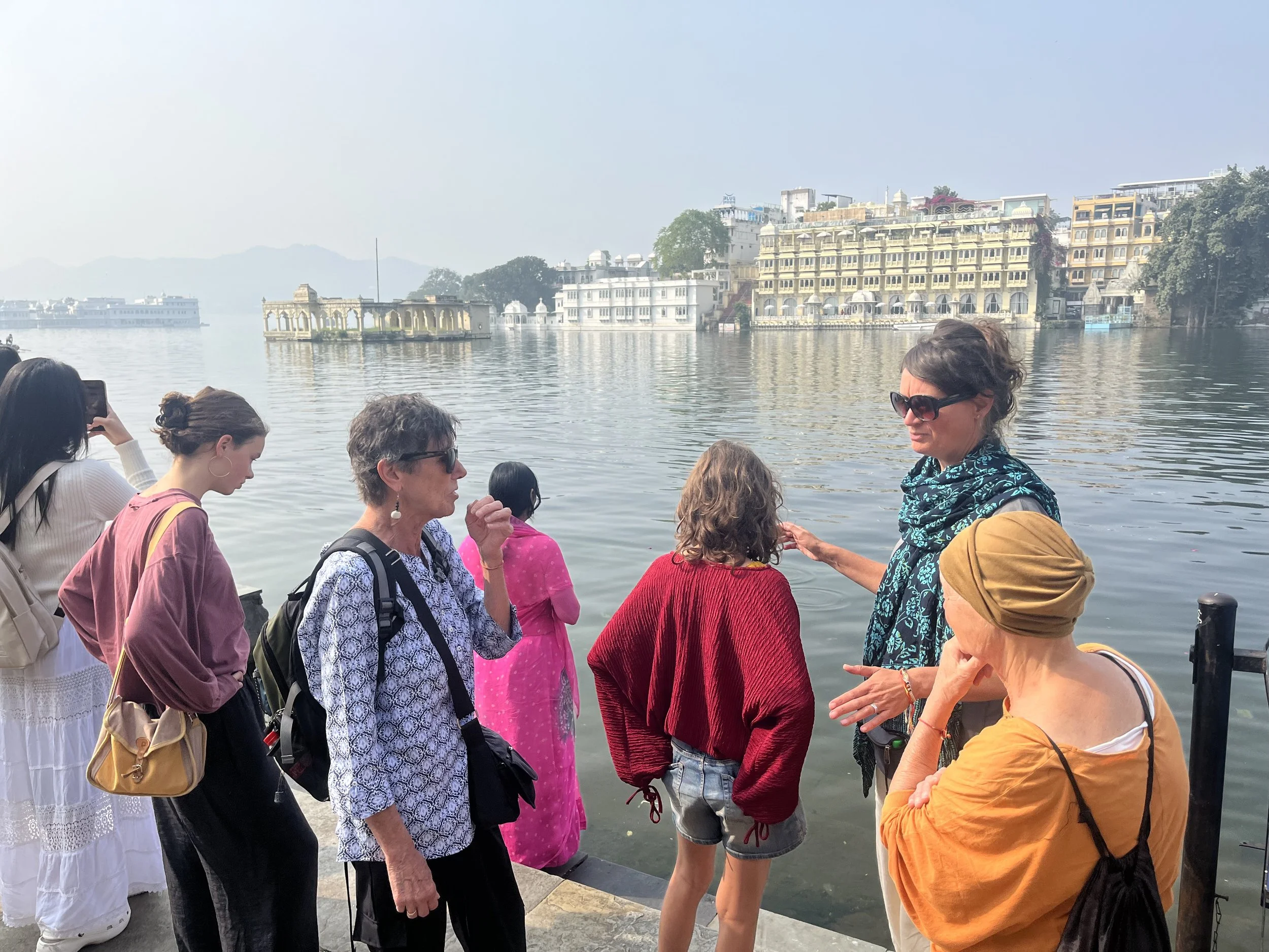 We rijden langs 7 “pols” (poorten) naar boven en stoppen als eerste bij het paleis, of wat daar nog van overblijft. In tegenstelling tot Jaipur of Bundi is dit vooral een ruïne, als een soort stille getuige van alle epische confrontaties. Tot drie keer toe werd Chittorgargh veroverd en heroverd en omdat de Mewar van geen overheersing wilden weten, gingen de mannen strijdend ten onder en pleegden 30.000 vrouwen en kinderen jauhar, een massa-zelfmoord. Gelukkig wonnen ze soms ook en om dat te vieren bouwde de toenmalige koning Rana Khumba een grote overwinningstoren (die wel mooi bewaard is). Het mooiste in het fort zijn echter de prachtige tempels, met superfijne reliëfs en duizenden figuurtjes en godenbeelden. We zien een Jain-tempel (en zijn daar zowaar de enige bezoekers, eindelijk, rust!), eentje gewijd aan Vishnu en een laatste aan Kali, de god van de kracht. Die wordt druk bezocht door een bonte menigte: de trappen staan vol devote gelovigen, bedelaars, koeien, honden en langoer-aapjes. We wandelen nog langs het waterpaleis, gebouwd voor een of andere prinses uit 1000 en 1 nacht , maar dat stelt niet zoveel voor. Griet en Sam zijn er een grotere bezienswaardigheid dan het paleis zelf. Na een uurtje zijn we verzadigd, dus we eten snel ergens thali en zetten koers naar de nieuwe hoofdstad van het Mewar-rijk. Nadat Chittorgarh immers voor de zoveelste keer bloedig was ingenomen, had de toenmalige koning er genoeg van en ging hij ergens anders wonen. En daar, in het diepe zuiden van Rajasthan, hebben deze vier simpele zielen uit Gent afgesproken met 2 kranige dames uit Wetteren en Melle. Udaipur, het was nog nooit zo Oost-Vlaams.