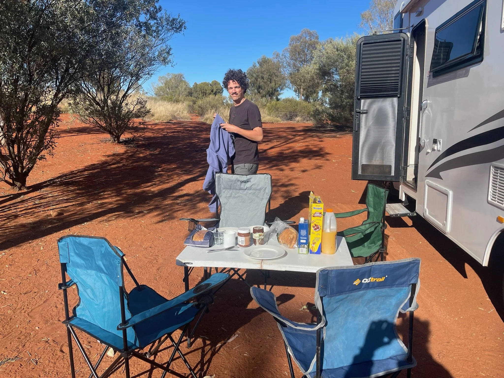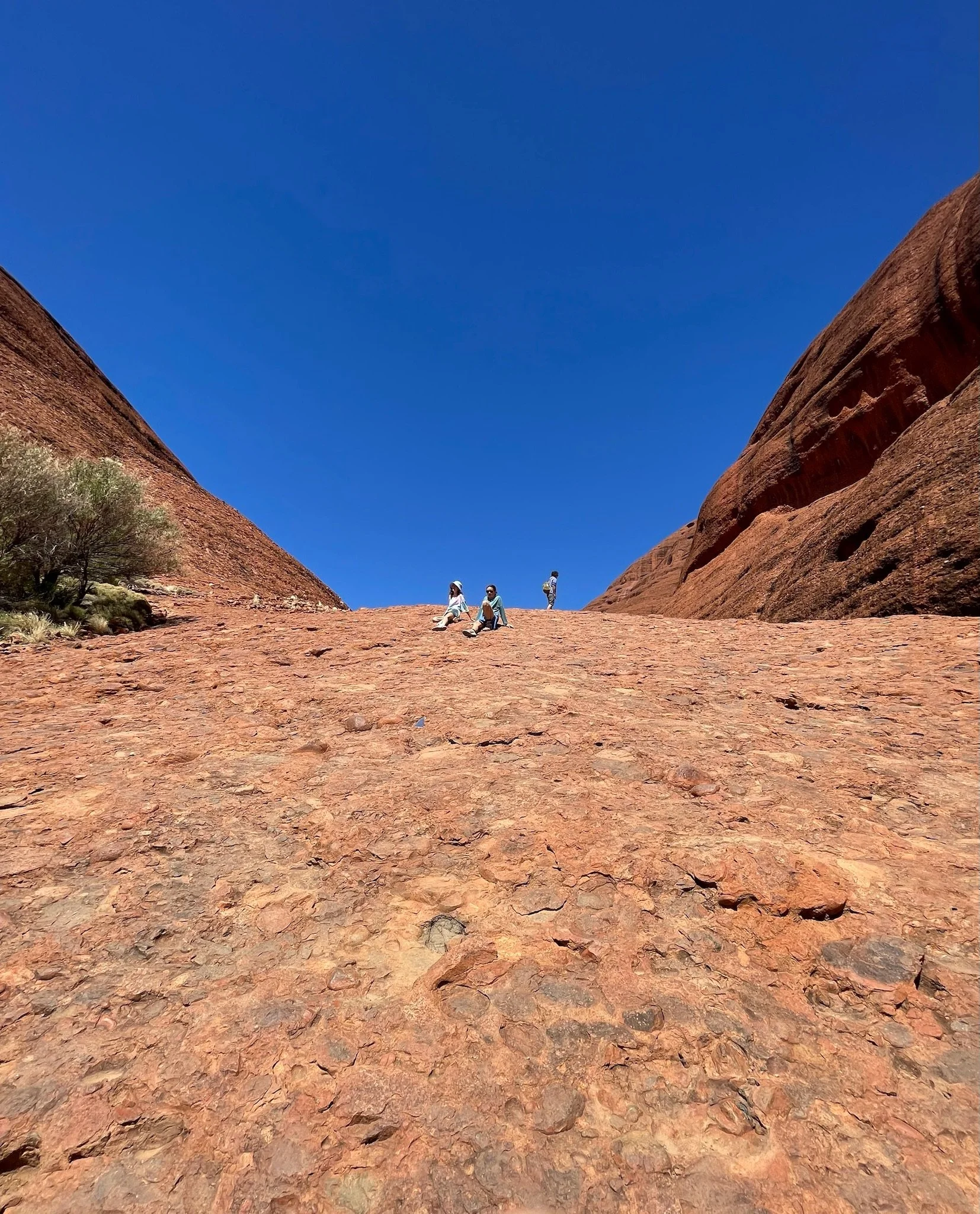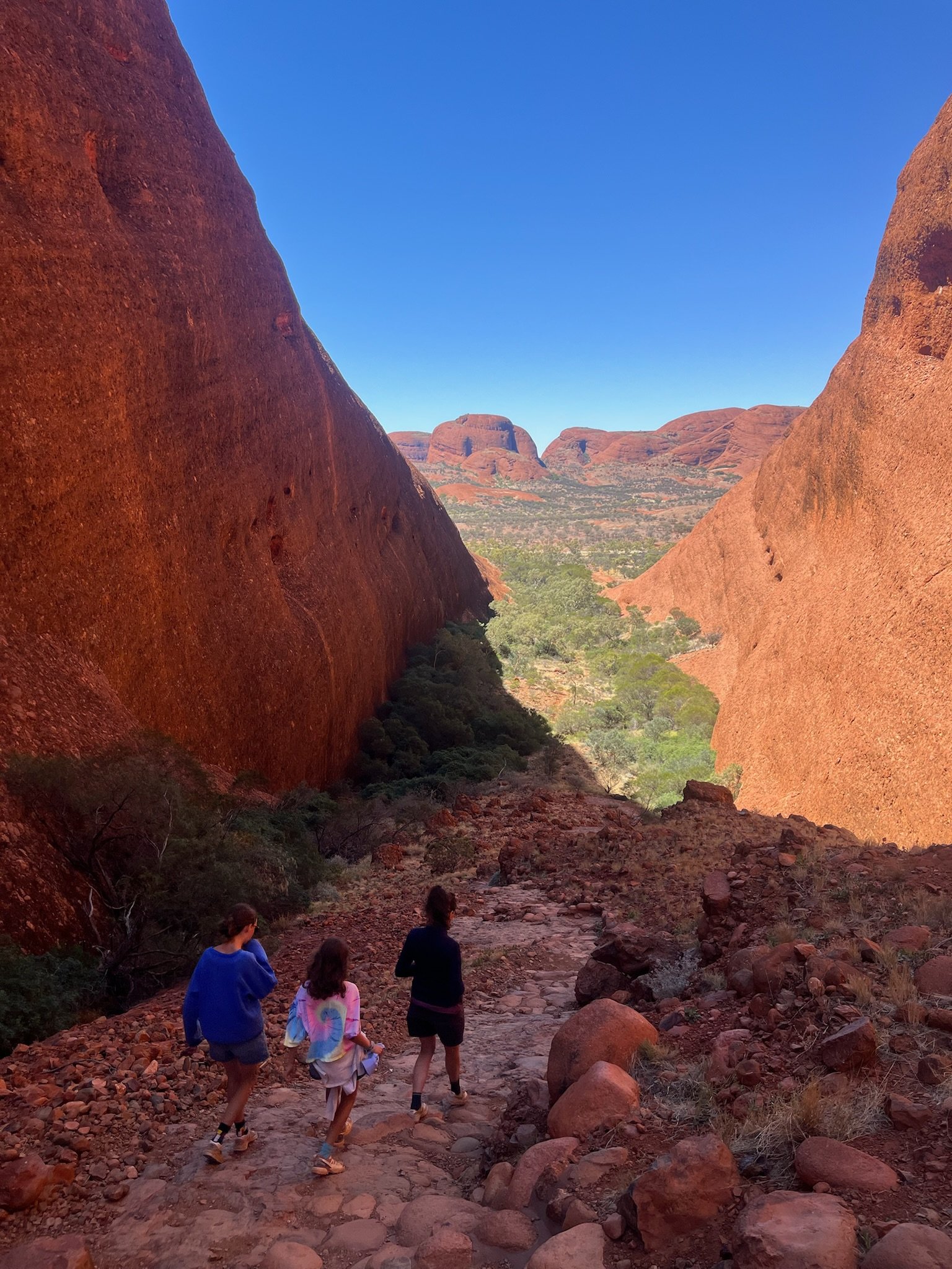 De volgende dag rijden we drie kwartier naar Kata Tjuta, de grotere, maar minder bekende broer van Uluru. Kata Tjuta (ook wel The Olga’s genoemd) betekent “vele hoofden” in de taal van de Anangu en zo ziet het er eigenlijk ook wel uit. Geen individuele berg, maar een soort op zichzelf staande rotsformatie, ontstaan in dezelfde periode als Uluru. De bekendste wandeling hier is de Valley Of The Winds en die is wat ons betreft een stuk indrukwekkender dan de vlakke loop rond Uluru. Het pad gaat op en neer en we mogen hier nog echt op de stenen klimmen (zoals dat tot in 2019 ook nog op Uluru mocht, trouwens). Het eerste deel is echt machtig tussen de metershoge rotswanden. Op de terugweg is het minder Valley Of The Winds en meer Plain Of The Flies, maar gelukkig struikelt er deze keer niemand over z’n broek en gaat het met Griet haar nek al een klein beetje beter, waardoor ze iets eleganter rond zich heen kan meppen. We rijden terug richting Uluru en in de namiddag is ‘t van souveniertjes kopen, homeschoolen en chillen. Robin verzamelt in een envelopje nog wat zand uit de woestijn en is een beetje teleurgesteld dat we niet nog 200 km verder naar het zuiden rijden, “want dan waren we eindelijk in South Australia en eens in een andere provincie!” Een beetje geduld, schat, die komt eraan; de outback hebben we na 14 dagen nu stilaan wel gezien. Tijd om het meest zuidelijke punt van deze 5-maanden reis achter ons te laten, terug te keren naar het noorden en vervolgens af te slaan naar rechts. Een andere provincie, ‘t zal wel zijn, Queensland, here we come!
