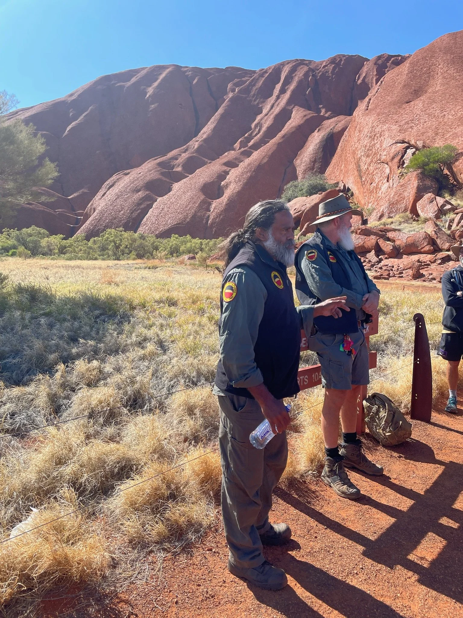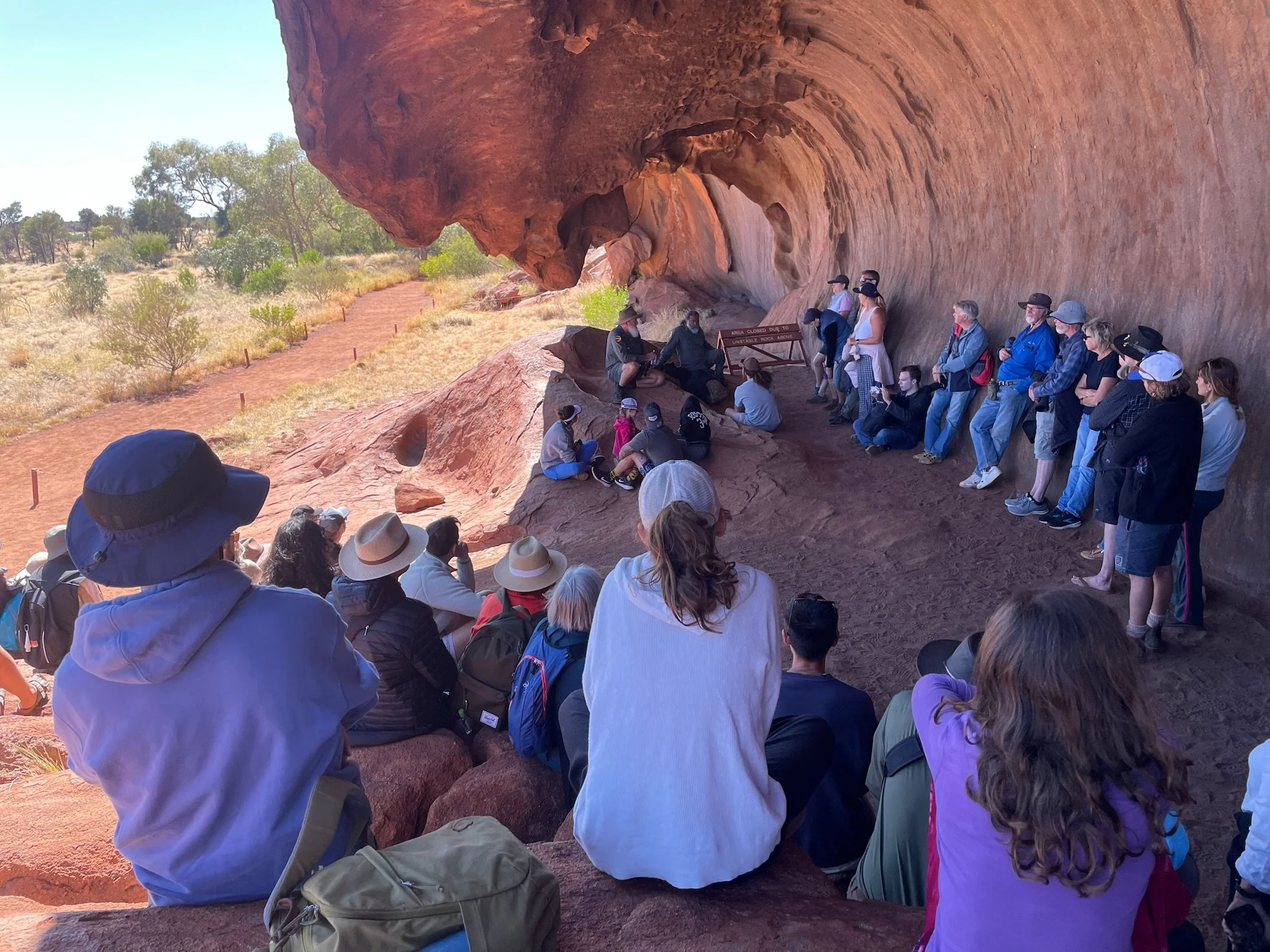 De volgende ochtend staan we vroeg op, want elke ochtend om 10u zijn er in heel Uluru twee gratis activiteiten: een gegidste wandeling en een typische woestijnfilm in de cinemazaal van het resort: Finding Nemo. Wij kiezen voor de eerste optie, tot groot onbegrip van Sam en Robin. De Mala-wandeling volgt de eerste 2 km rond de rots, voorbij een aantal belangrijke Aboriginal-sites. De uitleg wordt gegeven door twee park rangers, Keiran en James. James is een first nation’er en het is meteen ook de eerste keer in 3 weken dat we autochtone en niet-autochtone Australiërs gewoon iets tezamen zien doen. Zowaar, het kan! Keiran leeft al een hele tijd in Mutijulu, de Aboriginal community vlakbij Uluru. Dat dorp kan je niet zomaar bezoeken als toerist (en zelfs niet als “gewone” niet-autochtone Australiër), maar Keiran is gene gewone. Hij spreekt vlot Pitjantjatjara, het dialect van de gelijknamige “stam” en de traditional owners van Uluru, die zichzelf voor ‘t gemak “Anangu” (mensen) noemen. Hij voert tijdens de wandeling voornamelijk het woord (gelukkig voor ons gewoon in ‘t Engels) en James vult aan of verbetert waar nodig. We leren wat bij over de plantjes en de beestjes rond Uluru, maar ook en vooral over de traditionele mensen. ‘t Wordt al snel duidelijk dat dit allemaal heel recente geschiedenis is. James z’n grootmoeder vertelde hem nog verhalen over hoe ze hier - rond 1920 pas! - de eerste witte man zag (Uluru werd “ontdekt” in 1873, maar gedurende 50 jaar kwam er nagenoeg niemand). Tot de jaren ‘60 werd Uluru nog intensief gebruikt door de Anangu als schuilplaats of spirituele plek, vooral bij overgangsrituelen. Jongens werden/worden onderwezen in de jacht (de rotschilderingen zijn vaak niets anders dan een groot krijtbord) en gingen tientallen tot soms honderden kilometers op tocht, alvorens ze zichzelf een man mochten/mogen noemen. Verleden en heden lopen hier door mekaar, want aan alles wat James vertelt, voel je dat bepaalde tradities nog altijd leven. Al spelen ze zich niet langer in Uluru af; sinds de Land Rights-wetgeving uit de jaren ‘80 hebben de Anangu hun land weliswaar (deels) teruggekregen, maar ze beheren het nu samen met de Australische overheid, dus het blijft een toeristische plek. Hij vertelt het melancholisch, eerder dan verbitterd. ‘t Is wat het is en Australië is groot genoeg, “we have many other places to go to.”