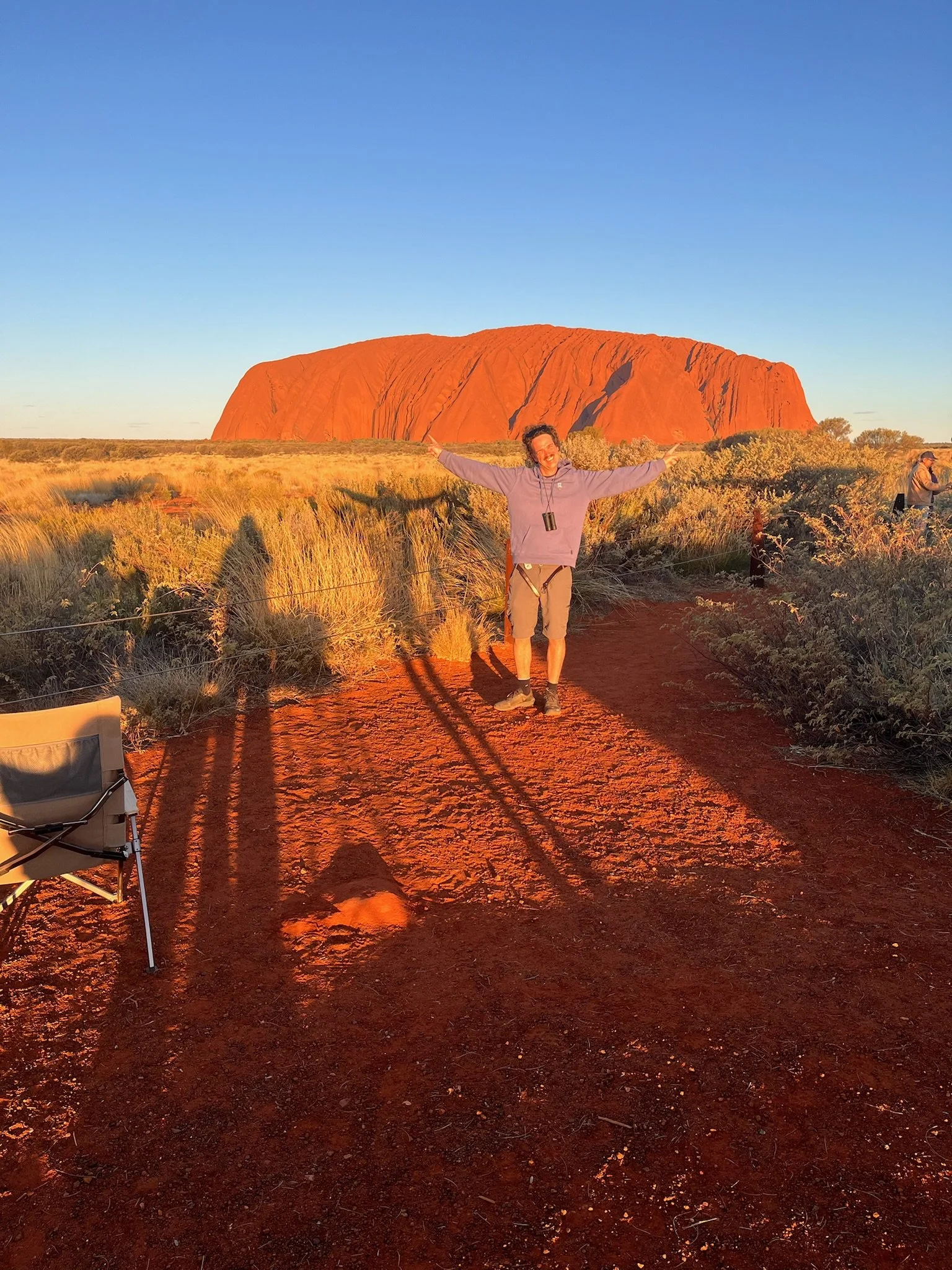 Tot daar onze epische entree. Robin is wat teleurgesteld, omdat ik haar in Alice Springs verteld heb dat de magie van Uluru ligt in ‘t feit dat het de enige berg is in een voor de rest helemaal plat landschap. “Er staat er gewoon nog een en ik vond die eigenlijk mooier, waarom is die niet bekend?” Goeie vraag. Blijkt dat Atilla op privé-terrein staat, dus dat zal er wel voor iets tussenzitten. Die rots was (als we het internet mogen geloven) ook veel minder heilig en belangrijk voor de Aboriginal people dan Uluru. En hoewel we Atilla dus niet van dichtbij gezien hebben en niet echt kunnen vergelijken, snap ik de magie van Uluru wel naarmate we dichterbij komen. Van ver lijkt hij misschien minder groots, maar als je dichterbij komt, wordt Uluru met de zachte vormen en rondingen plots een bijna organisch, levend ding. ‘t Is net zoals Karlu Karlu een overblijfsel van een gigantische bergketen van zo’n 500 miljoen jaar geleden, maar alsof dat nog niet genoeg is, heeft een botsing van 2 tectonische platen in een ver verleden er ook nog eens voor gezorgd dat deze rots bijna 90 graden gekanteld staat, waardoor je alle oude zandsteen-lagen als quasi verticale lijnen ziet. Alsof iemand een immense steen laagje per laagje ge-3D-print heeft, vervolgens heeft plat gelegd en er dan tonnen zand heeft rond gestrooid. We zien immers enkel het topje van de rots, onder de grond loopt Uluru nog kilometers diep door. Boven de grond meet The Rock (zoals ze’m hier ook wel eens noemen) 384m. Net hoger dan de Eiffeltoren. Daardoor is Robin uiteindelijk toch overtuigd, ‘t is goed, we mogen blijven.