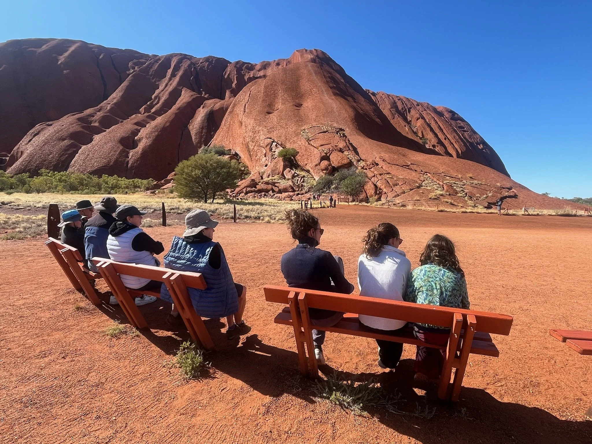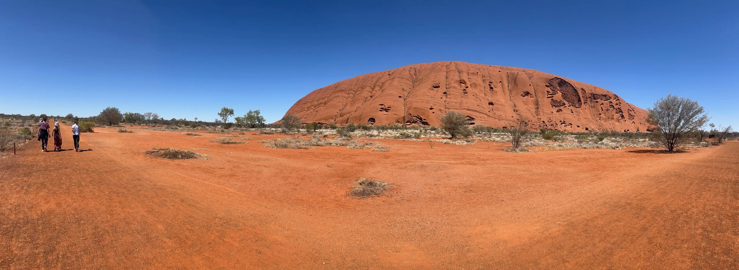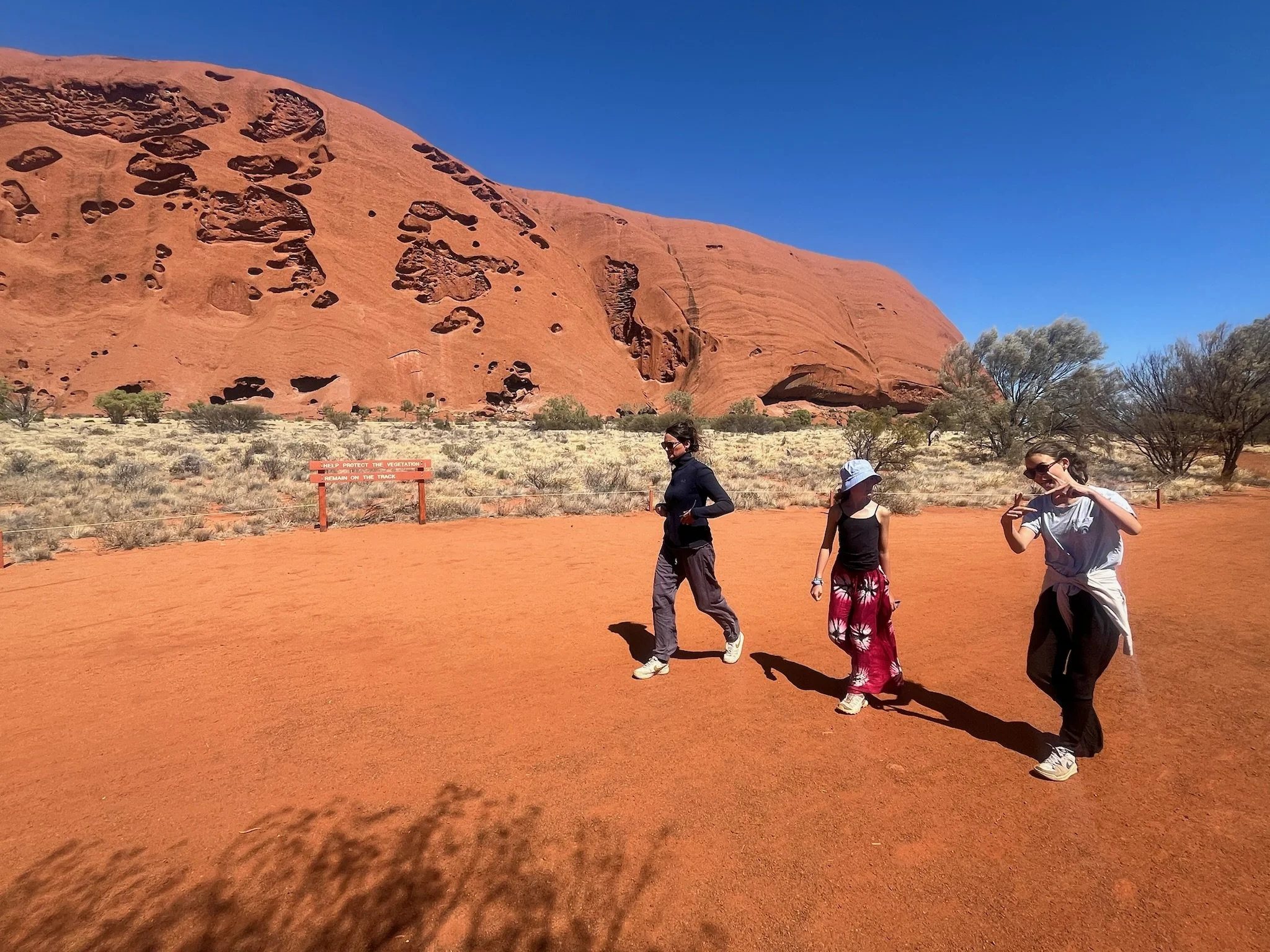 “Dit is echt een heel saaie wandeling.” Keiran en James zijn op dreef en gaan nog een hele tijd verder, maar Sam en Robin hebben het na anderhalf uur wel gehad met al die uitleg. Genoeg daarover dus, over 3 weken zijn we hier weg en moeten ze ‘t hier zelf maar oplossen. We verlaten de gegidste wandeling iets vroeger en lopen verder op eigen tempo, 10 km, helemaal rond Uluru. Van dichtbij ziet het er al even indrukwekkend uit en ook totaal anders dan van ver. “Hebben we dit stuk gisteren gezien bij de sunset of was het nu daar?” Na de middag worden de bushflies assertiever en moeten we ze de hele tijd van ons gezicht slaan. Dat lukt bij Griet maar moeizaam, want ze heeft al een paar dagen een stijve nek. Loopt ze daar dus rond, in het midden van de woestijn, met 3 laagjes kleren boven mekaar, een walm van tijgerbalsem, een sjaaltje en een trui met een warme kraag, vloekend op die vurte vliegen. De kinderen besluiten ter afwisseling de tweede helft van de wandeling al joggend af te leggen. Dat lukt 200 meter, tot Robin over haar broek struikelt. Dat is niet de eerste keer en we hebben al veel gelachen met de kreet “Mijn broek!” (nochtans vakkundig ingekort in Rammang Rammang), maar deze keer is het serieuzer met als gevolg een stevig geschaafde elleboog. Griet offert een van haar laagjes op als tijdelijk verband, want “iieeeeuw, die vieze vliegen komen nu allemaal naar daar!” De laatste 2 km trekken Sam en Robin hun trui over hun hoofd om er aan te ontsnappen (“en ze komen godverdomme door dat ene spleetje zelfs nog op uw ogen zitten!”), dus we zijn quite a sight als we de wandeling na een uur of drie voltooien. Laten we zeggen dat Uluru blij is dat ze ons gezien heeft.